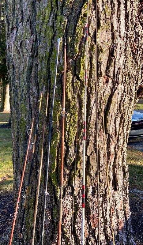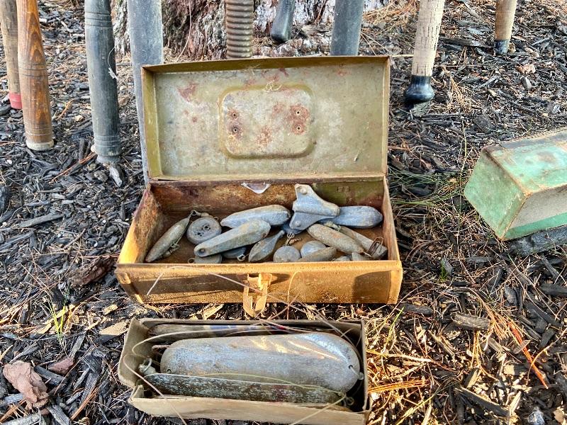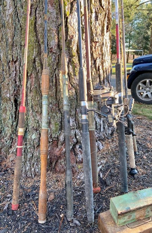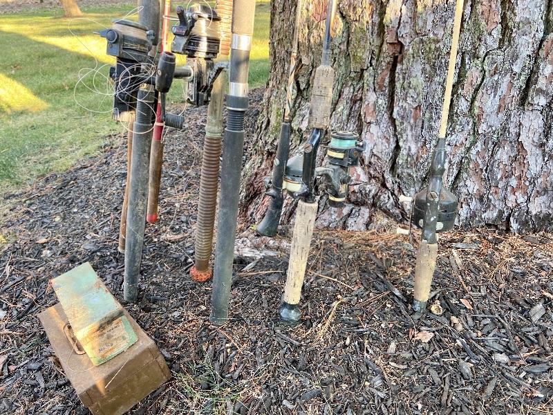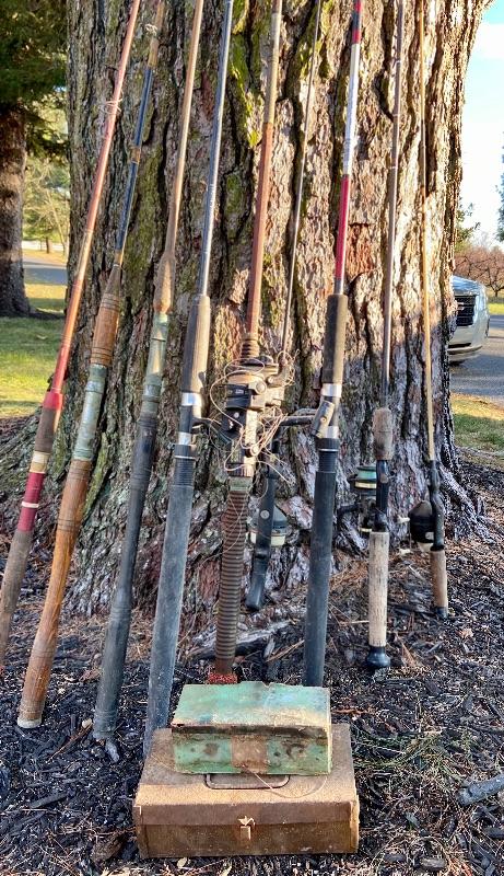10 vintage fishing rods including Cardina, Quickfire, and more. Sizes range form 65-72 inches tall. Small tin fishing box of sinkers, spinners. 2 rods are broken. MM Please see all pictures for content of the lot, condition of the lot, and measurements if taken. Pictures are the best representation of the items listed and items are untested unless indicated in description. Thank you for looking and have fun bidding!