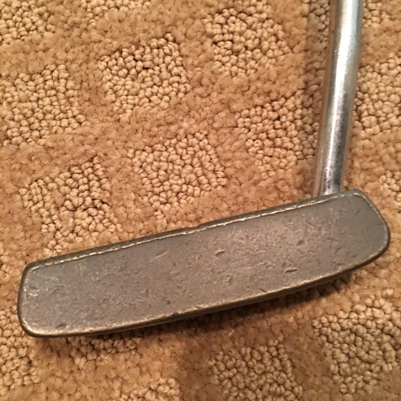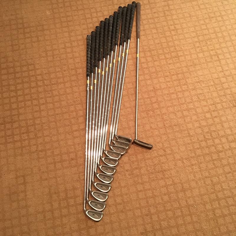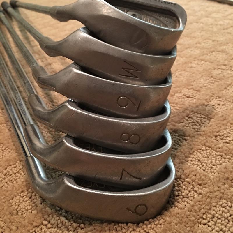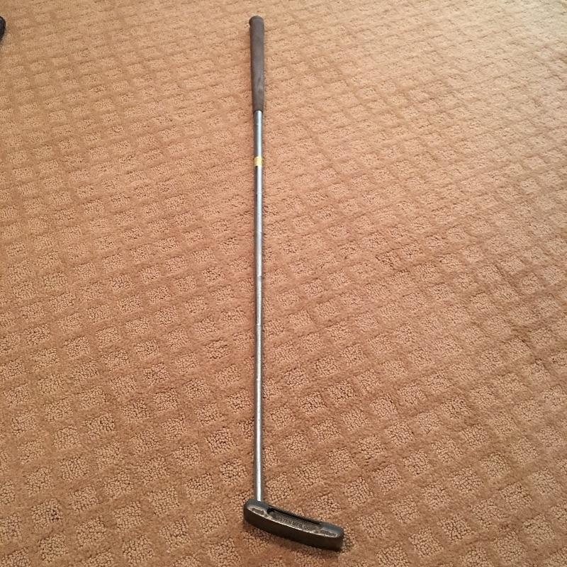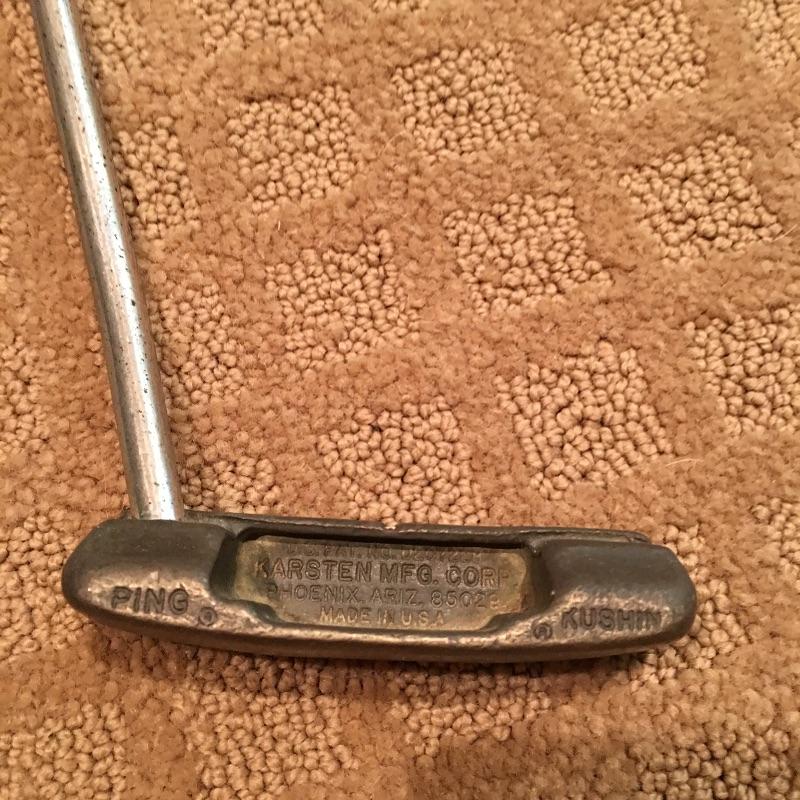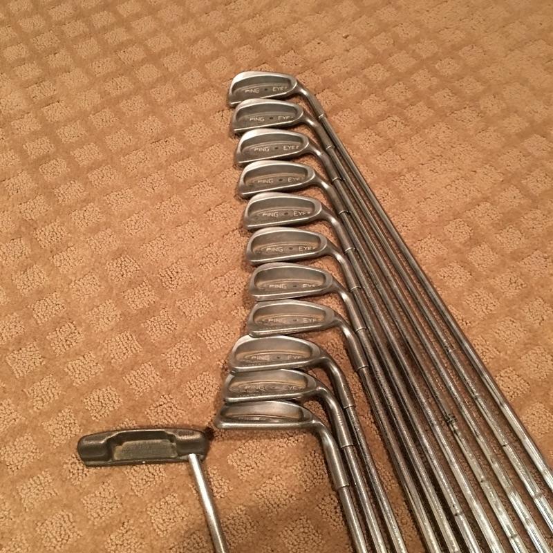 Vintage Ping Eye 2 irons 1-9 with sand and wedge also included is a rare Ping Karsten Kushin putter. Putter measures 36” long. Longest iron measures 41.5” long and shortest iron measures 37” long.