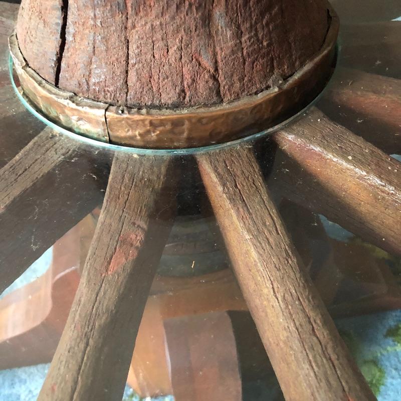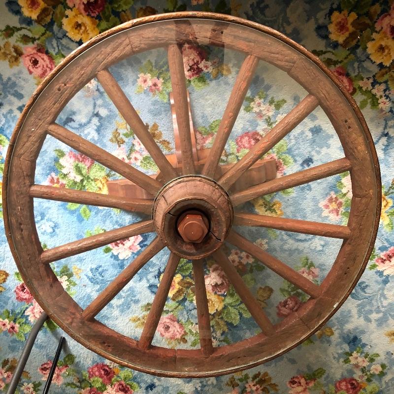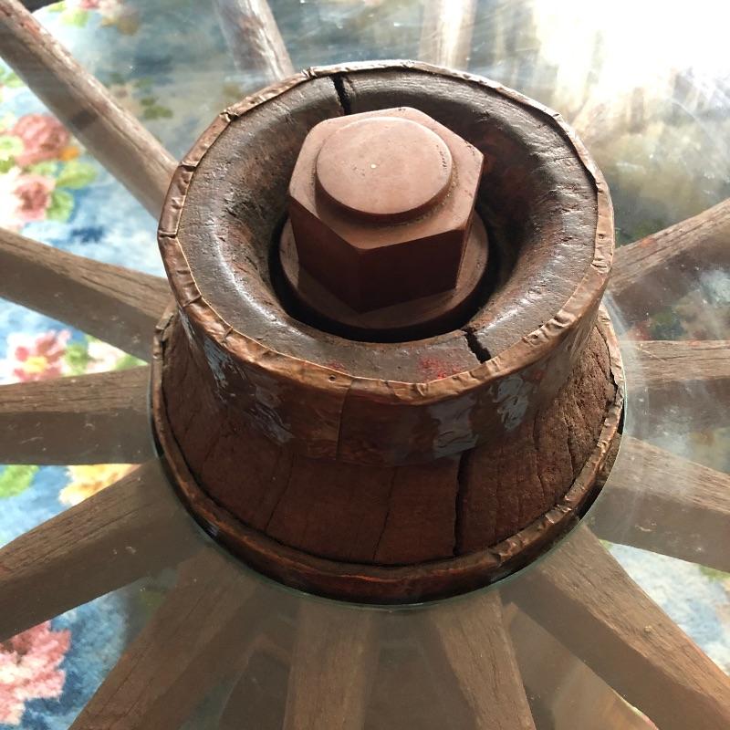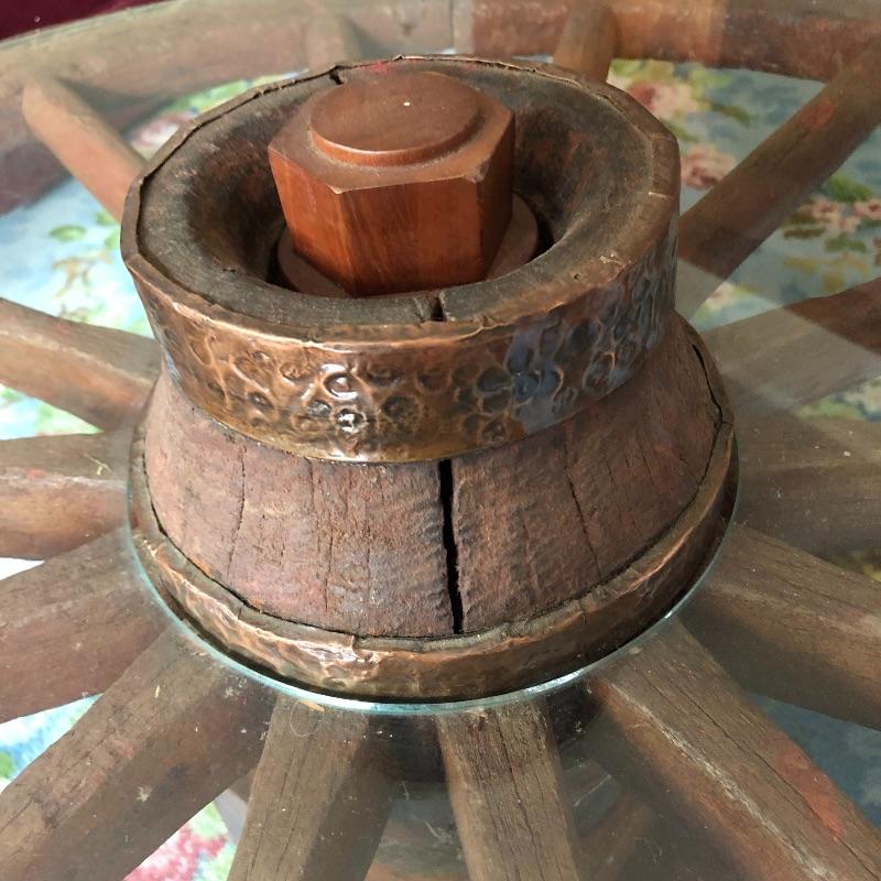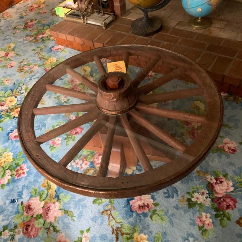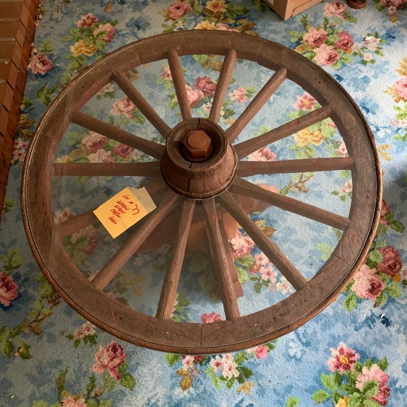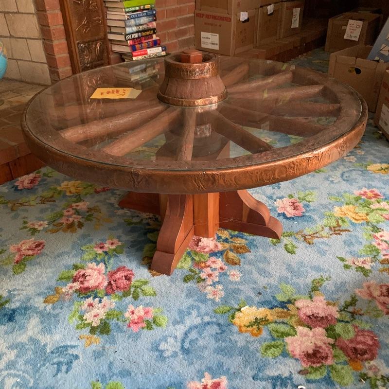 This unique coffee table boasts fourteen spokes and a metal edge on the wheel. It appears to be an authentic wagon wheel mounted on a sturdy table base with four feet. The glass top lifts up for cleaning. The table measures approximately 38” in diameter and is approximately 17.5” tall to the rim of the wheel. The center of the wheel is 6.5” in diameter. It is heavy; bring help to load please. Local pick up only.