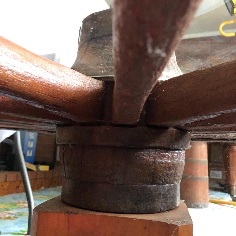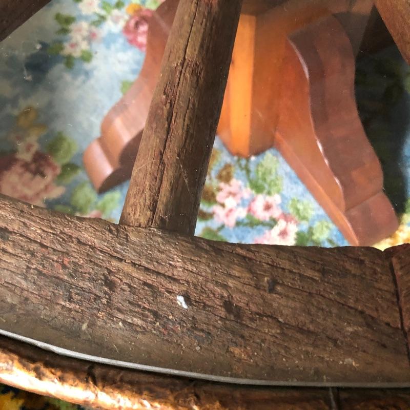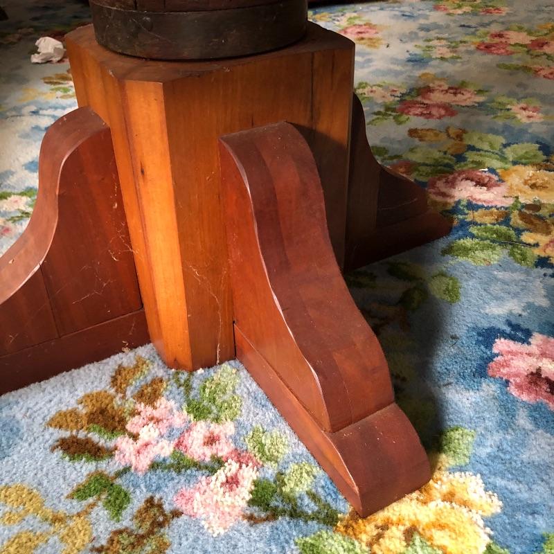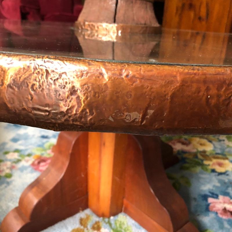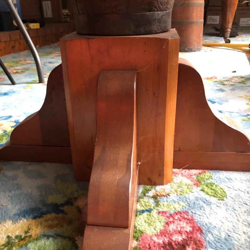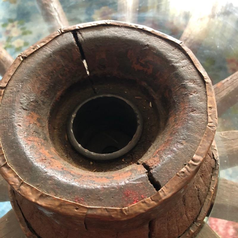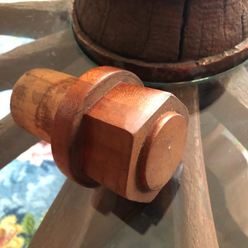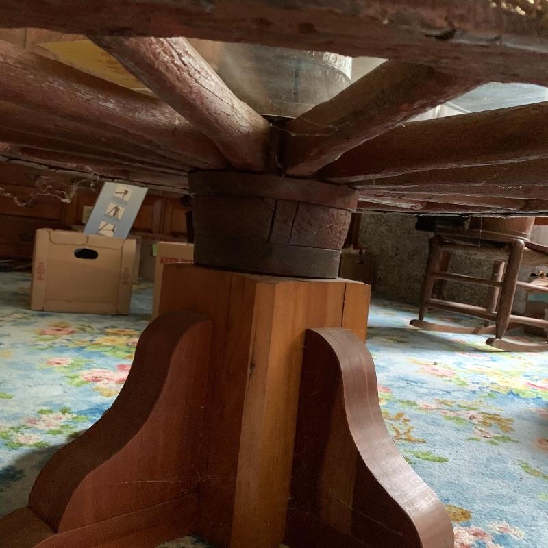 This unique coffee table boasts fourteen spokes and a metal edge on the wheel. It appears to be an authentic wagon wheel mounted on a sturdy table base with four feet. The glass top lifts up for cleaning. The table measures approximately 38” in diameter and is approximately 17.5” tall to the rim of the wheel. The center of the wheel is 6.5” in diameter. It is heavy; bring help to load please. Local pick up only.