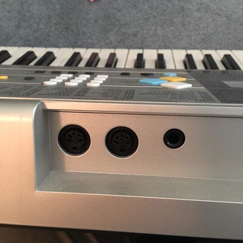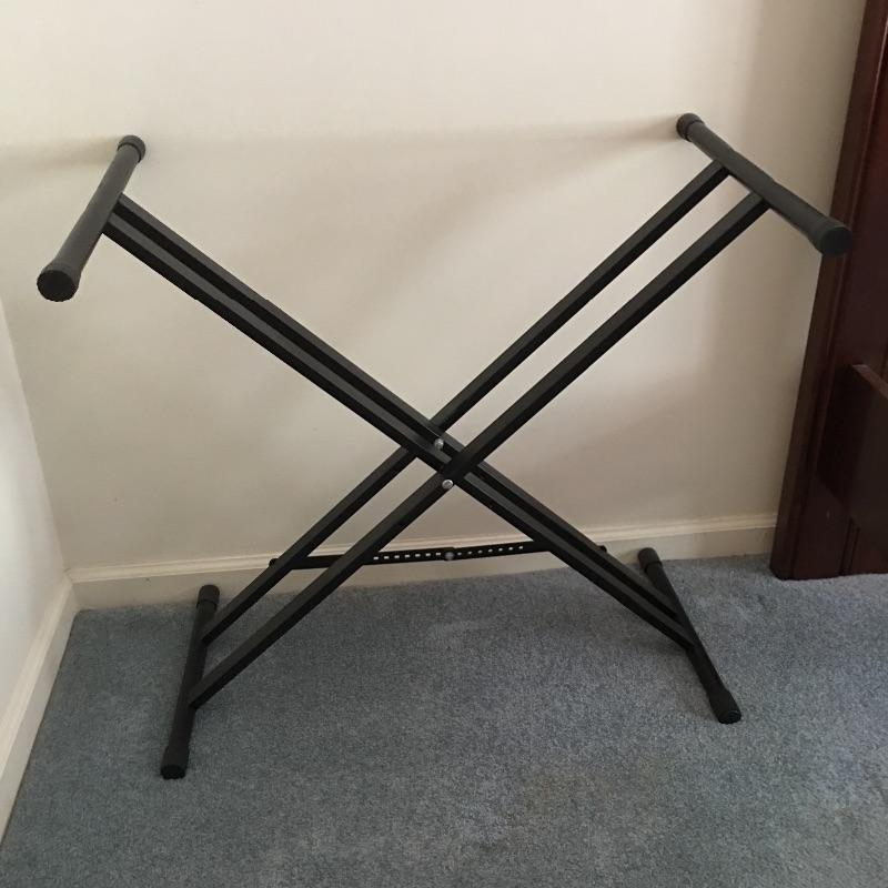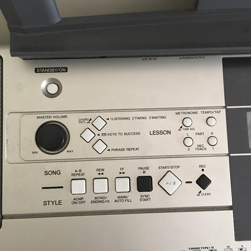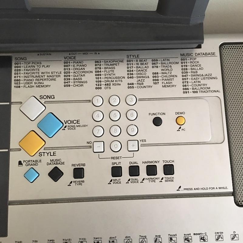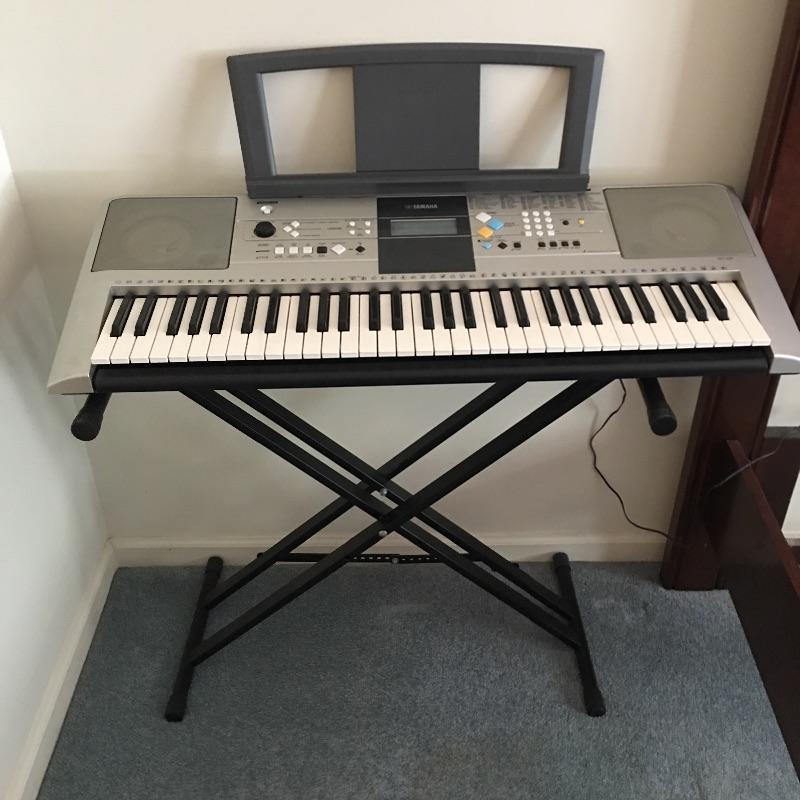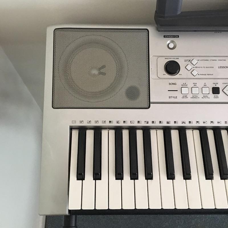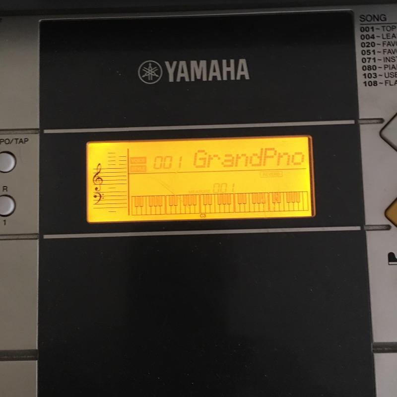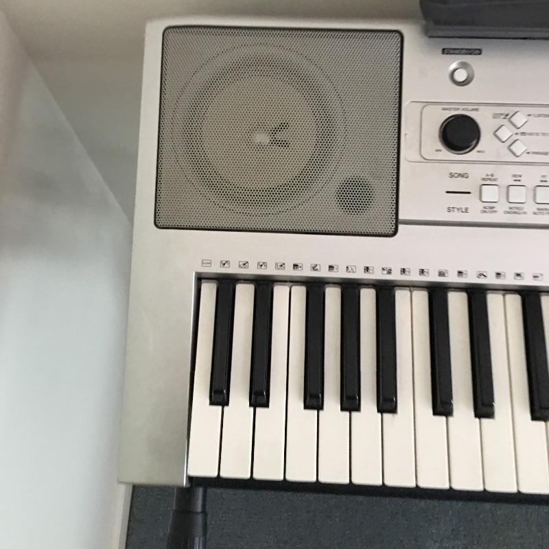 Yamaha Keyboard with fold-able stand. Play your music without taking up much space with this nice keyboard that is light enough for easy transport. Keyboard measures 14” x 37” x 4.5”. Keyboard with stand measures 18” x 37” x 32”. See images for all the things this piece can play. Item turned on and appears to be in working order.