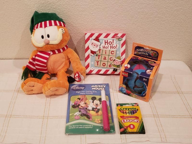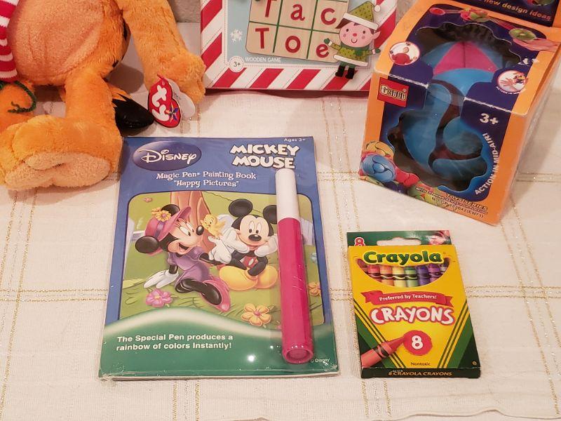 Lot 770:  NEW Gift Lot (Game, Plushie, Activity Pad, Crayons, Toy)