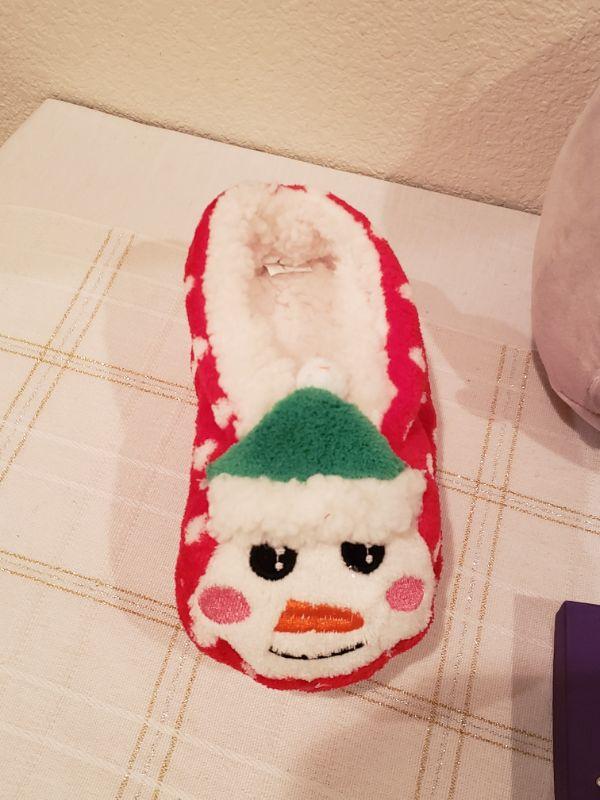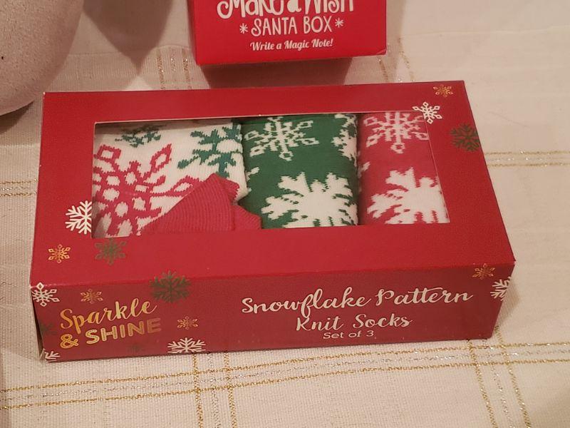 Lot 772: New Snowman Slippers, (3) Snowman Charms, Snowflake Socks, Santa Wish Box, Cat Plushie
