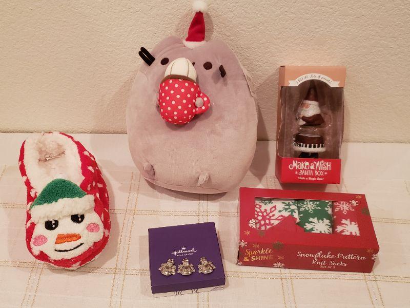 Lot 772:  New Snowman Slippers, (3) Snowman Charms, Snowflake Socks, Santa Wish Box, Cat Plushie