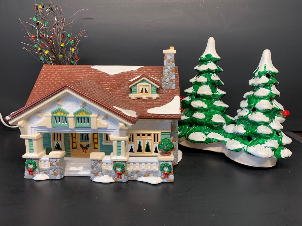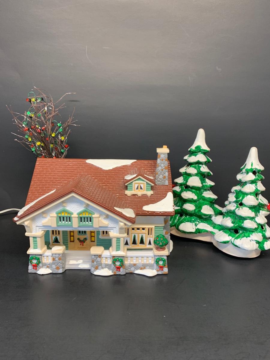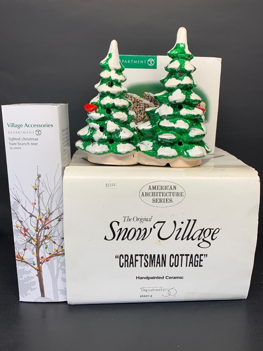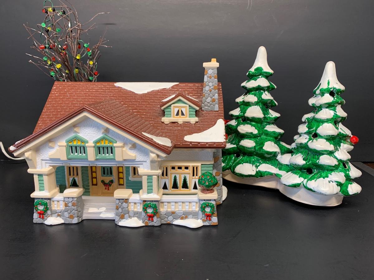 LOT 63RP: Dept. 56: Craftsman Cottage, Vintage Ceramic Trees, Stone Fence & More