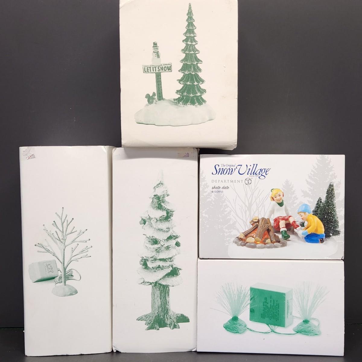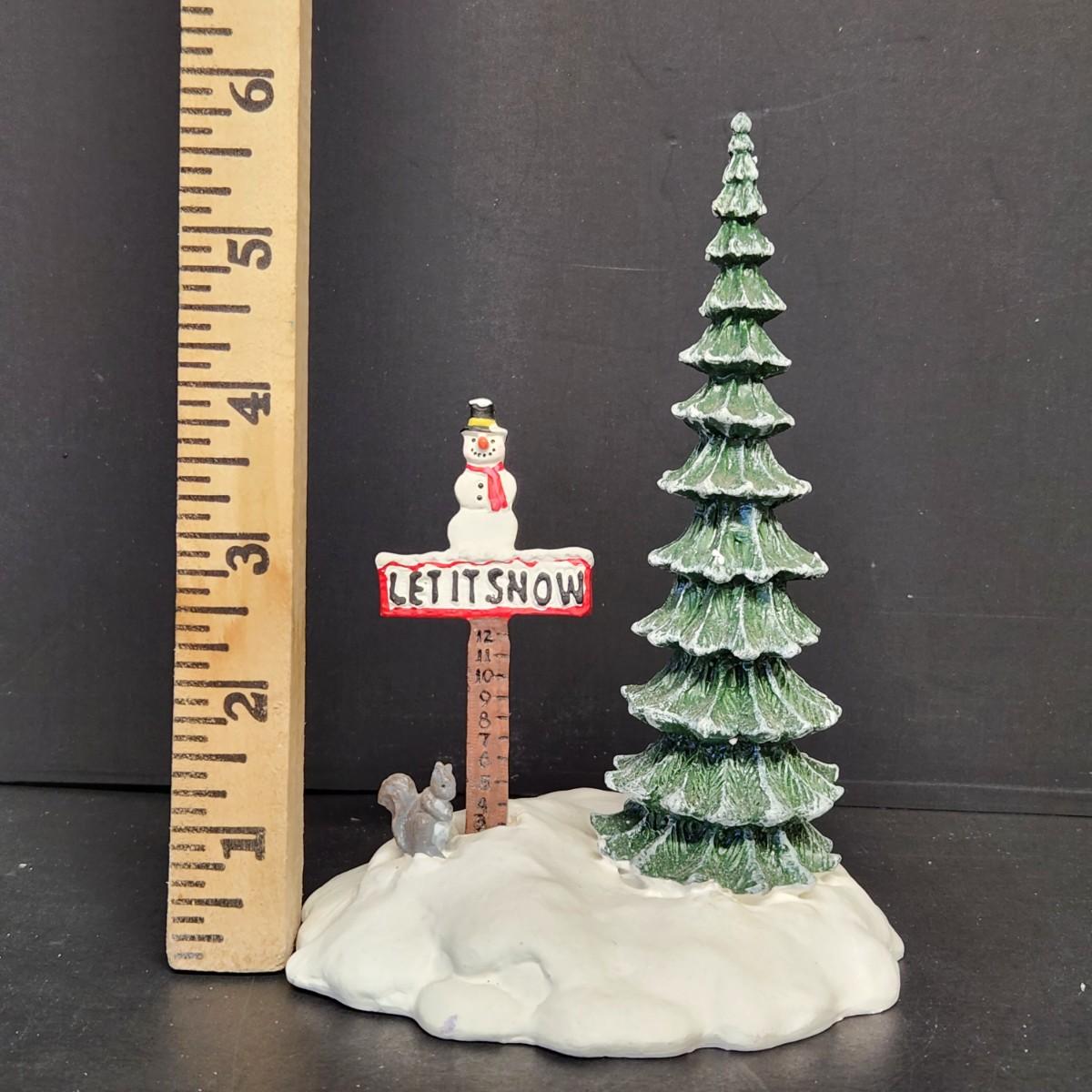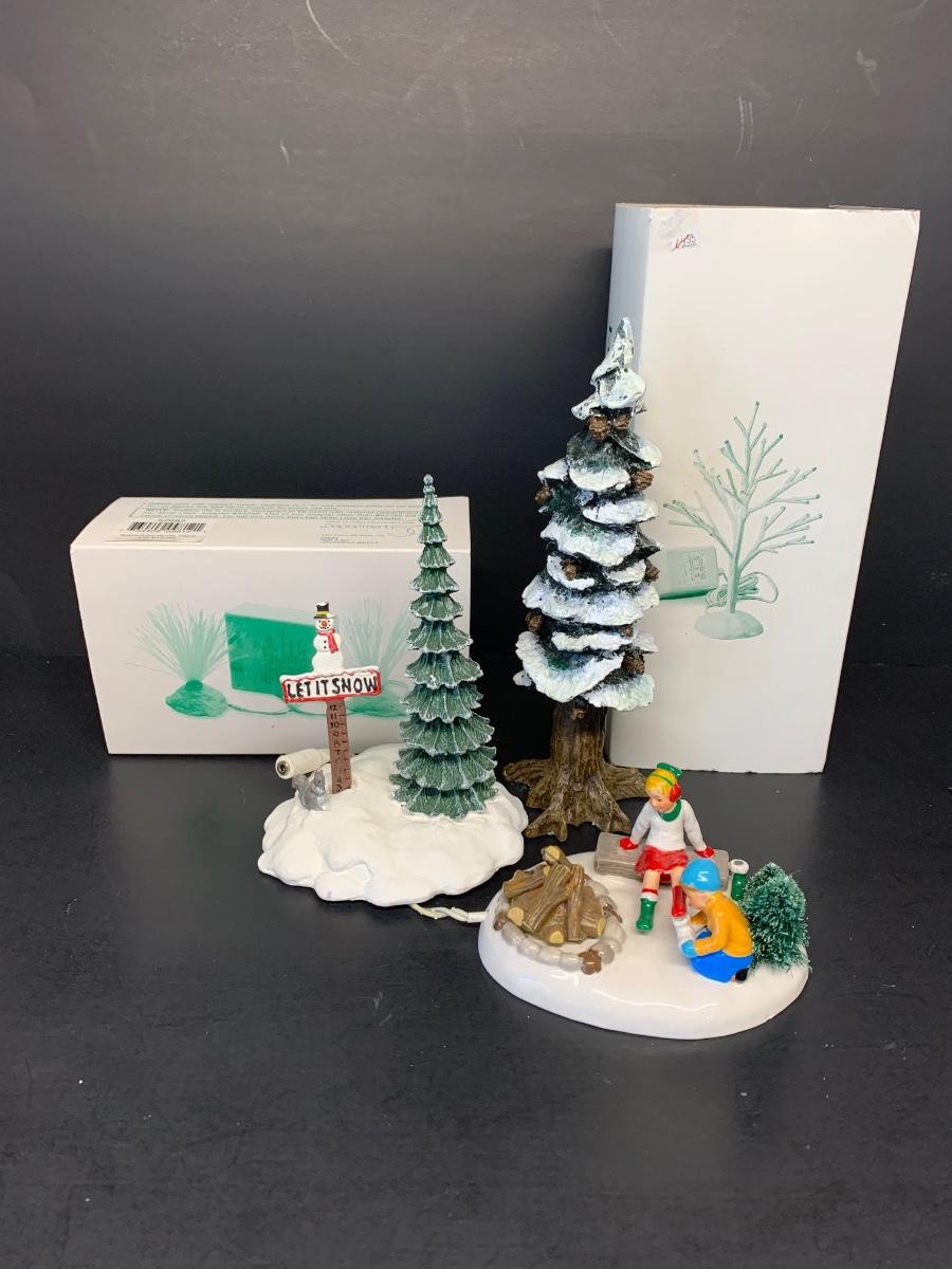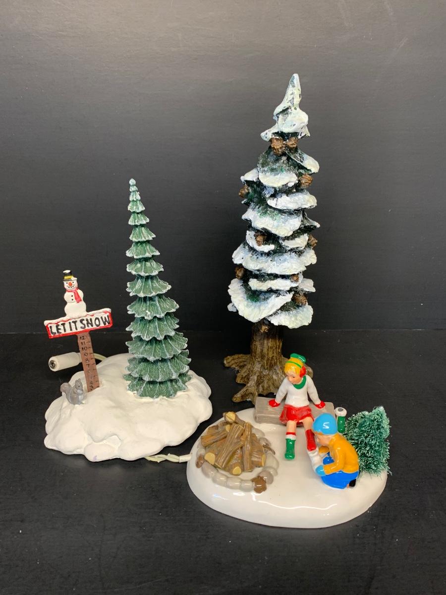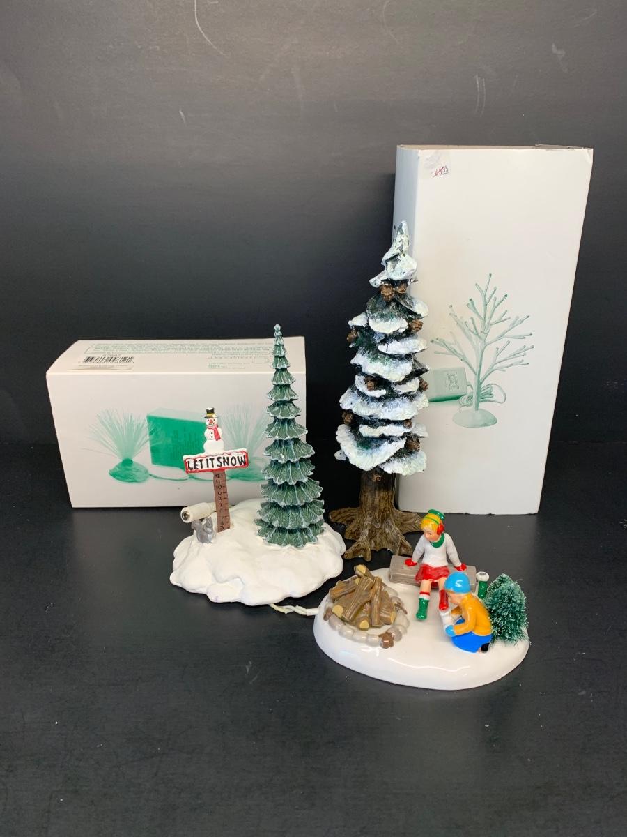 LOT 67RP: Dept. 56: Skate Date, "Let It Snow" Snowman Sign, Pole Pine Tree & More