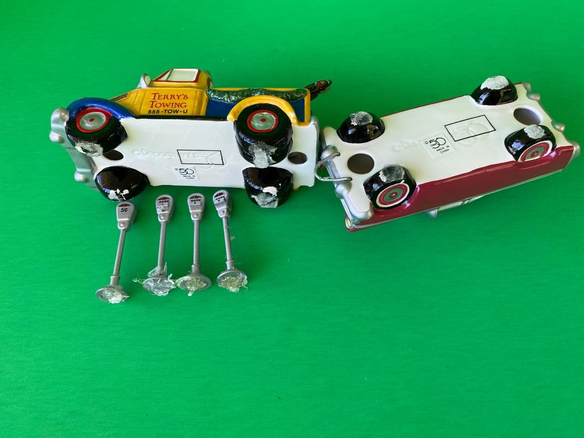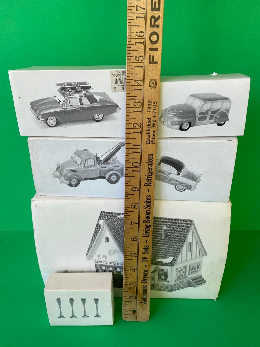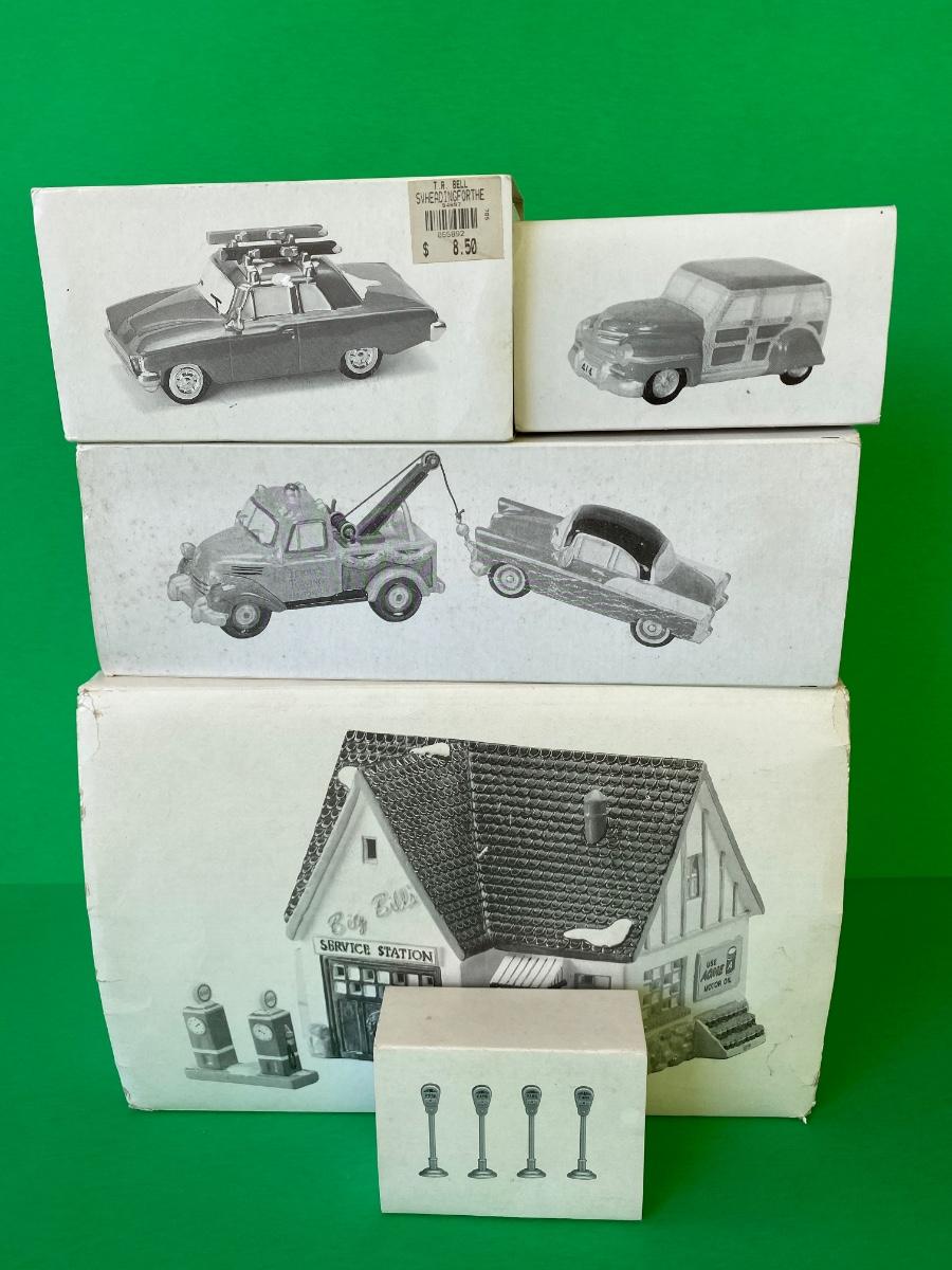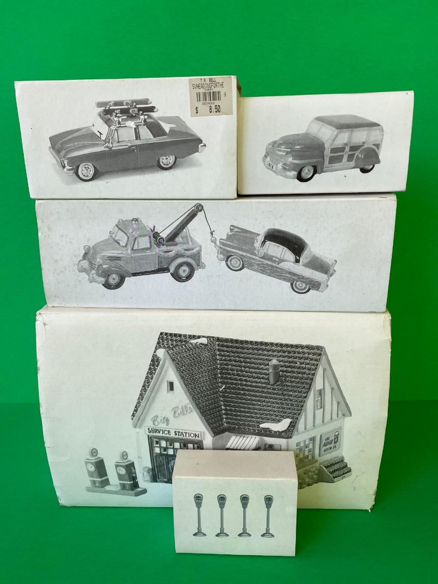 Department 56 Service station, Acme Motor oil, Terry’s Towing, cars and parking meters. Some items have hot glue on the bottoms as shown in pictures.