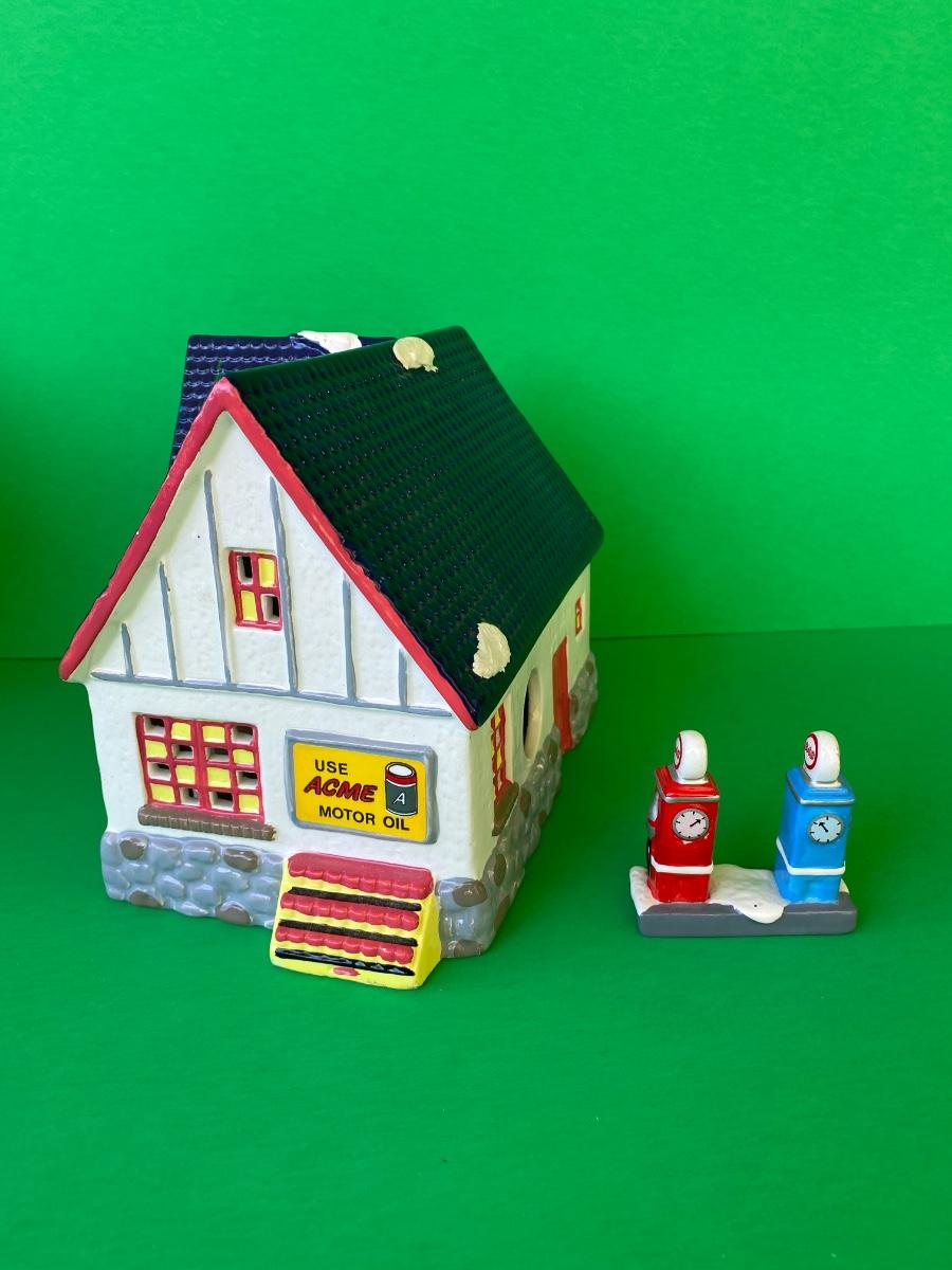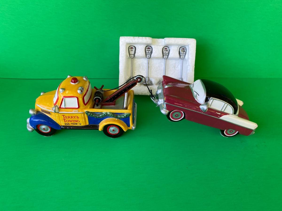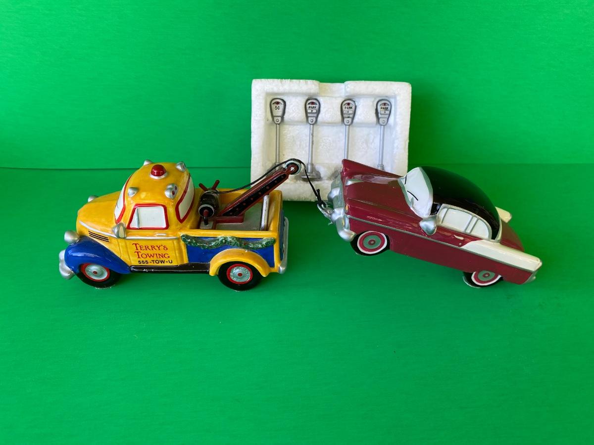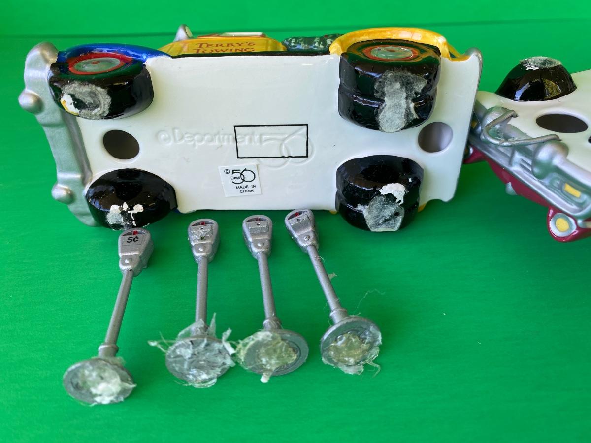 Department 56 Service station, Acme Motor oil, Terry’s Towing, cars and parking meters. Some items have hot glue on the bottoms as shown in pictures.