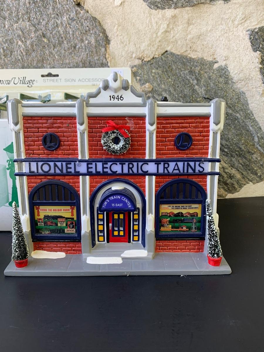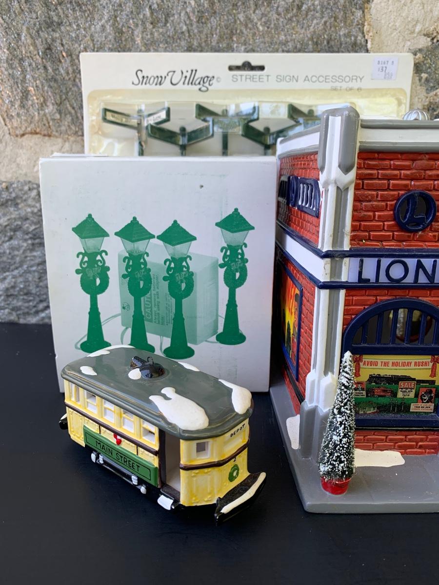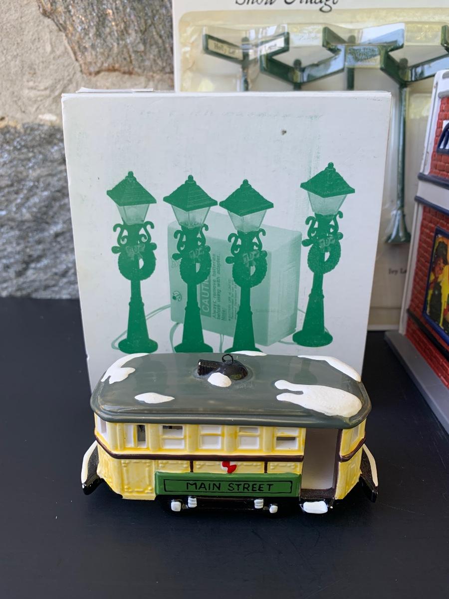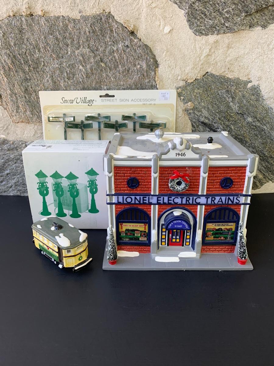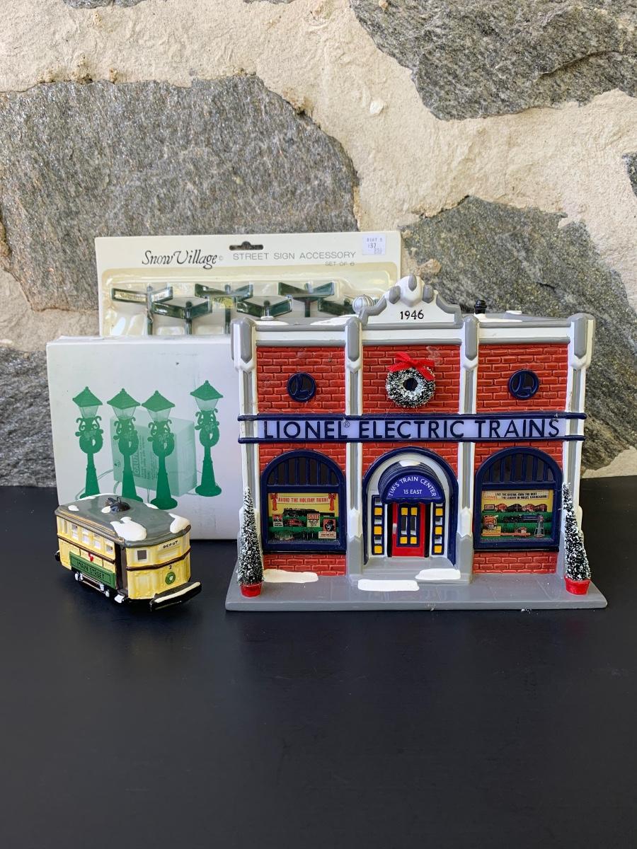 LOT 104R: Dept 56 Lionel Train Center, Turn of the Century Lampposts, Street Signs & Street Car Ornament