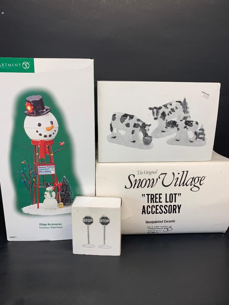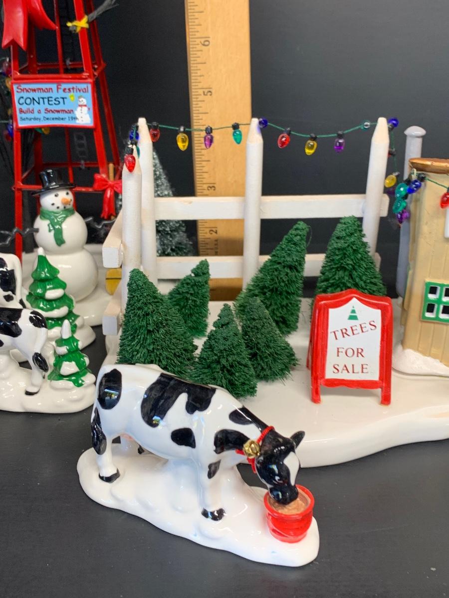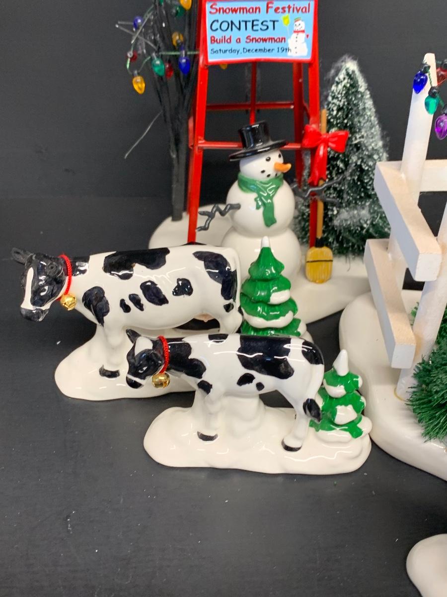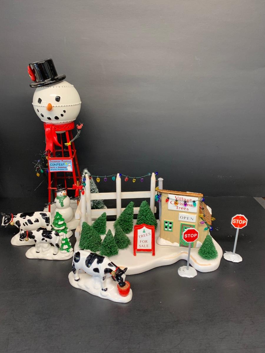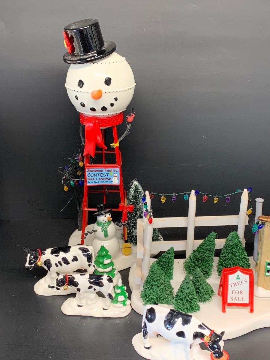 LOT 128RP: Dept. 56: Snowman Water Tower, Herd of Holiday Heifers, & More