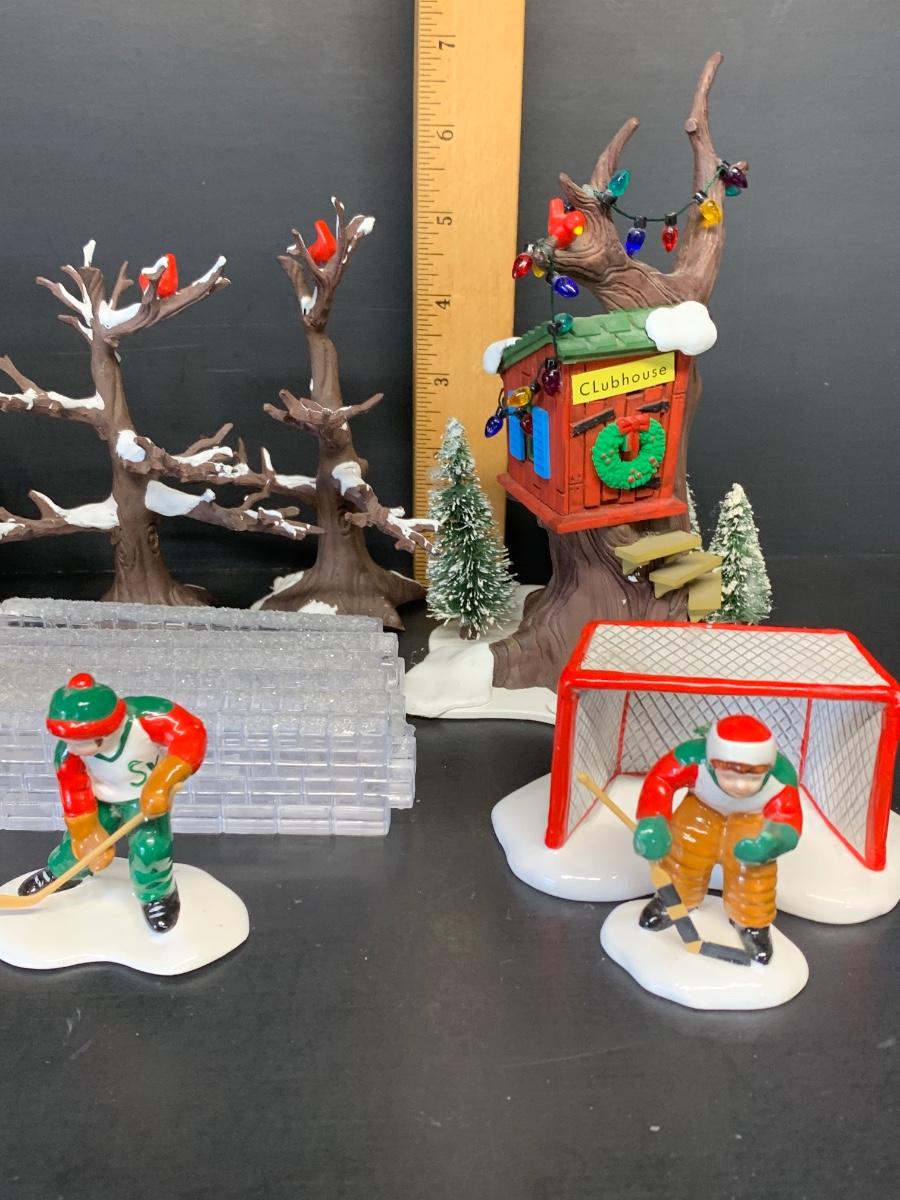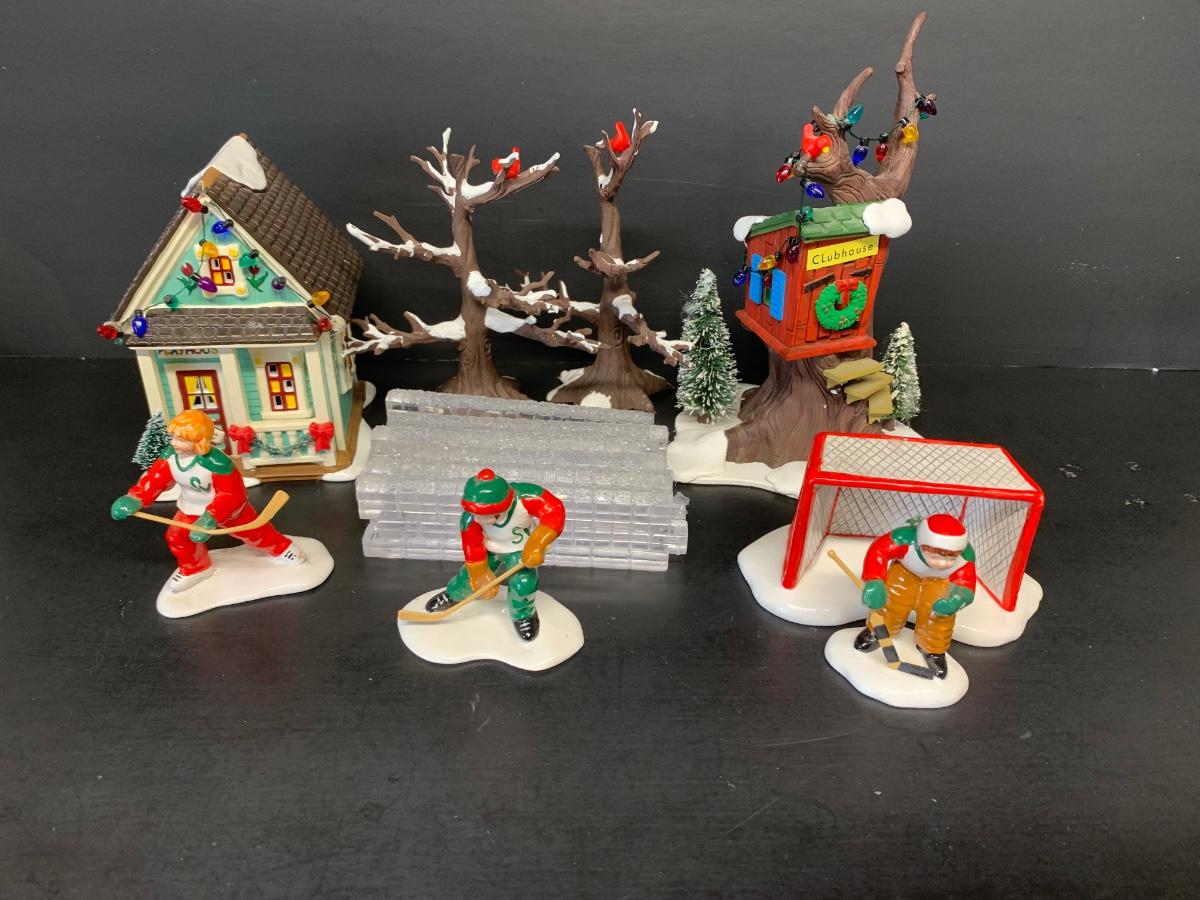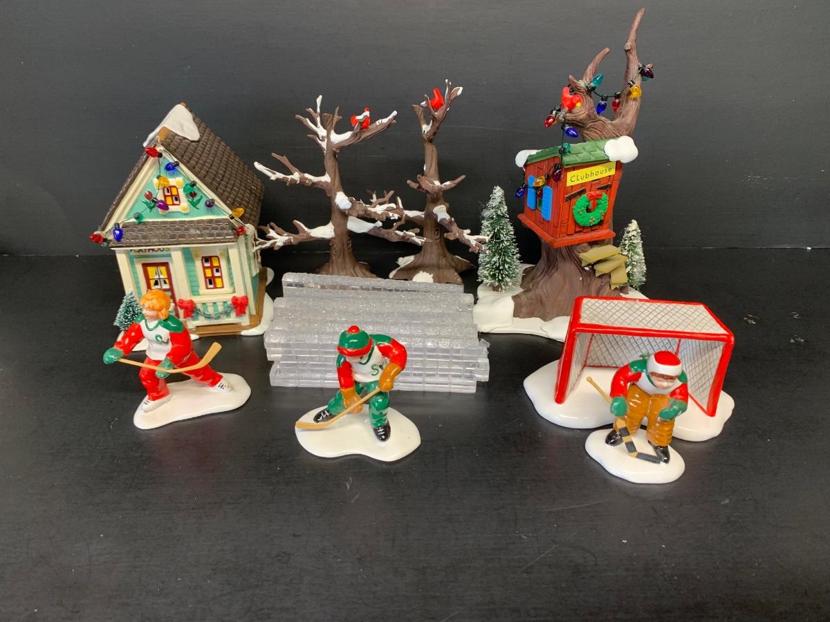 LOT 148R: Dept 56 Club House & Trees, Let's Play House, Ice Crystal Wall & Cold Weather Sports