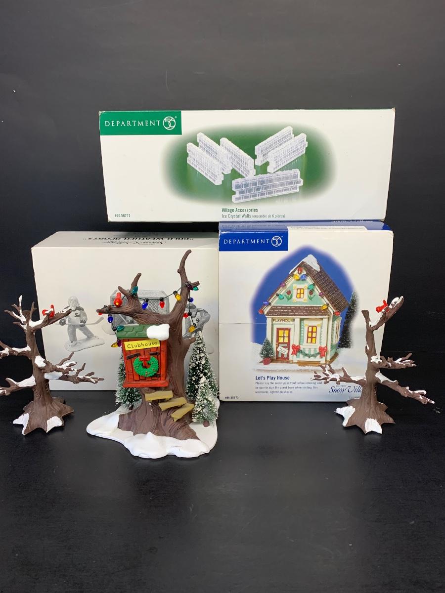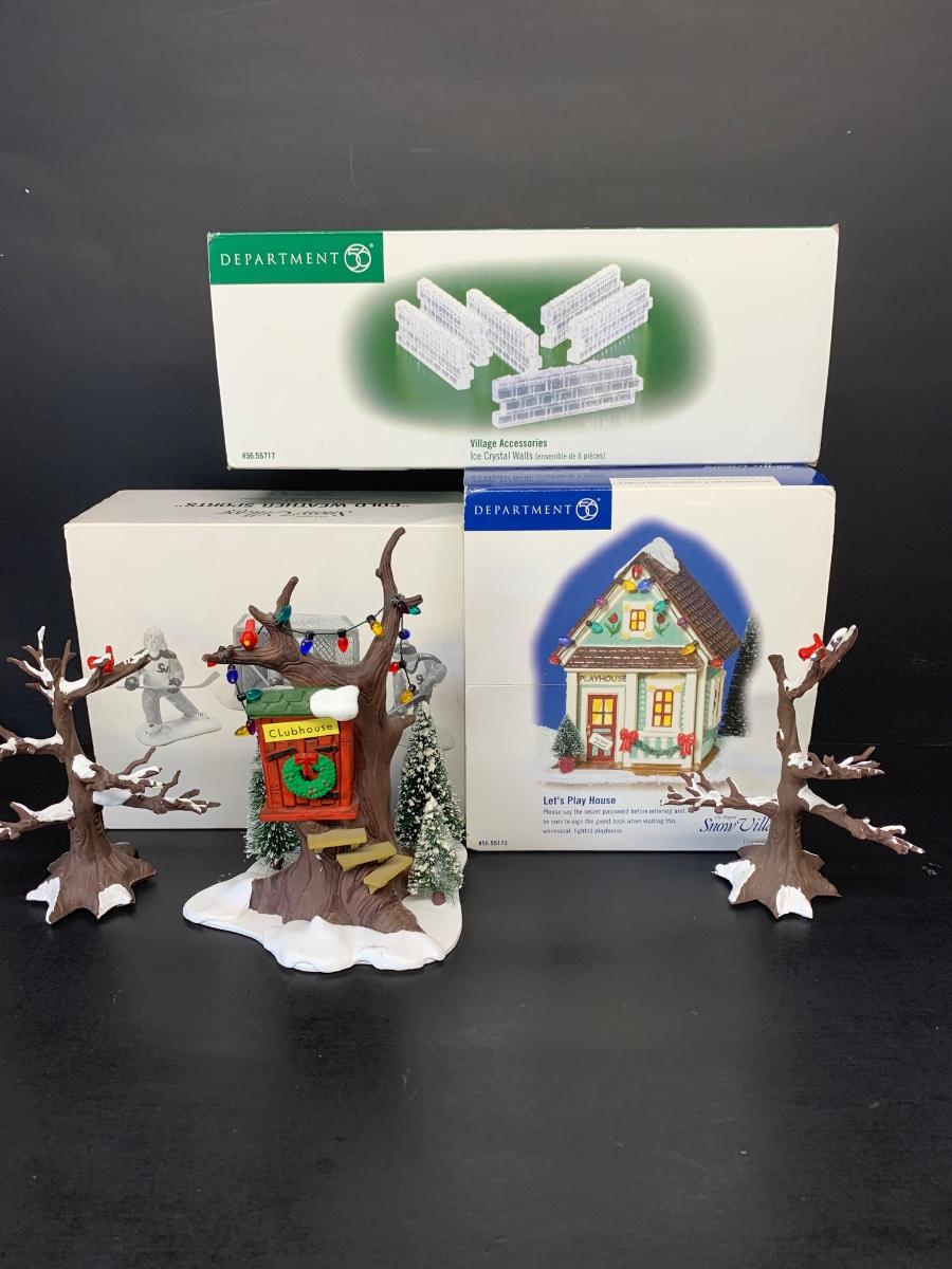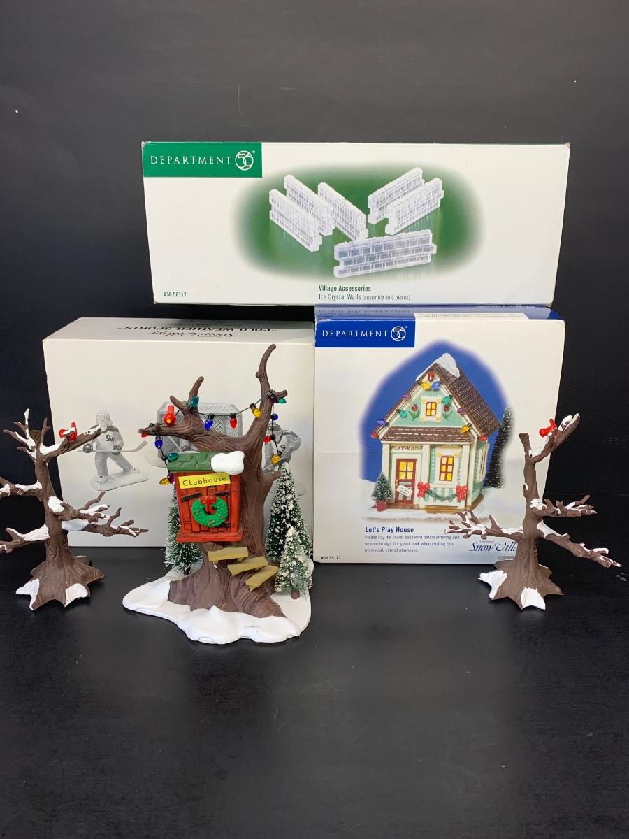 LOT 148R:  Dept 56  Club House & Trees, Let's Play House, Ice Crystal Wall & Cold Weather Sports