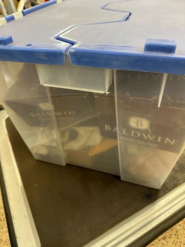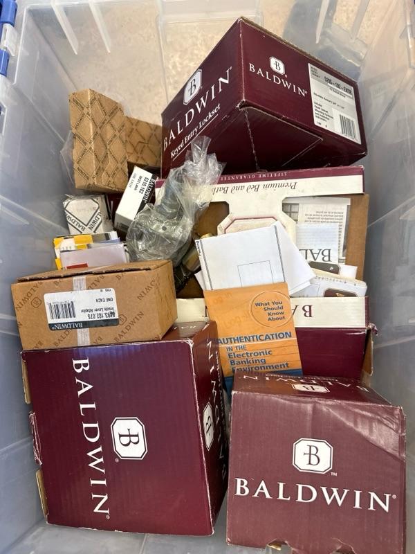 Baldwin, lock parts and plastic tote