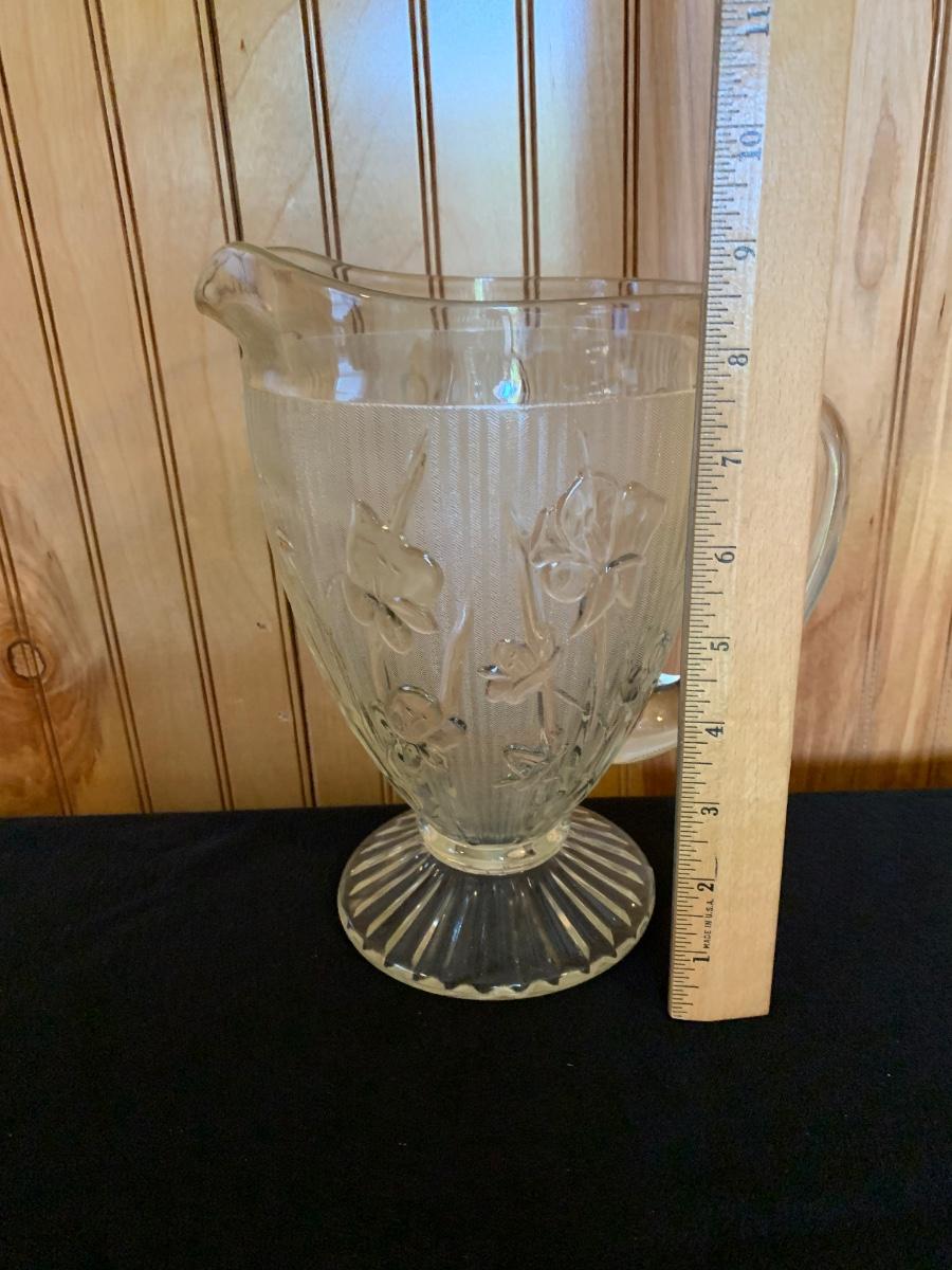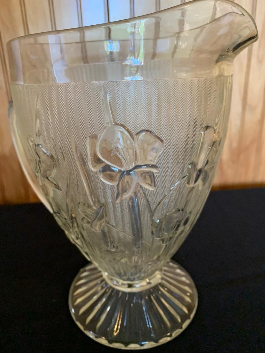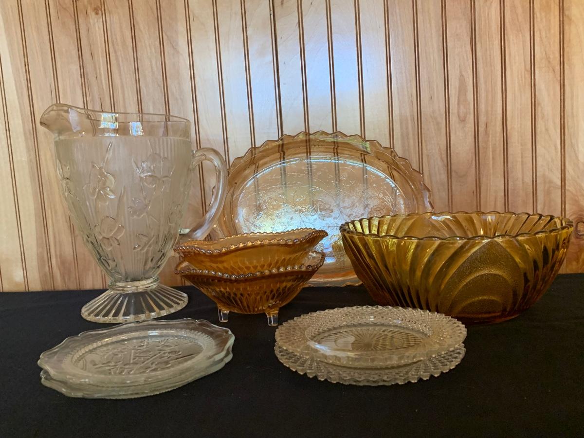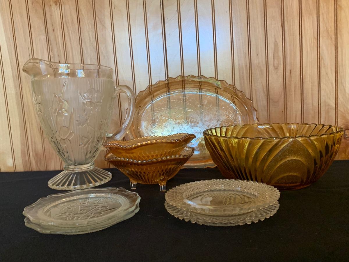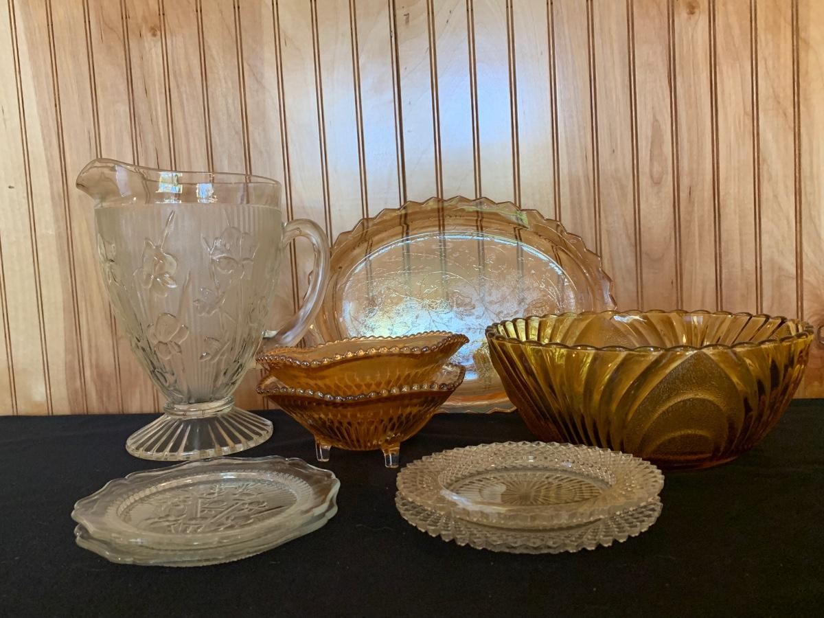 LOT Vintage Depression Glass Iris & Herringbone Footed Water Pitcher, Depression Sherbert Plates, & Carnival Glass Footed Bowl & More