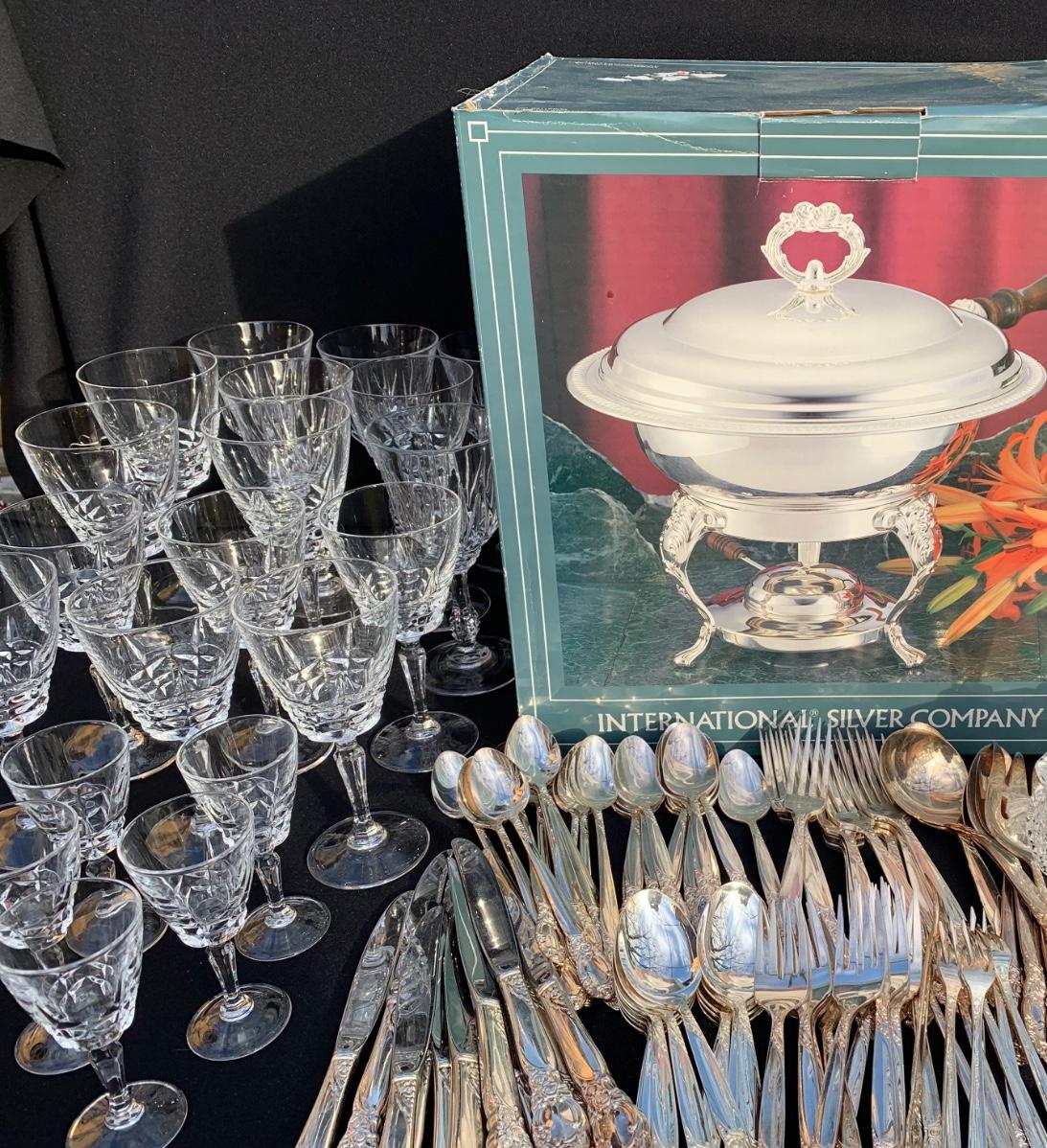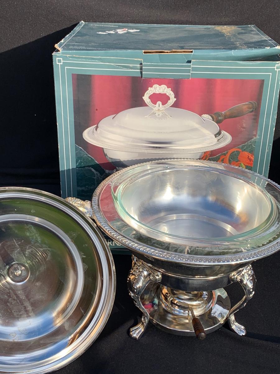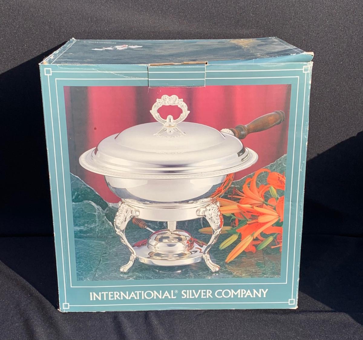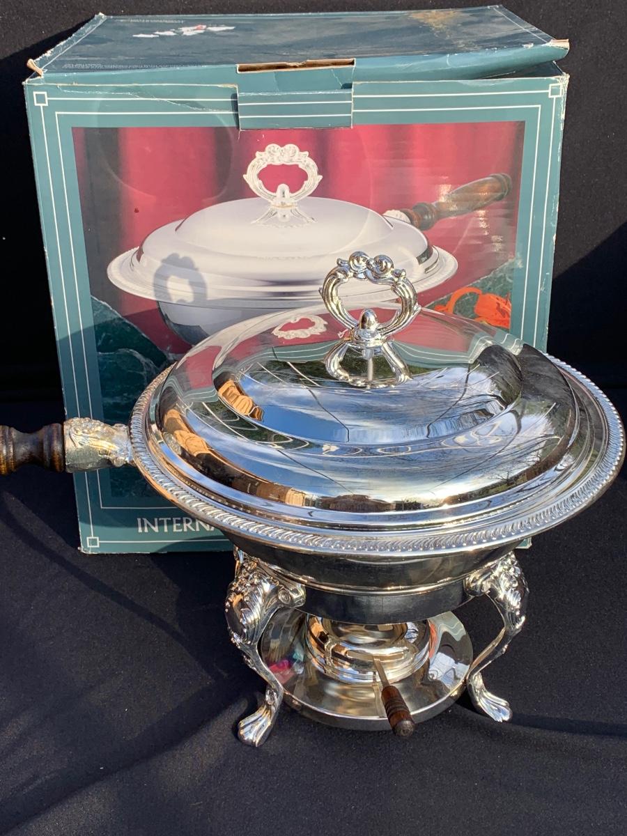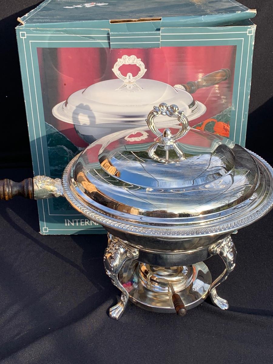 LOT 38R: Oneida Flatware, International Silver Co. 2qt Silver-plated Chafing Dish w/Sterno Holder & More