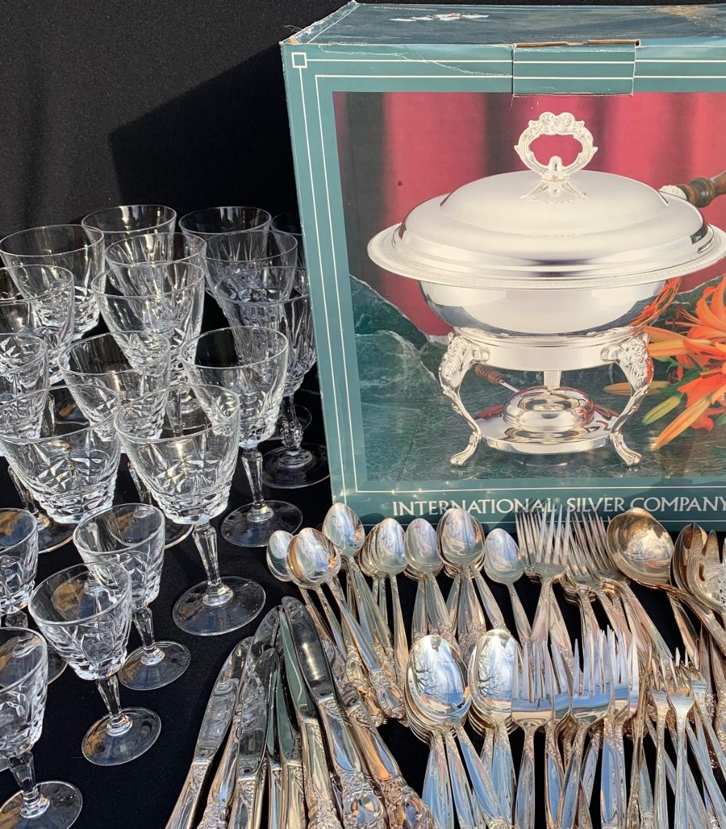 LOT 38R: Oneida Flatware, International Silver Co.  2qt Silver-plated Chafing Dish w/Sterno Holder & More