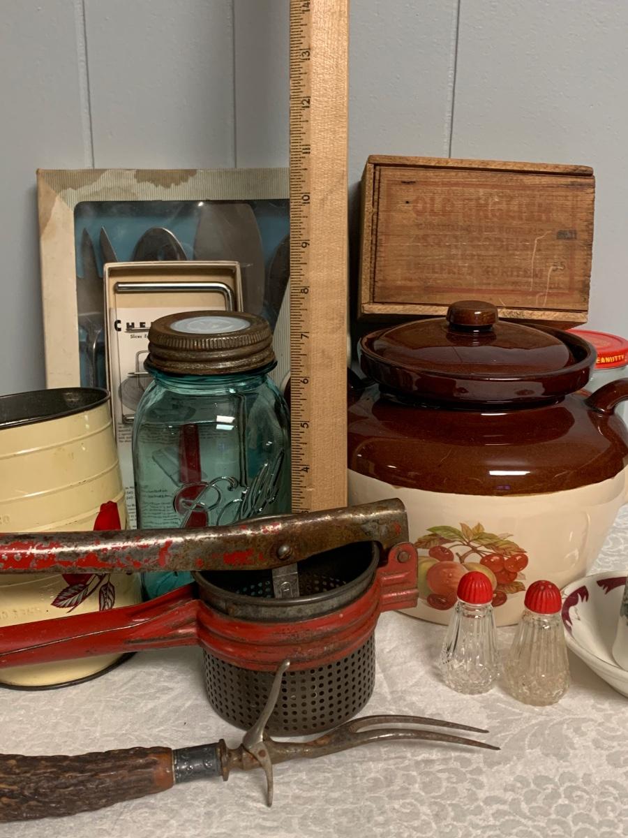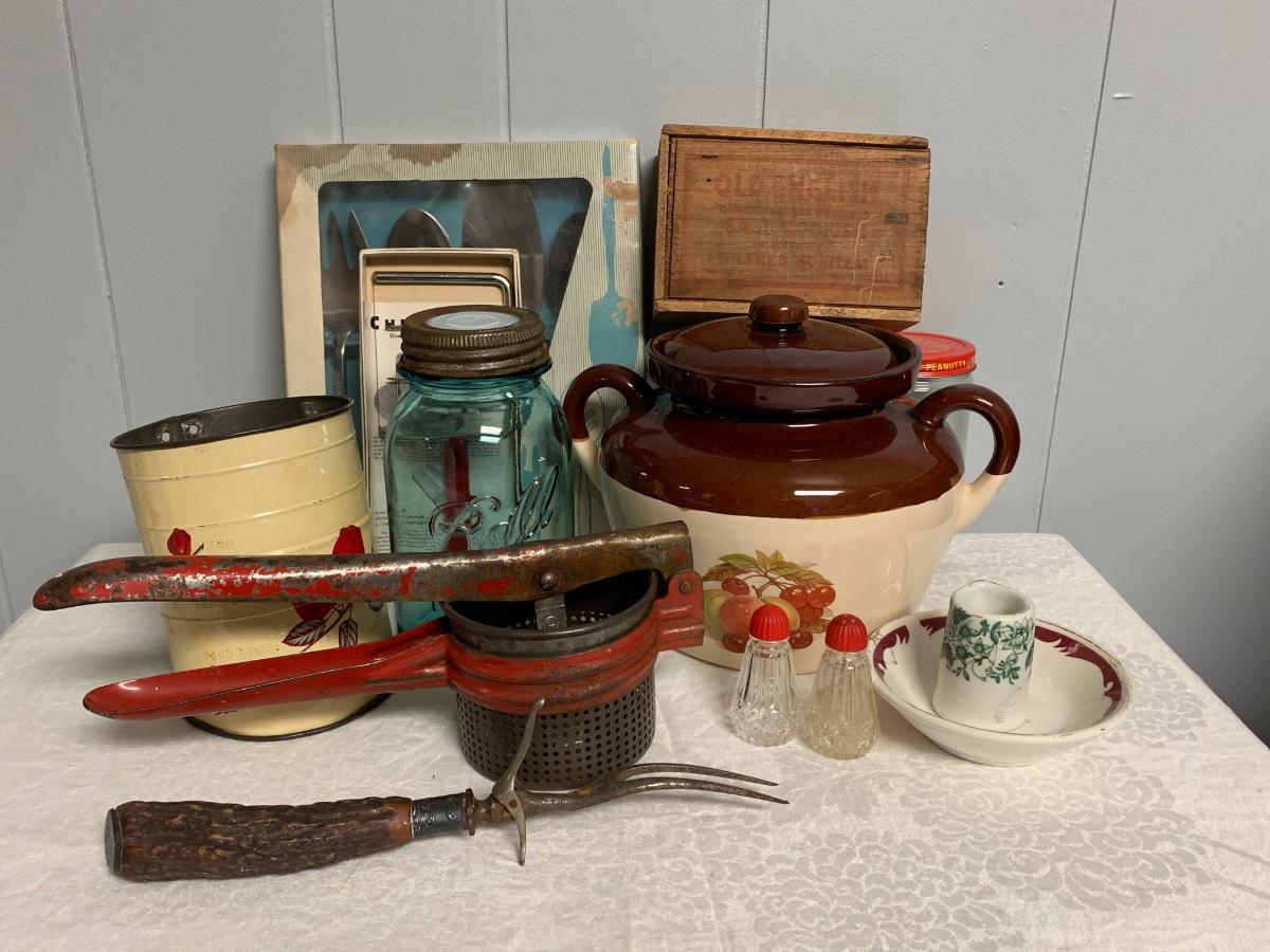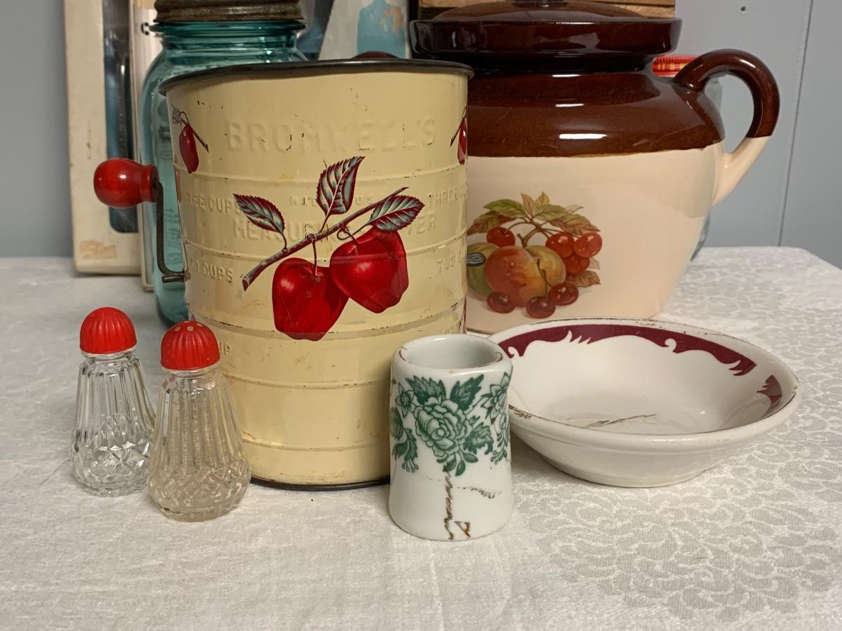 LOT 45R: Vintage Kitchen: McCoy Bean Stoneware Pottery,Ball Mason Jar, Sifter & More