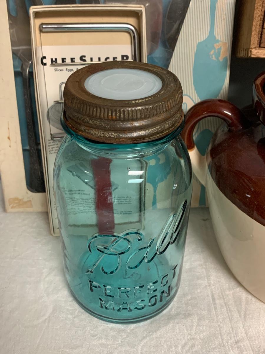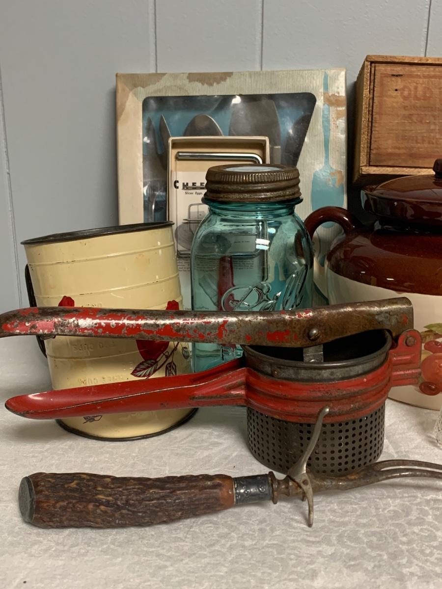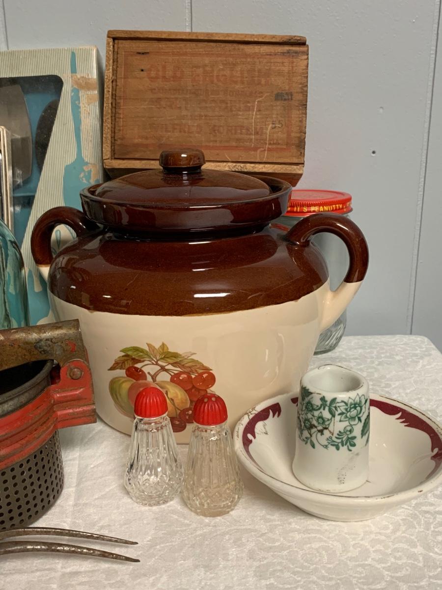 LOT 45R: Vintage Kitchen: McCoy Bean Stoneware Pottery,Ball Mason Jar, Sifter & More