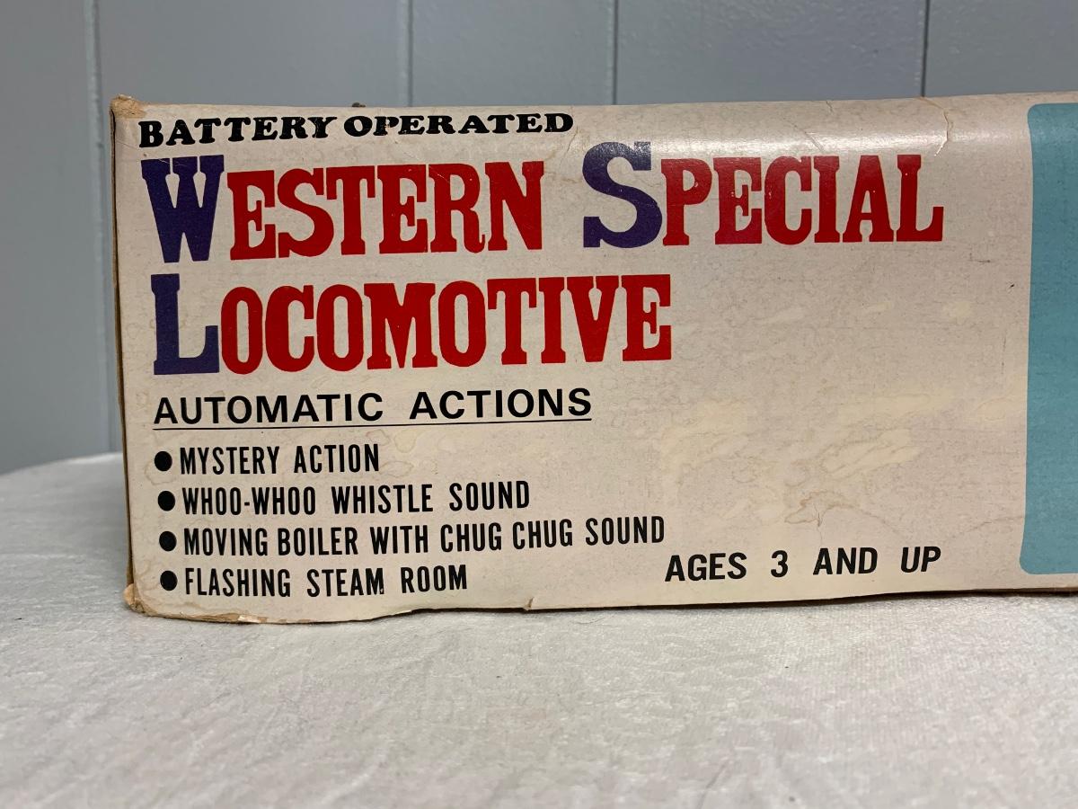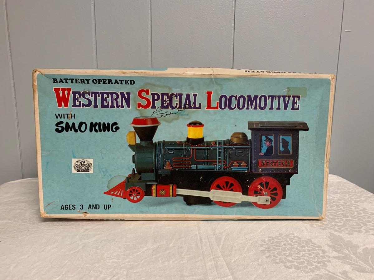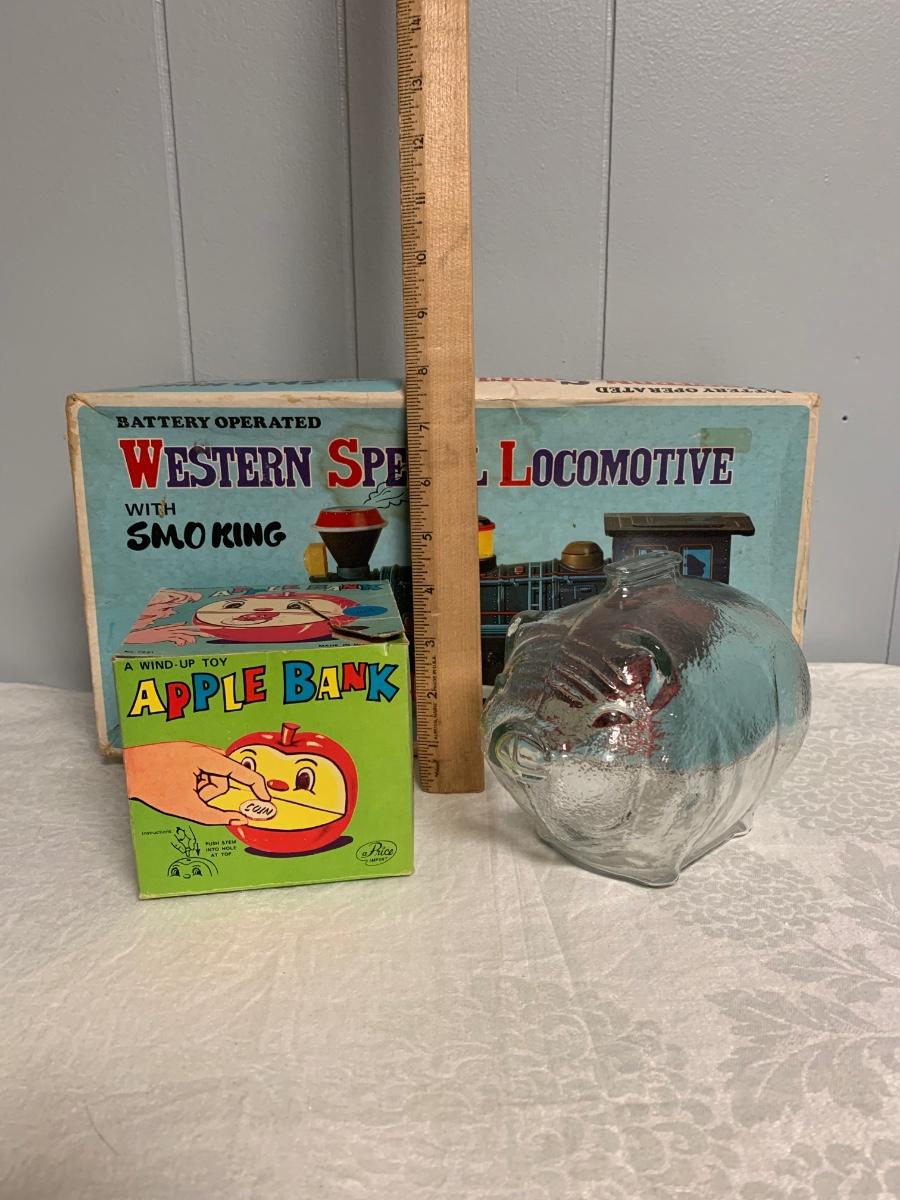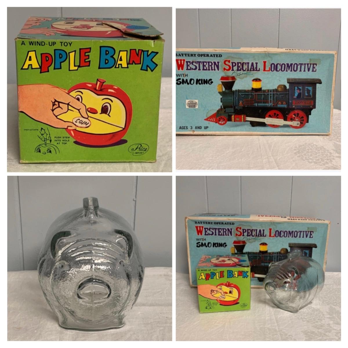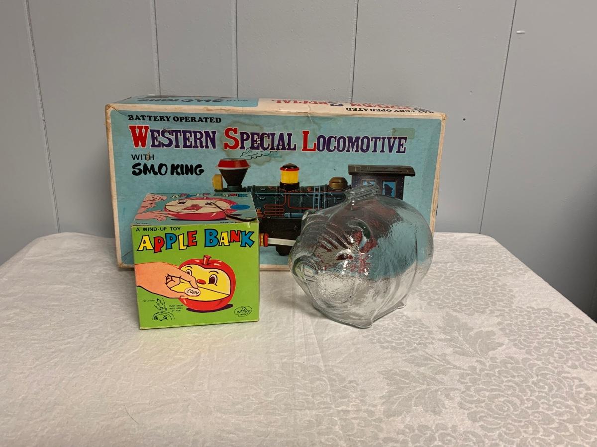 LOT 49R: Vintage Western Special Locomotive, Apple Bank & Glass Piggy Bank