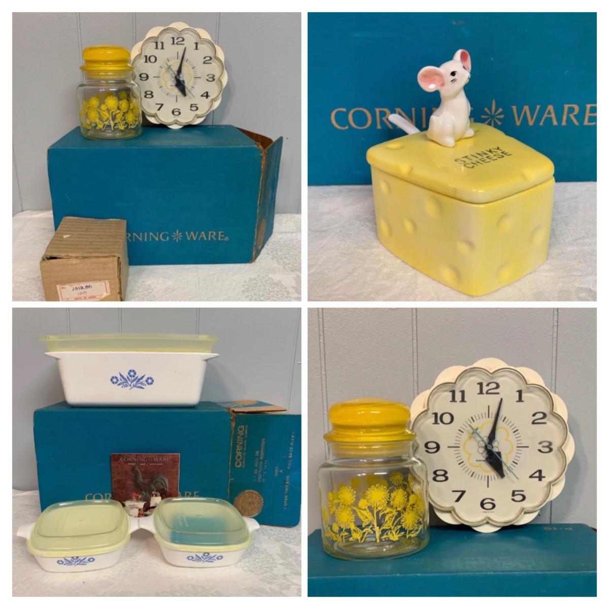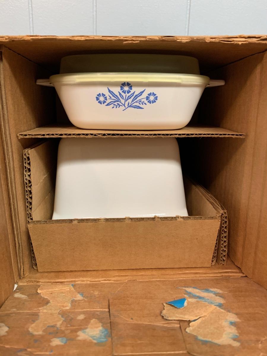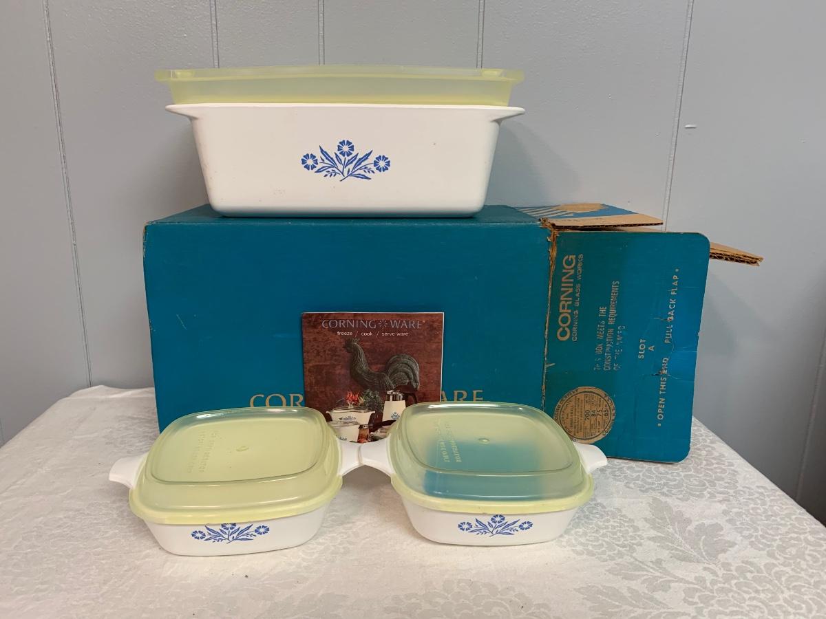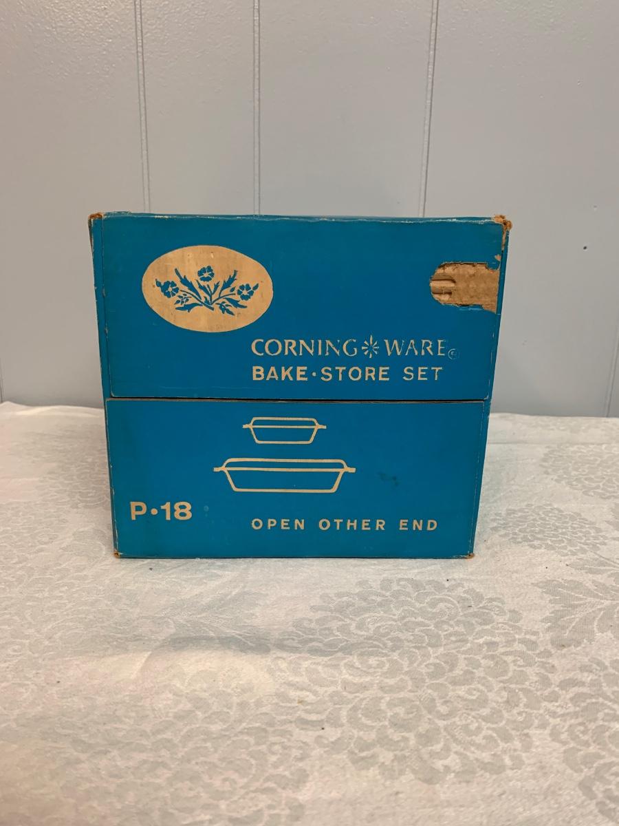 LOT 54R: Vintage Corning Cornflower Blue Bake Store Set w/Original Box, Stinky Cheese Mouse & More