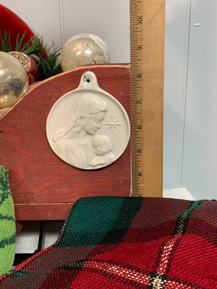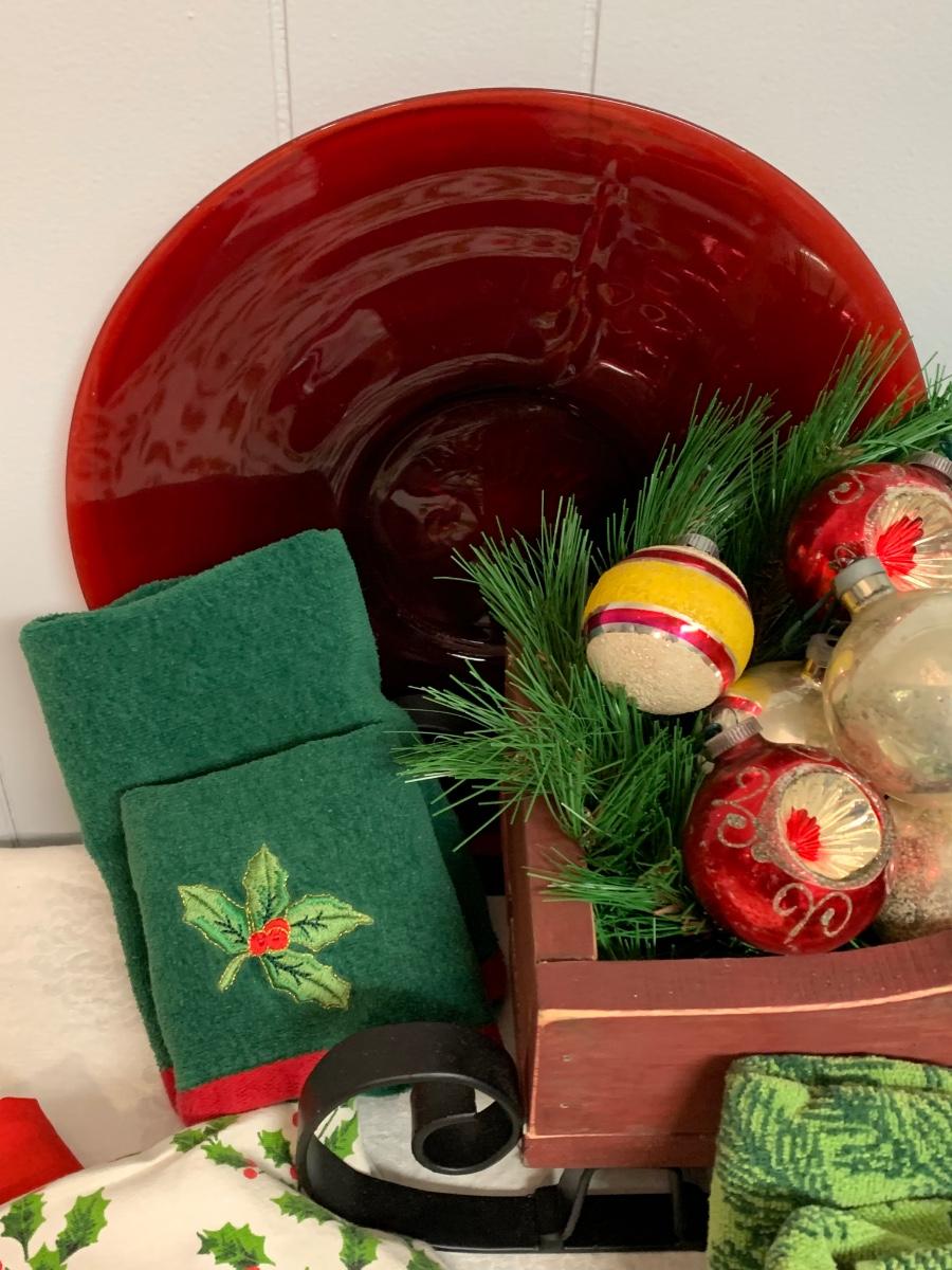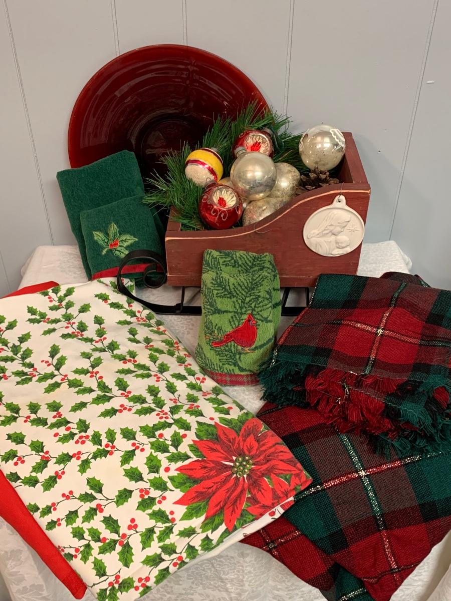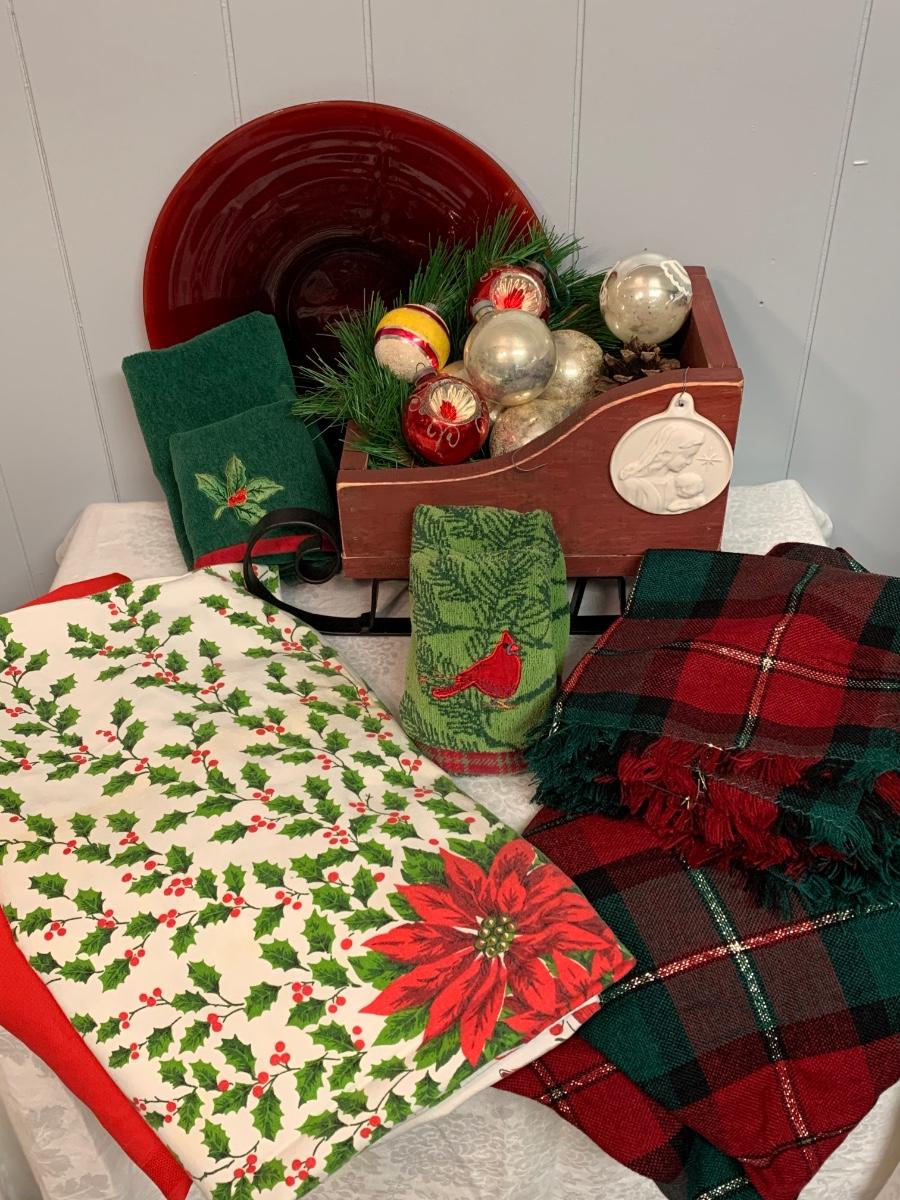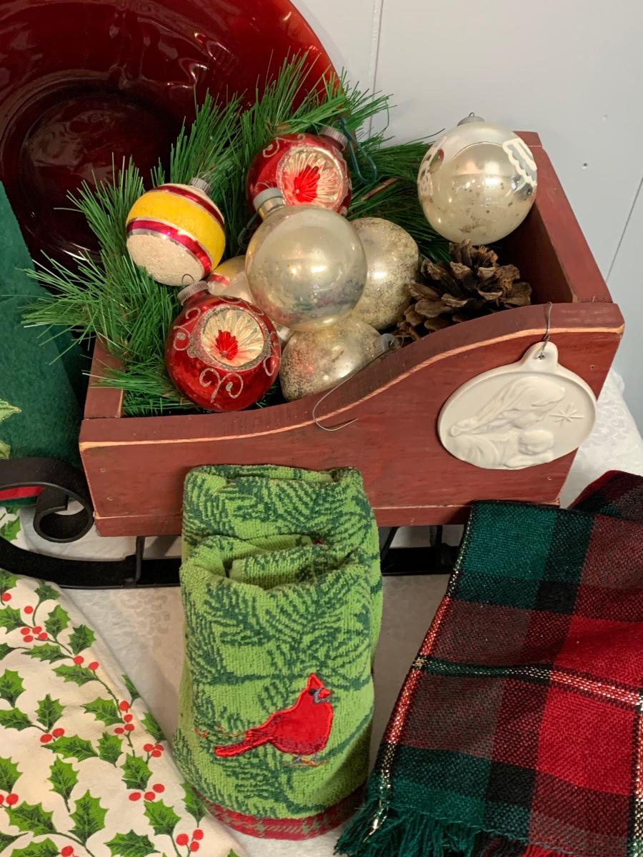 LOT 56R: Wooden Sleigh w/Vintage Ornament, Holiday Linens, Glass Red Serving Platter