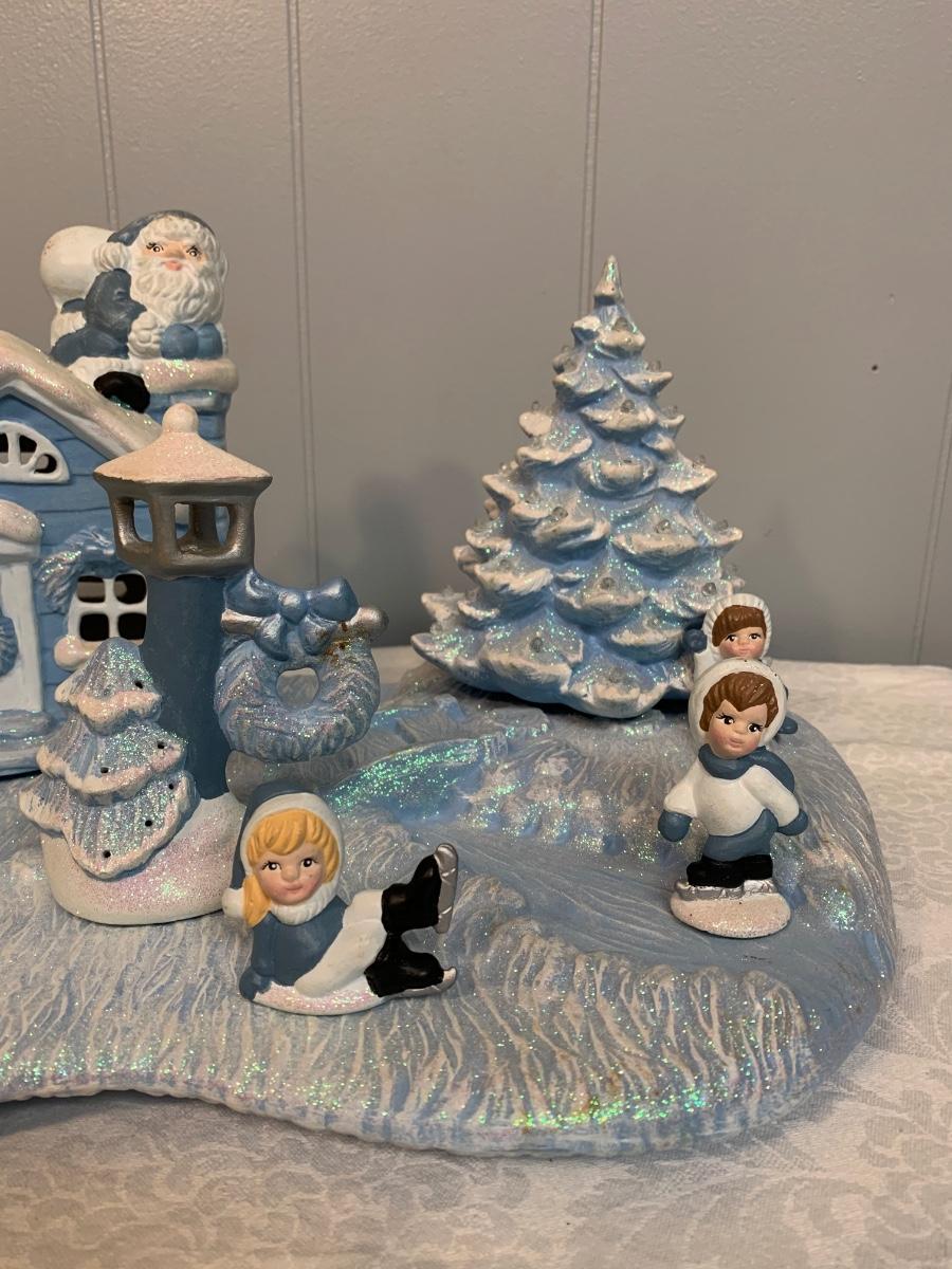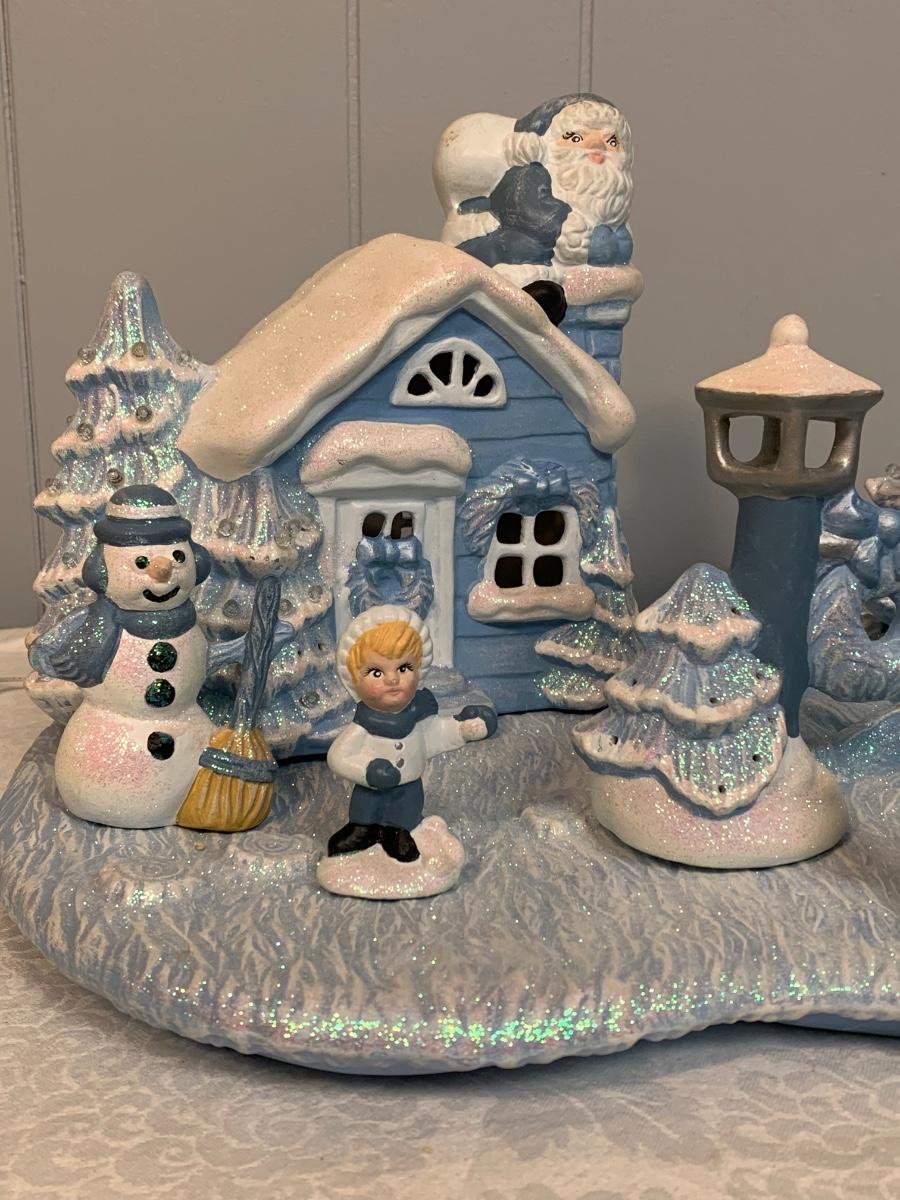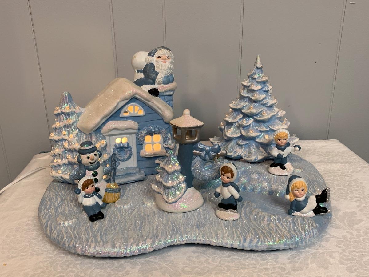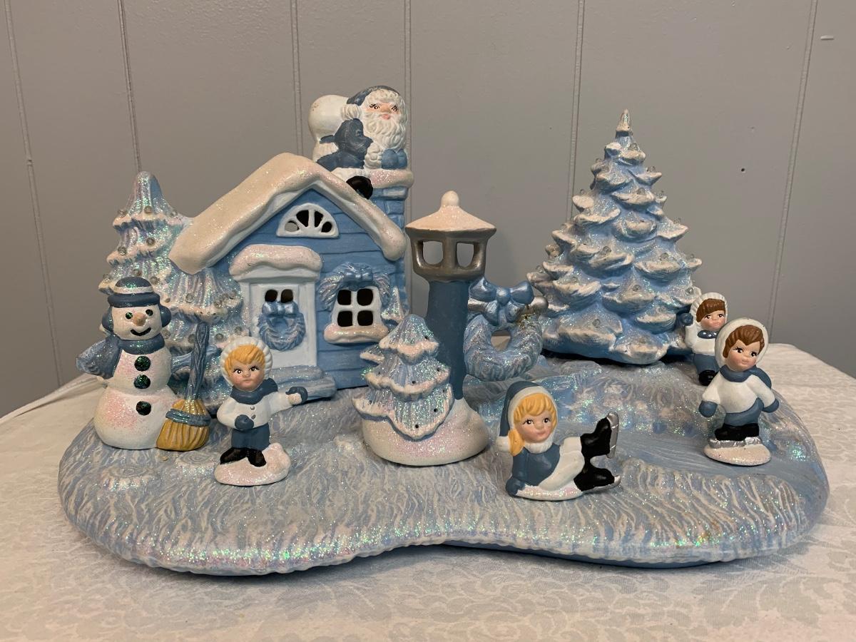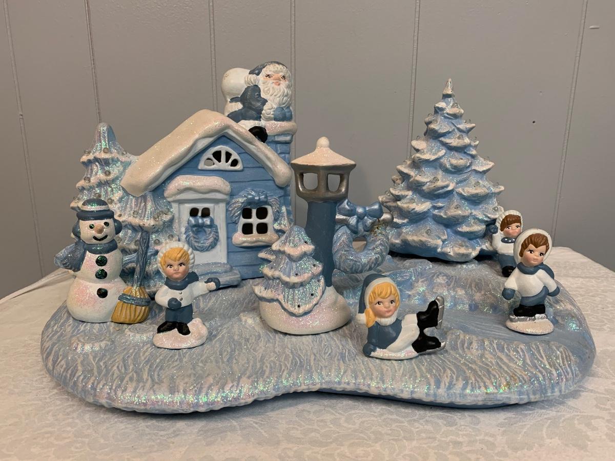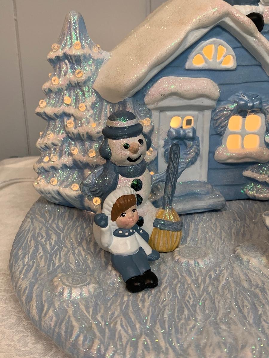 LOT 58R: Ceramic Glittery Light Up Christmas House w/Skaters & Snowman