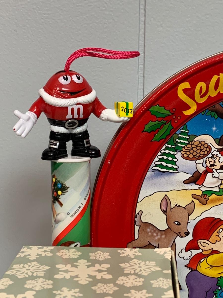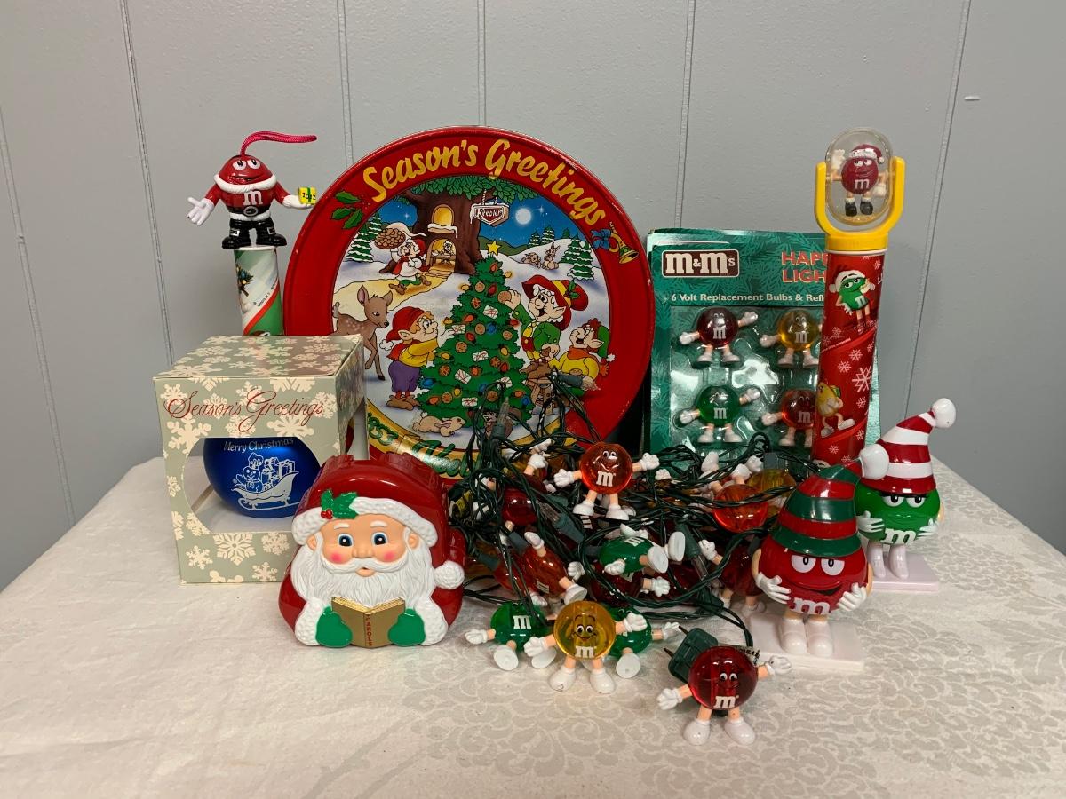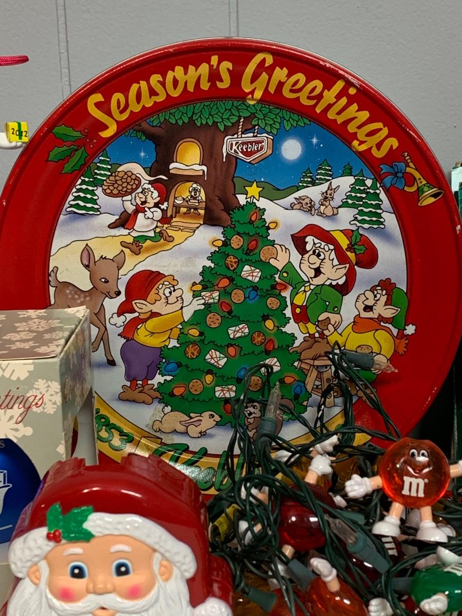 LOT 74R: Holiday M & M Light Covers, Pillsbury Ornament, Keebler Cookie Tin