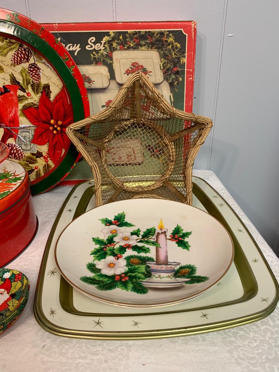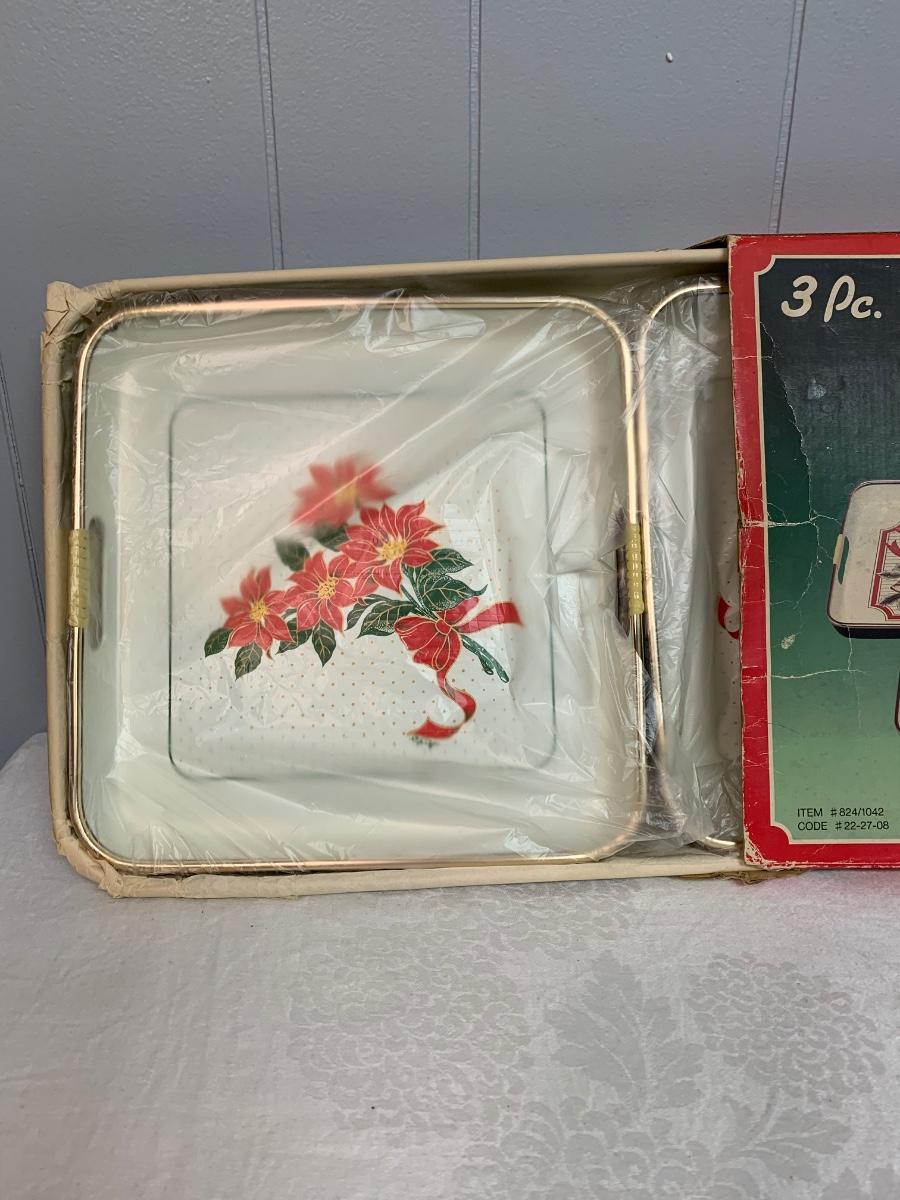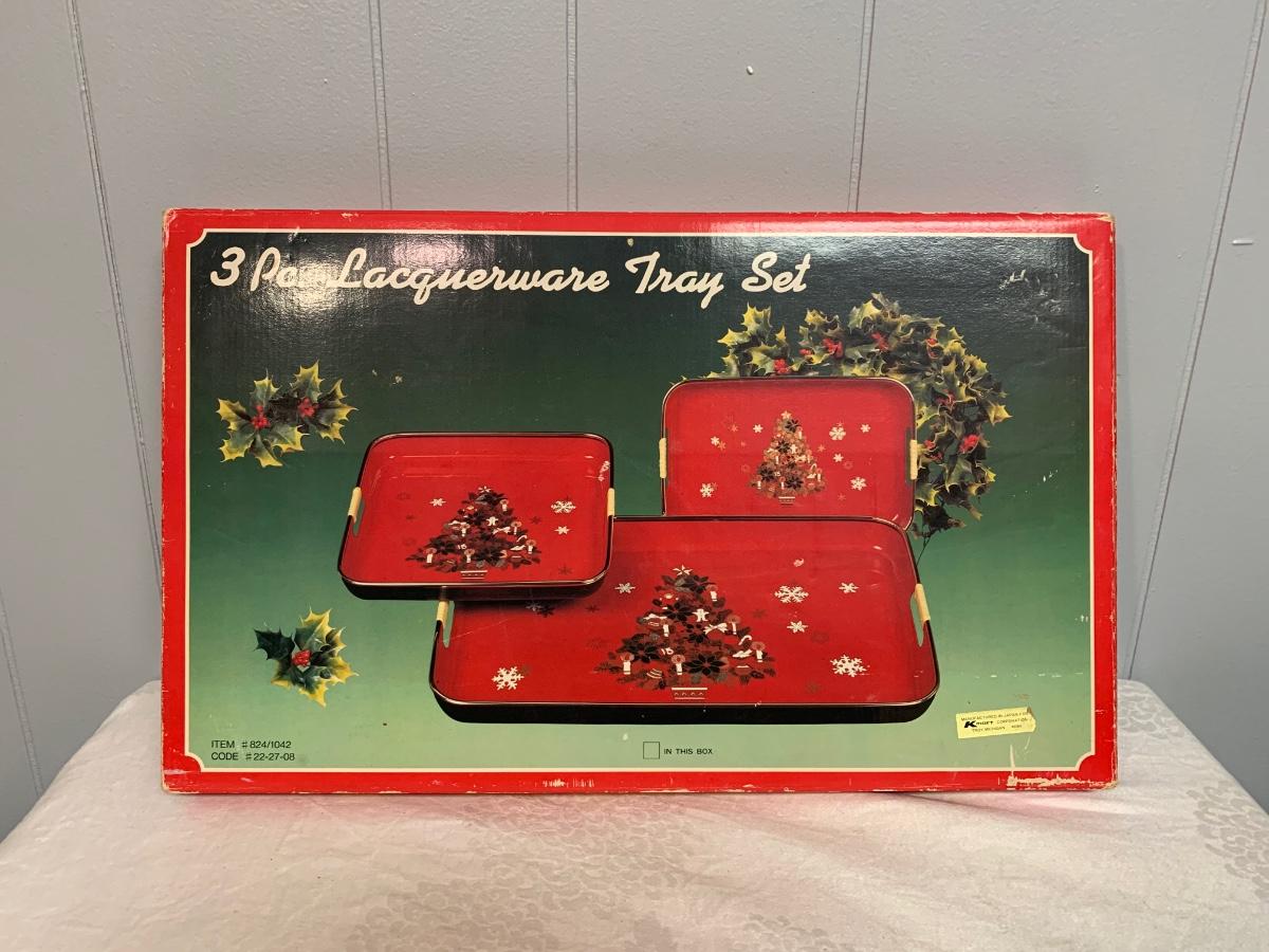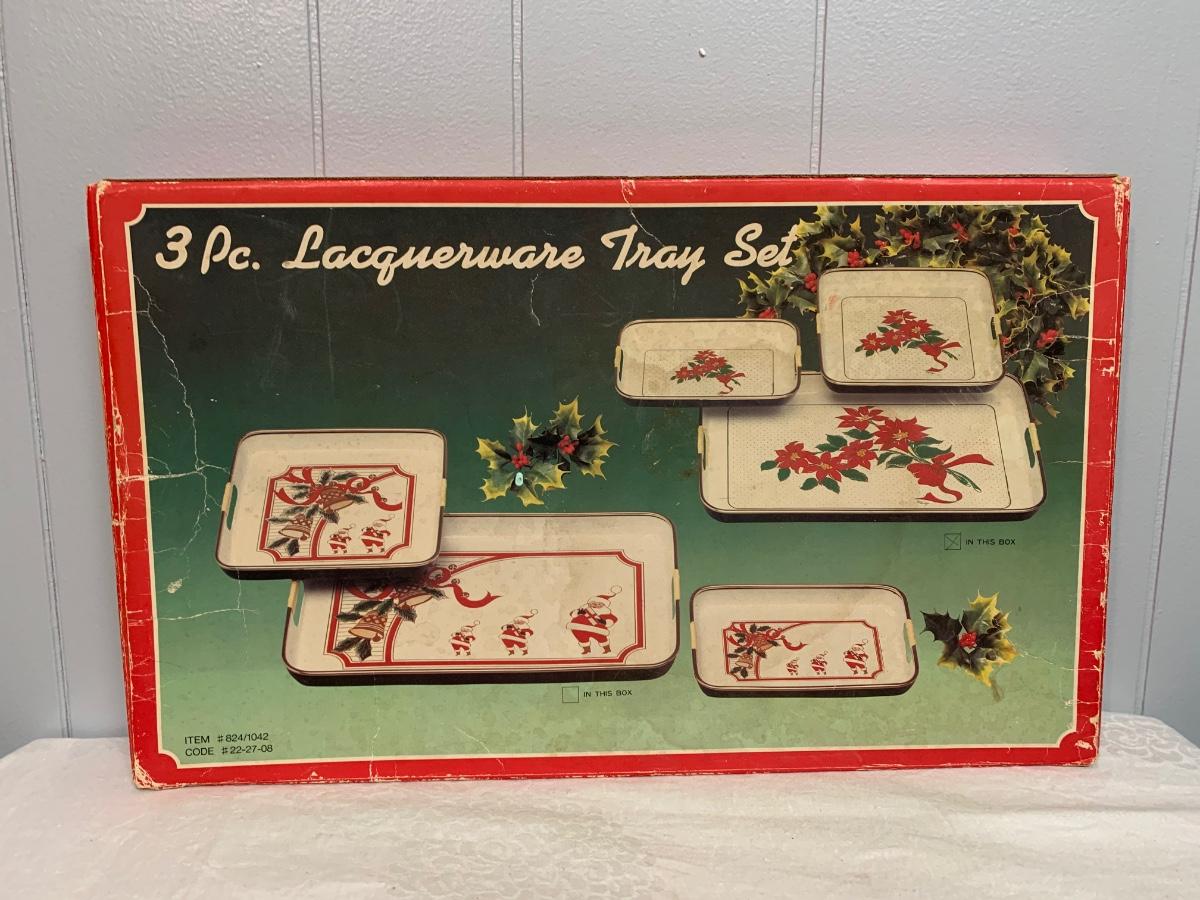 LOT 76R: Wheaton Hand Blown Plate, Vintage Holiday Trays, 3Pc. Lacquerware Tray Set (New Inbox)