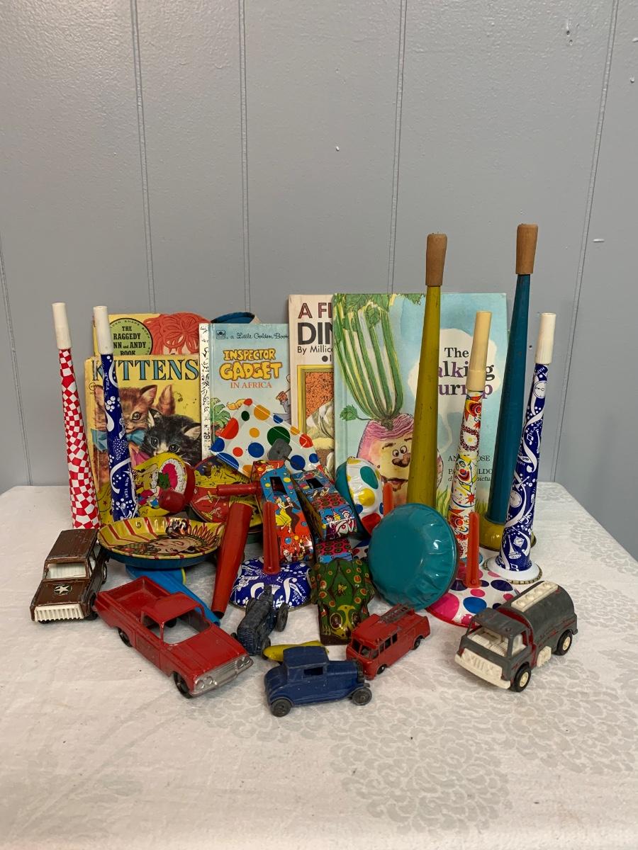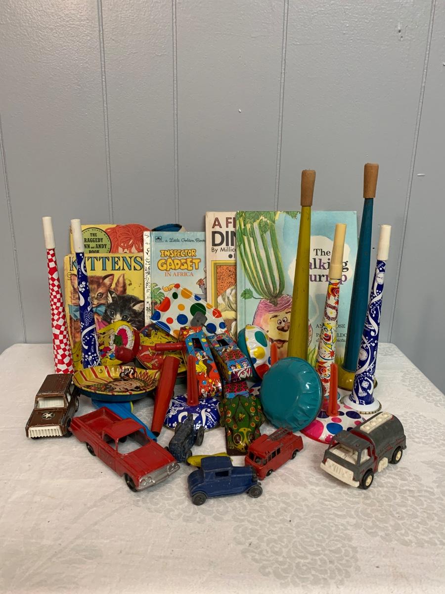 LOT 80R: Vintage Collection of  Tootsie Cars/Trucks, Noisemakers & Storybooks