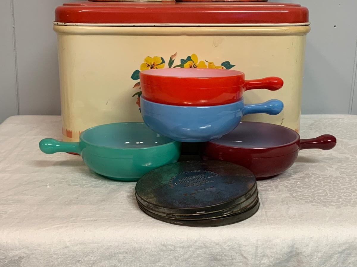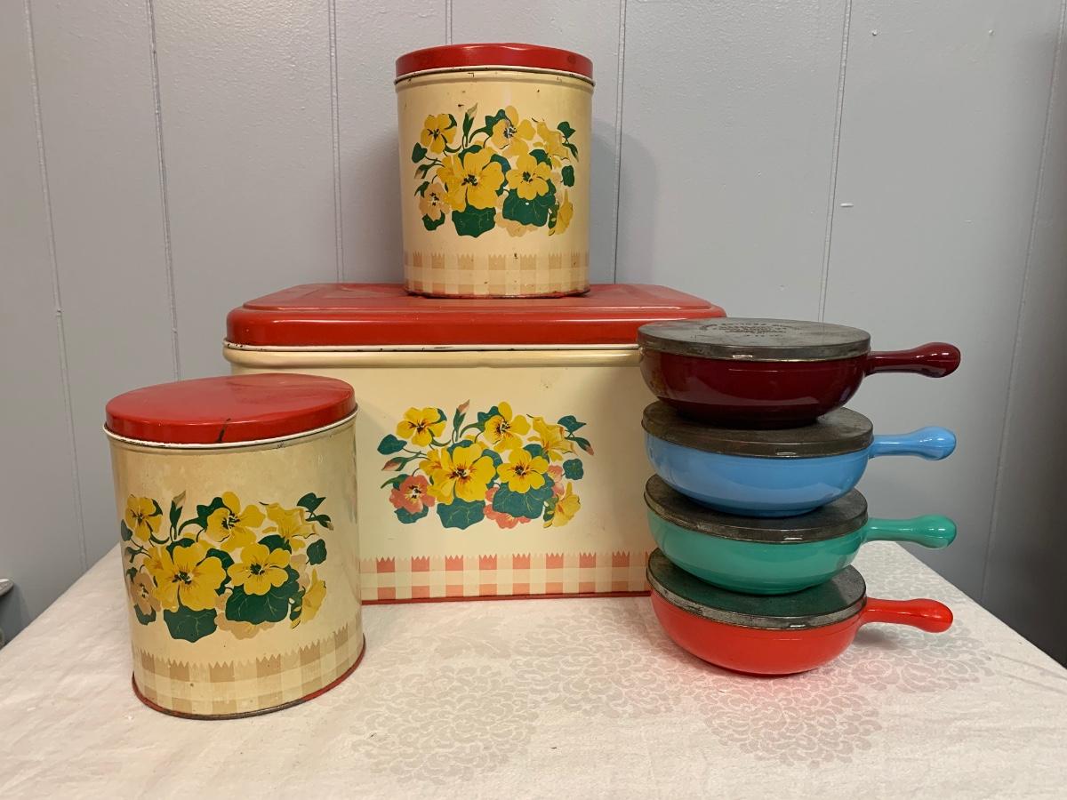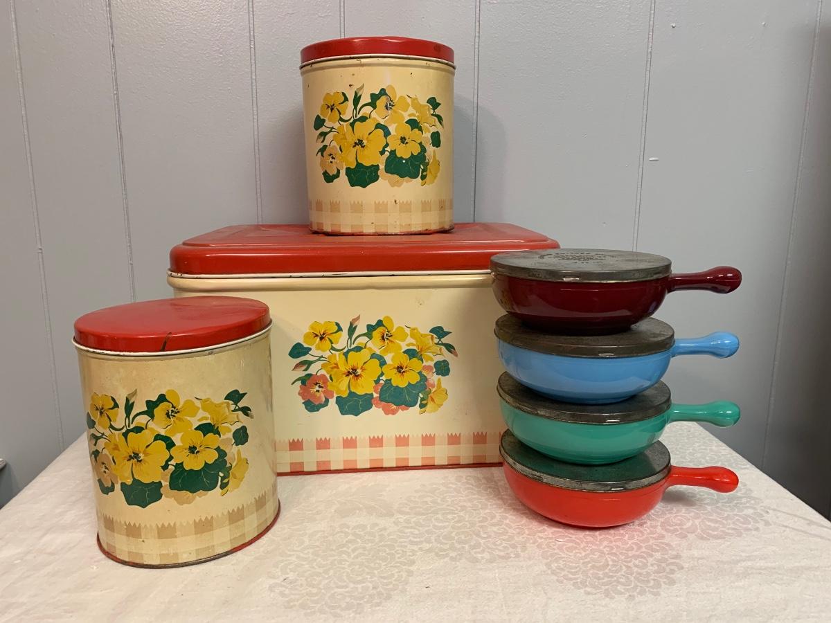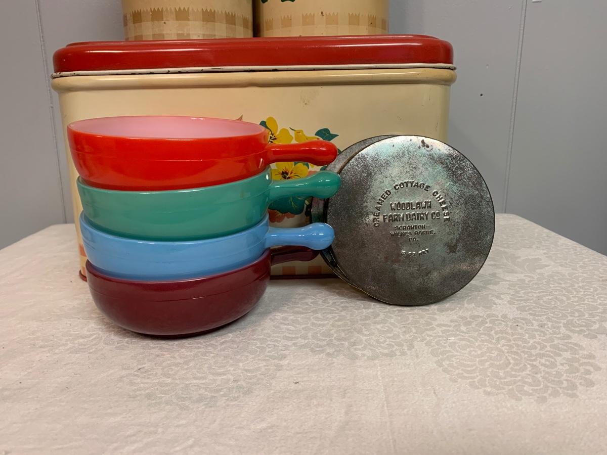 LOT 83R: Vtg Harmony Farms Glasbake  Creamed Cottage Cheese Containers, Vtg Bread Tin & Canisters