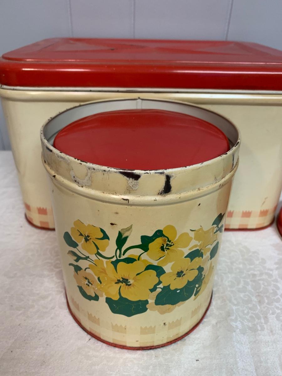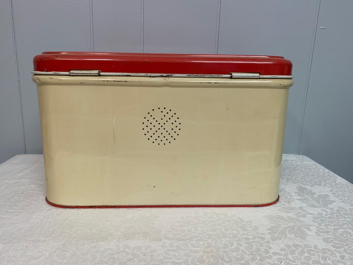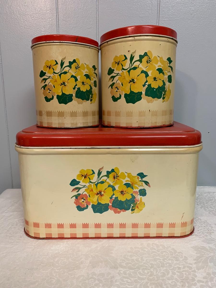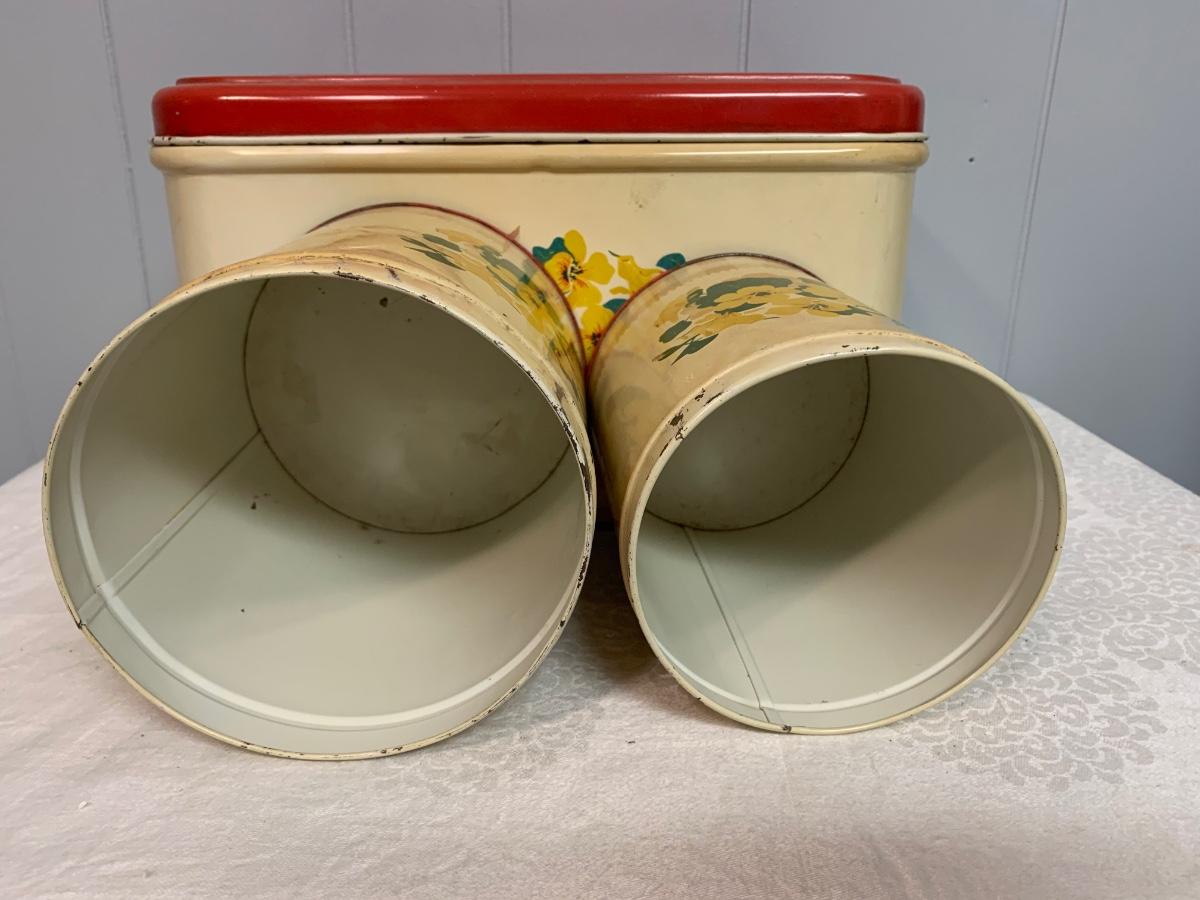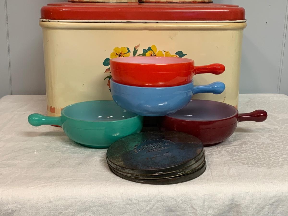 LOT 83R: Vtg Harmony Farms Glasbake  Creamed Cottage Cheese Containers, Vtg Bread Tin & Canisters