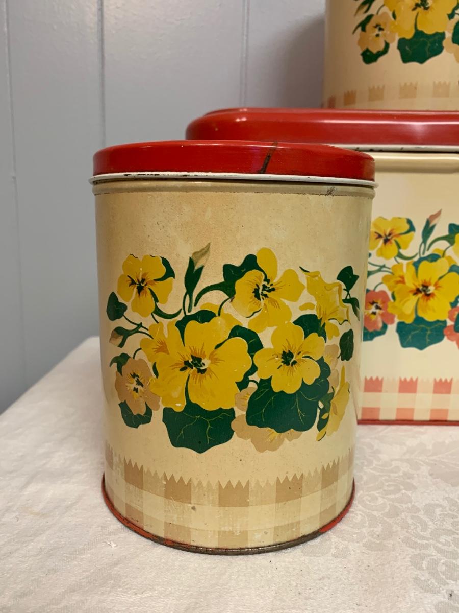 LOT 83R: Vtg Harmony Farms Glasbake Creamed Cottage Cheese Containers, Vtg Bread Tin & Canisters