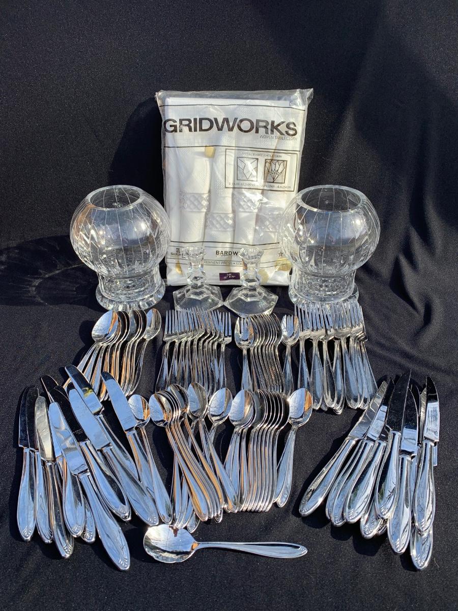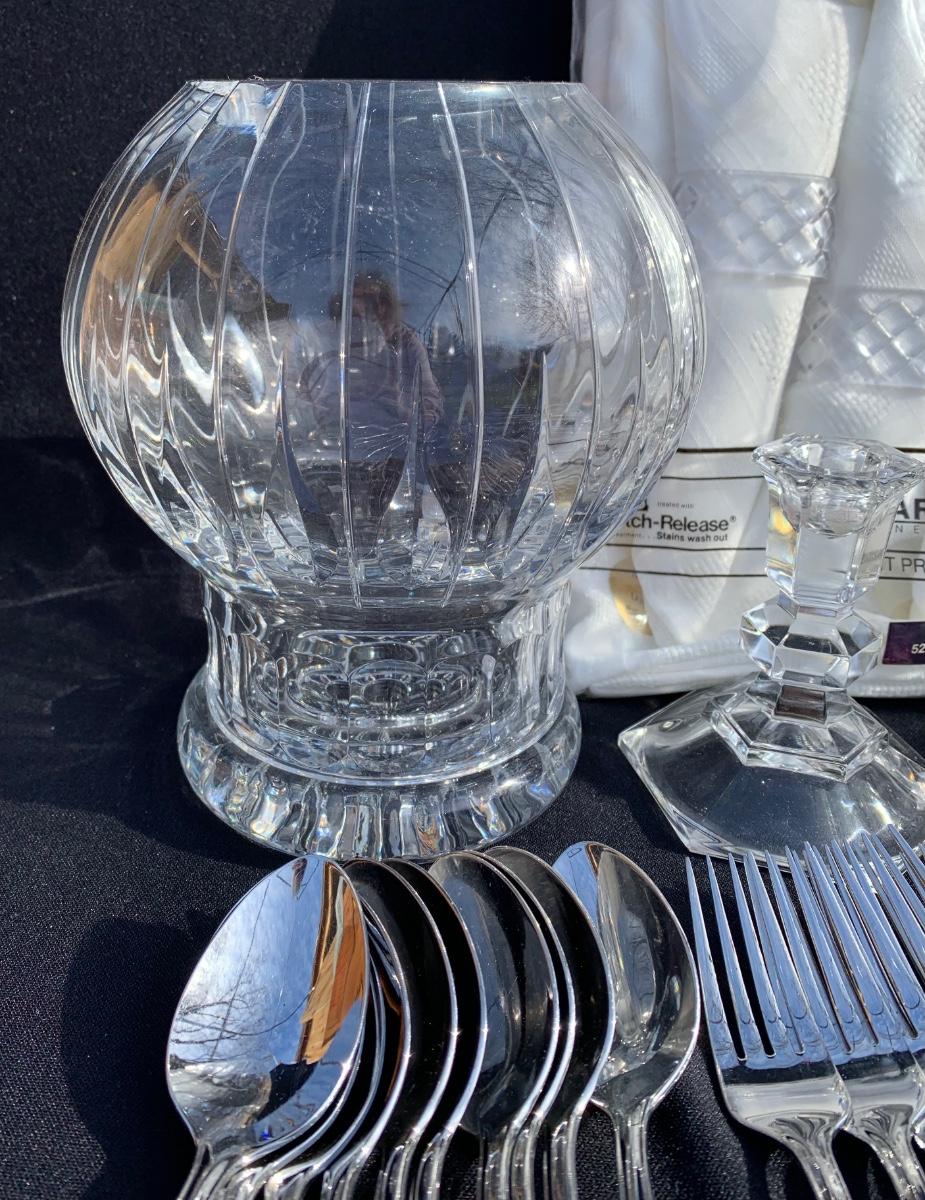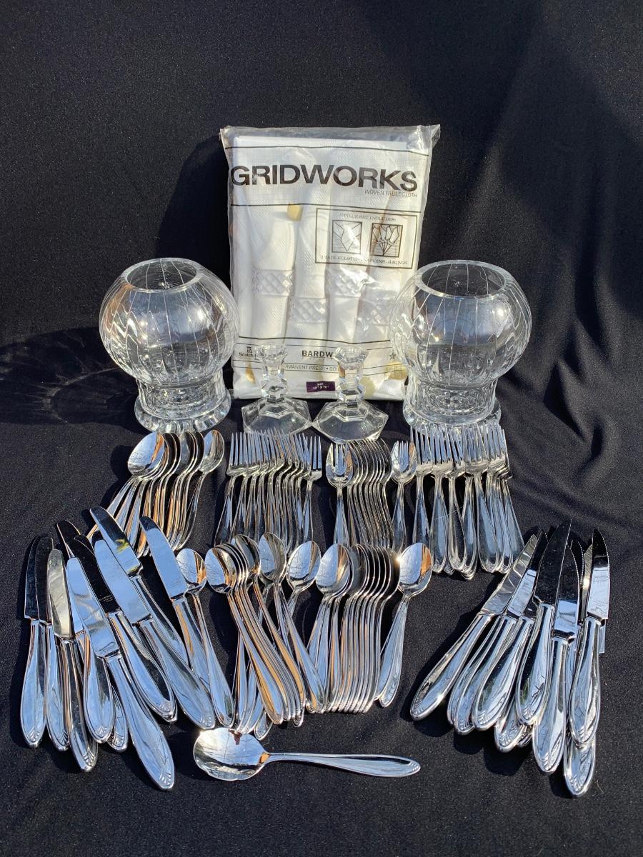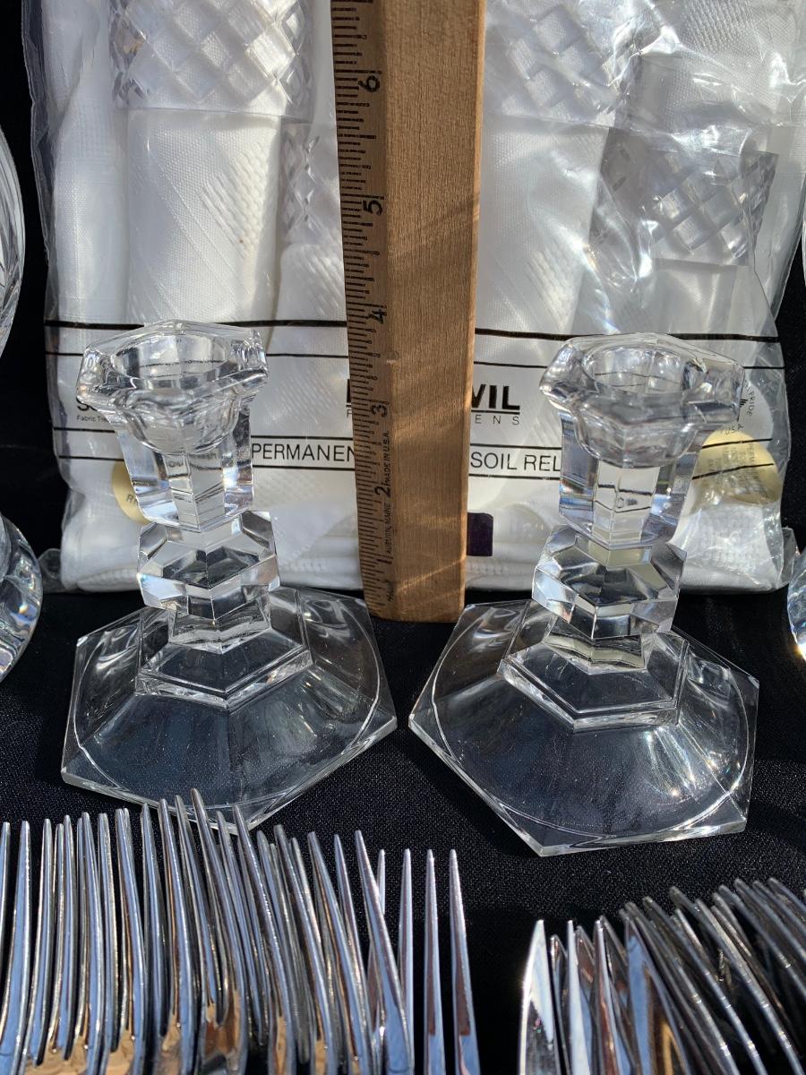 LOT 86R: Crystal 2pcs Hurricane Candle Holders, Lenox Flatware (93 pcs)