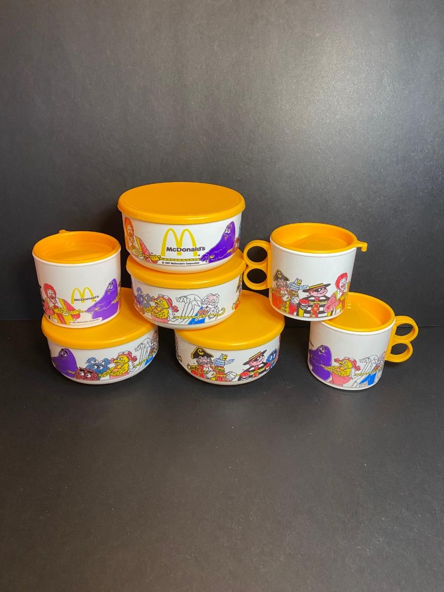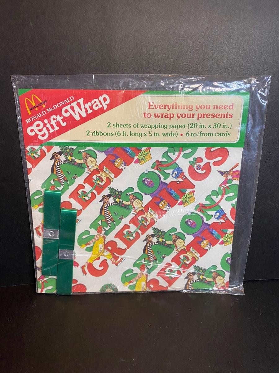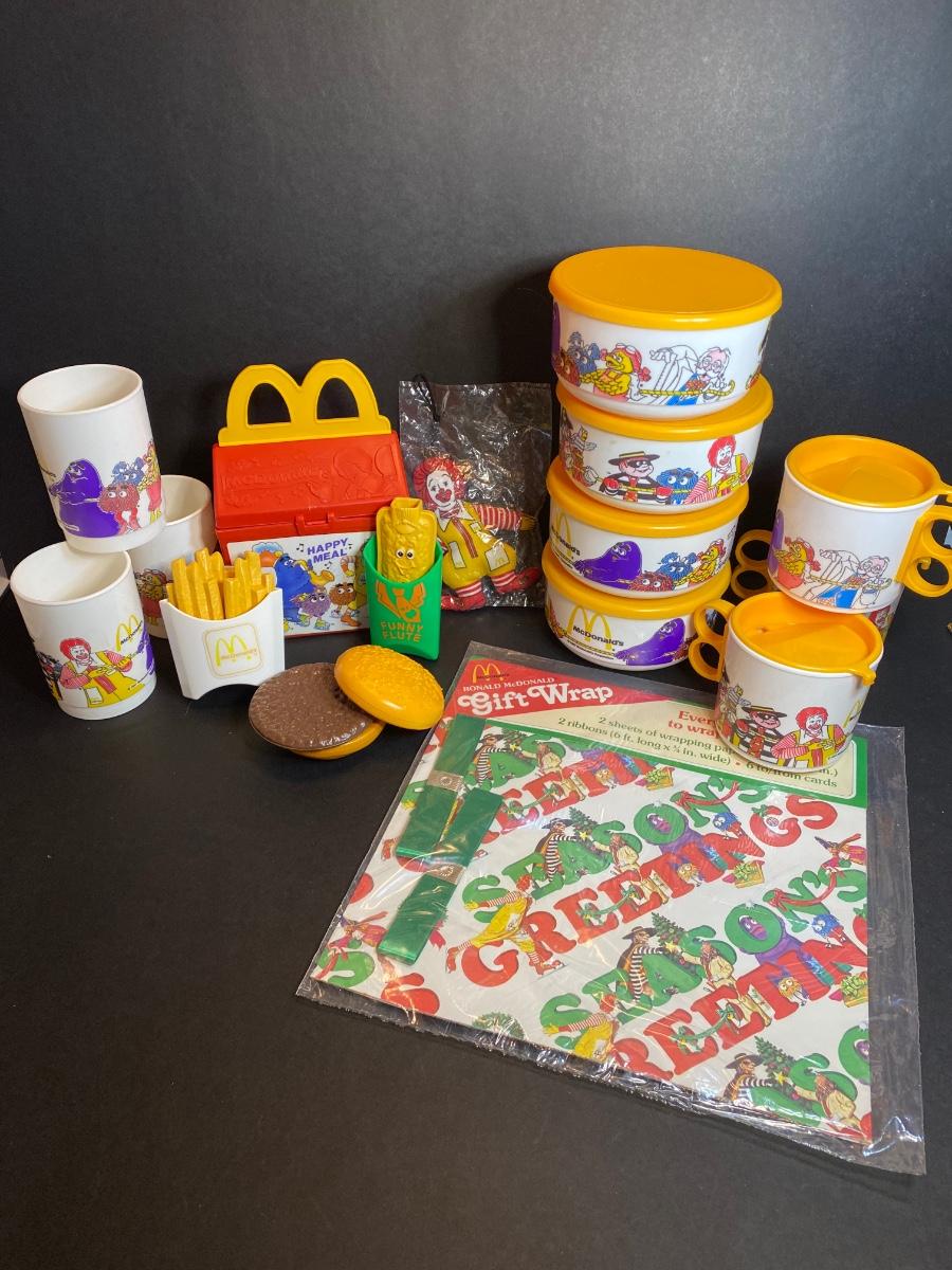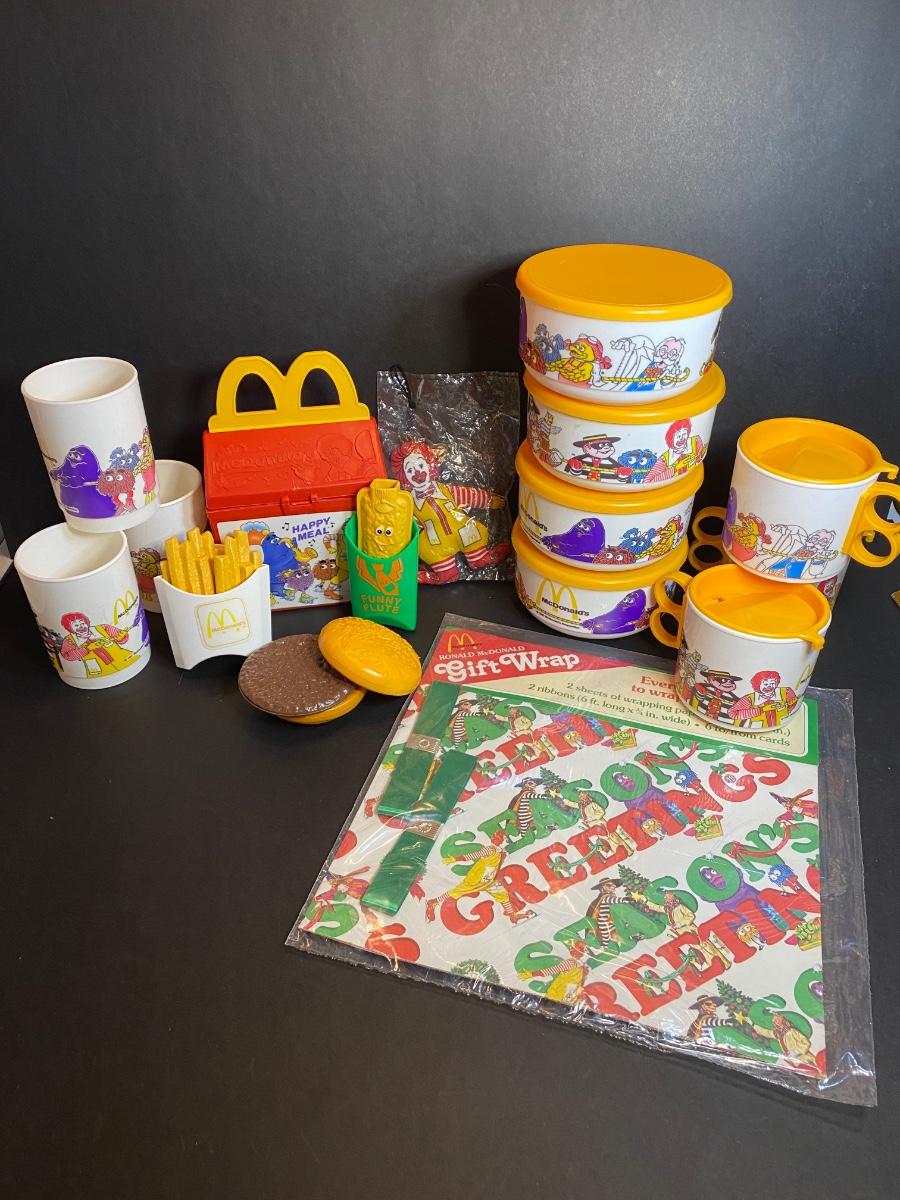 LOT 122: Vintage McDonald’s Happy Meal Toys, unopened Gift Wrap and Cup/ Bowls w Lids