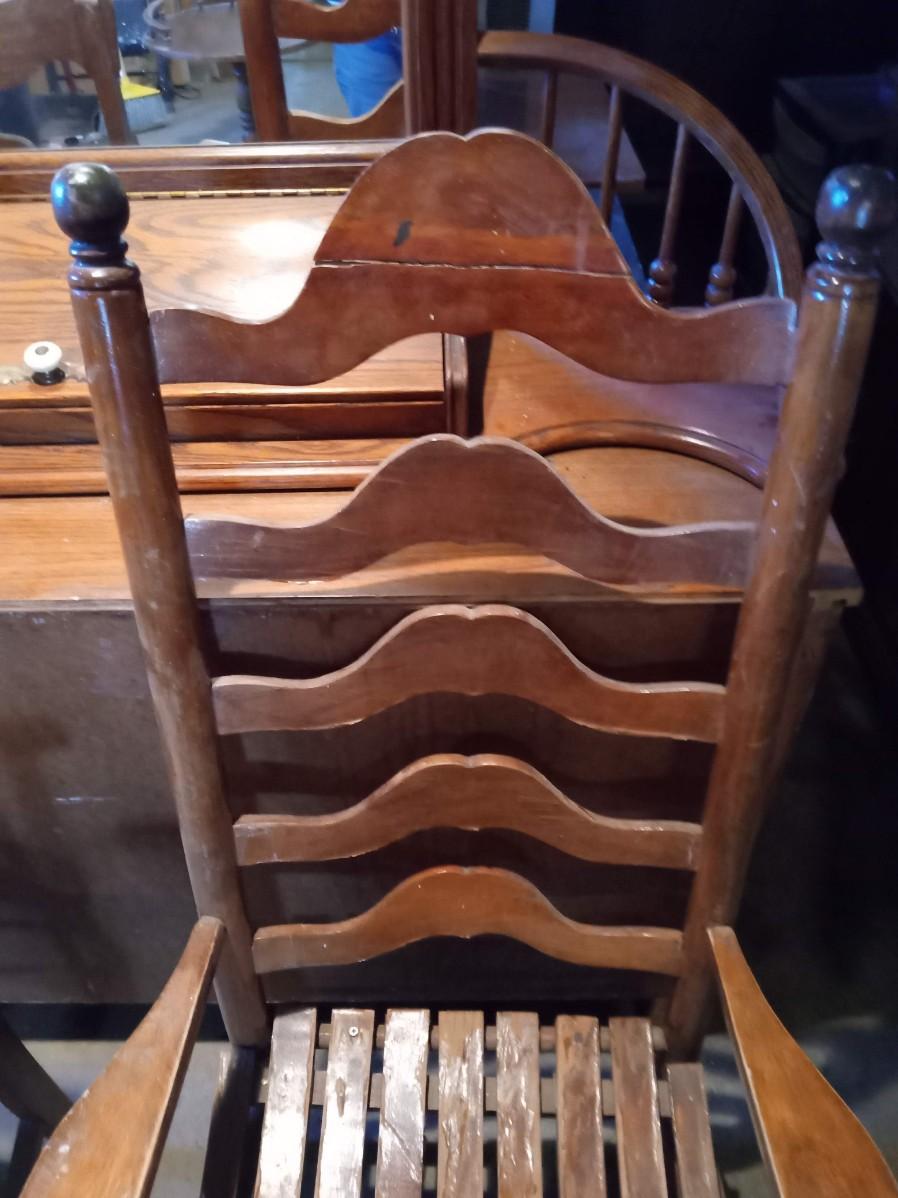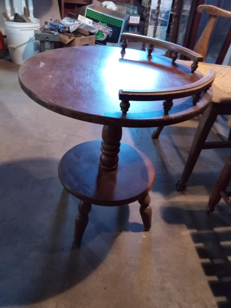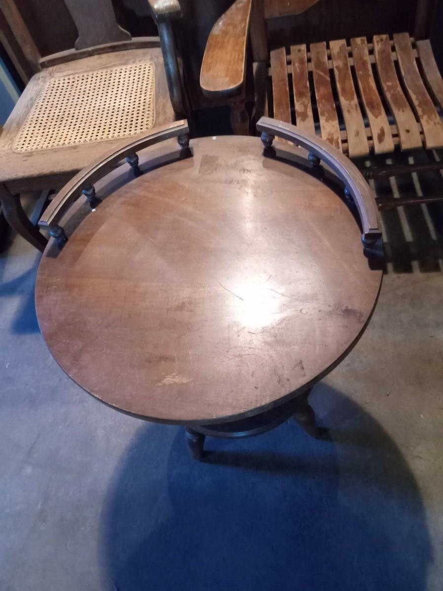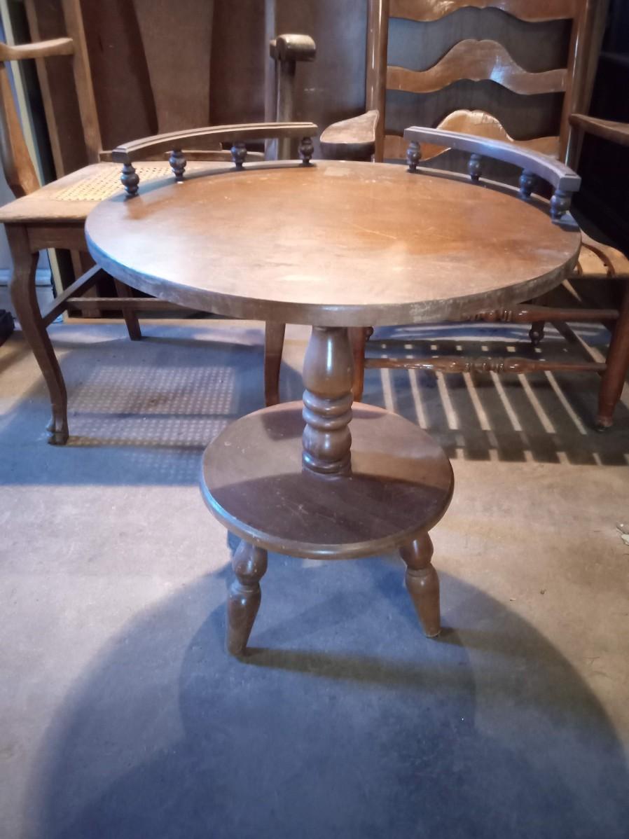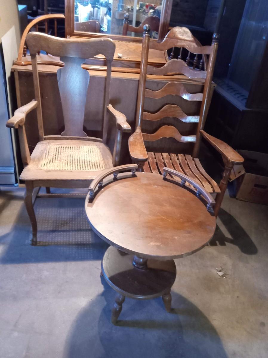 TWO WOODEN HAND CRAFTED CHAIRS GREAT TO RESTORE. TWO TIER CIRCULAR TABLE 21×22