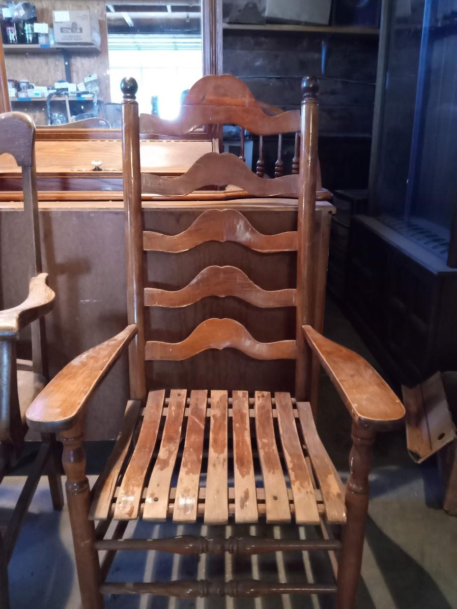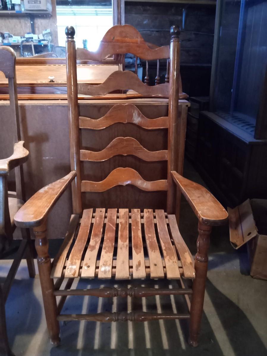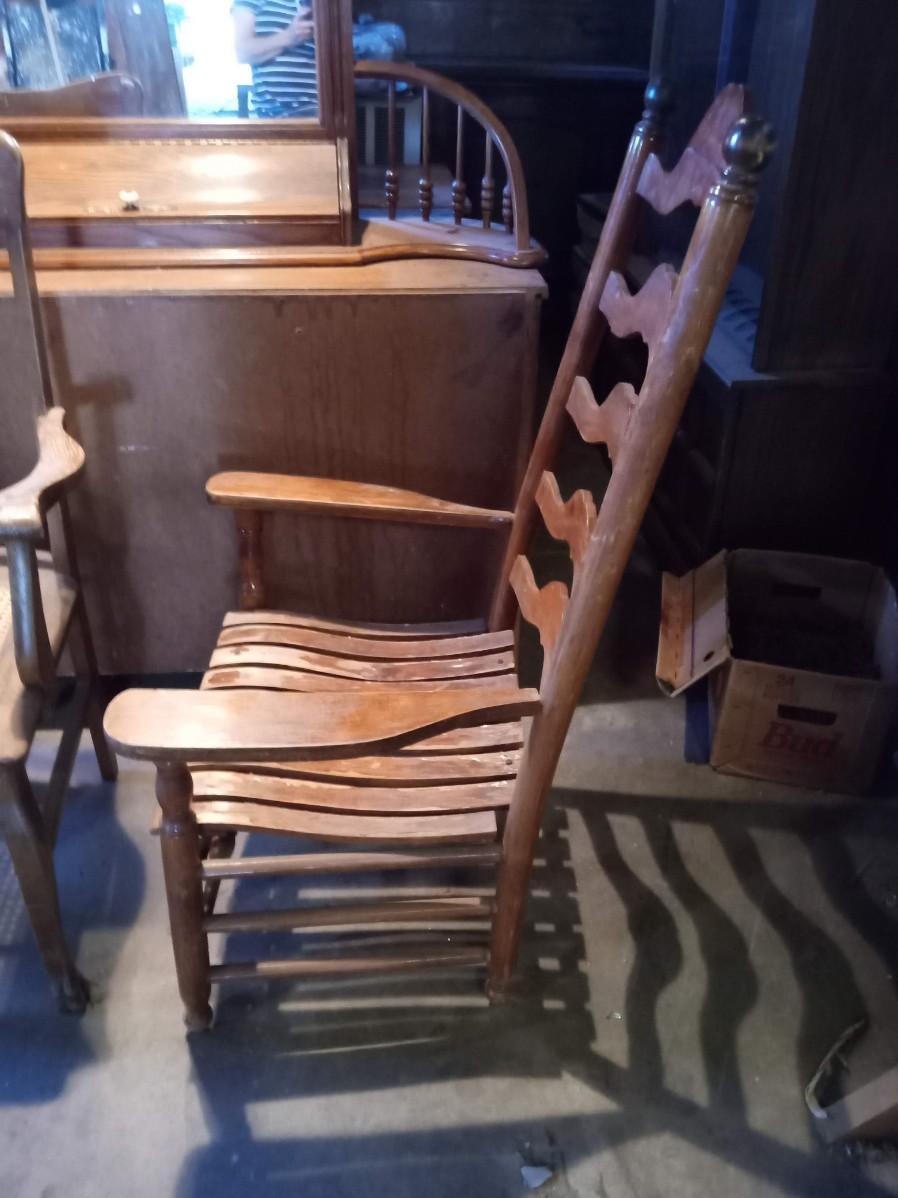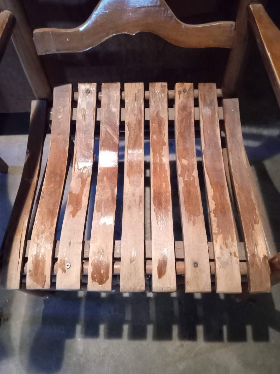 TWO WOODEN HAND CRAFTED CHAIRS GREAT TO RESTORE. TWO TIER CIRCULAR TABLE 21×22