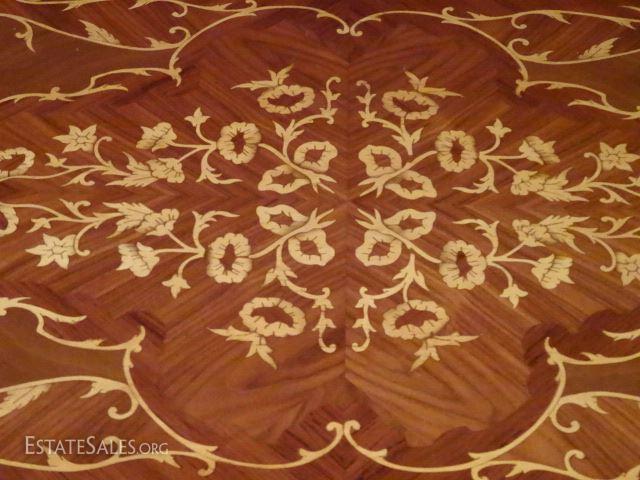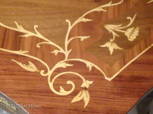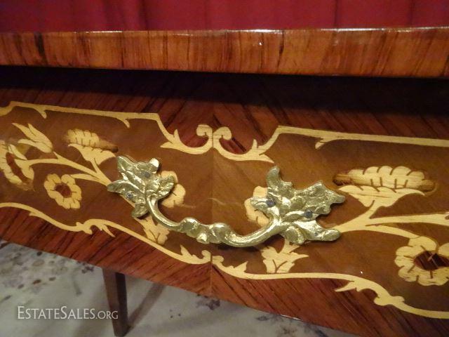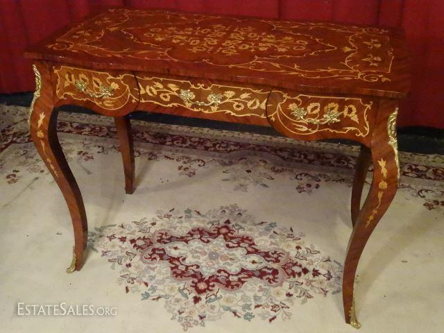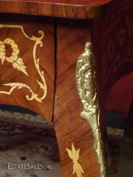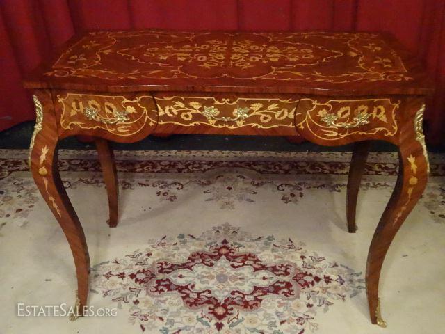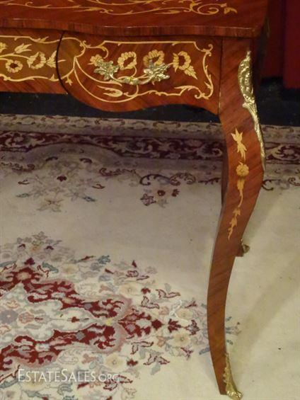 LOT 77A: LOUIS XV STYLE MARQUETRY WRITING DESK, GILT METAL MOUNTS, INLAID FOLIATE AND FLORAL DESIGNS, EXCELLENT CONDITION, 38"W X 20"D X 30"H, SKU151.66