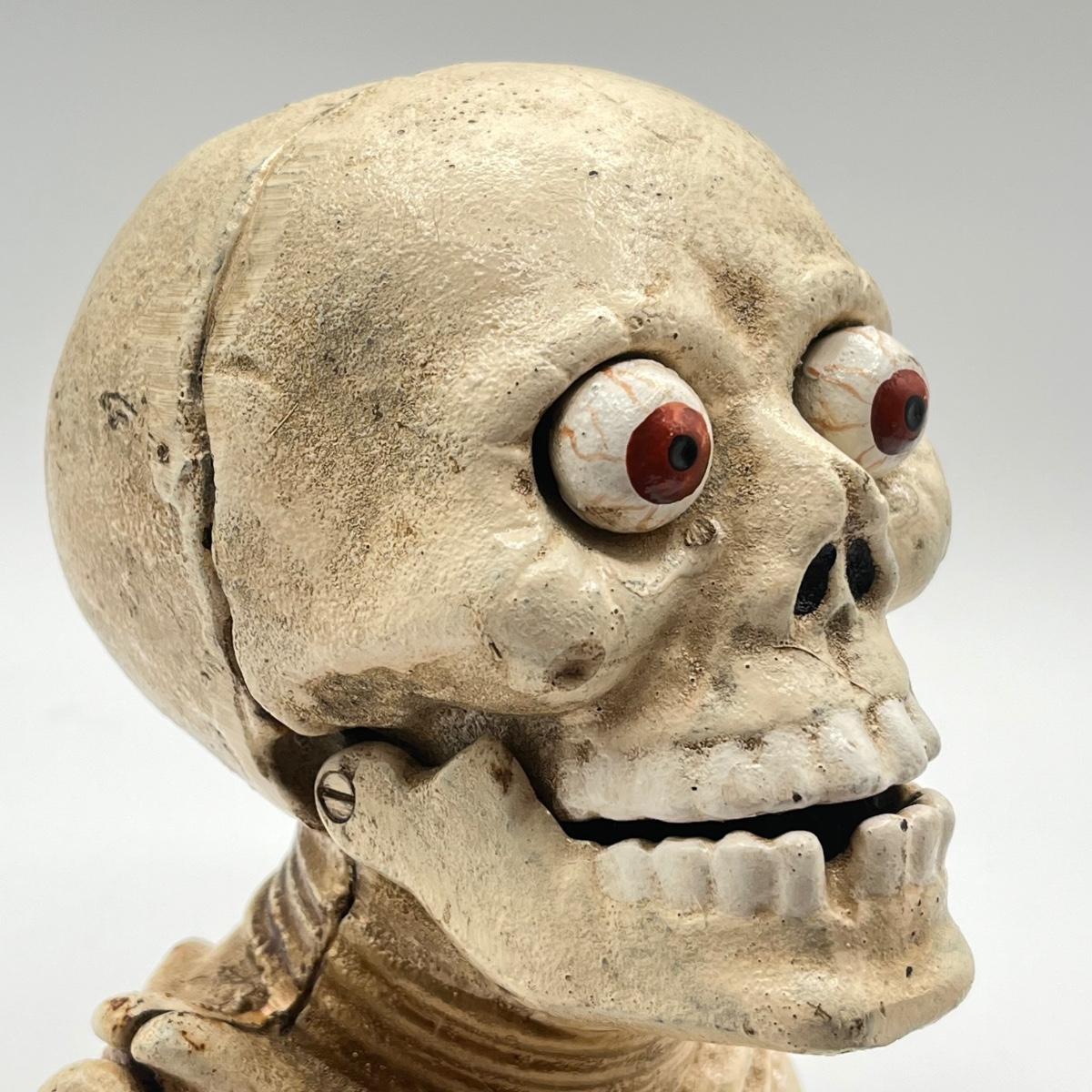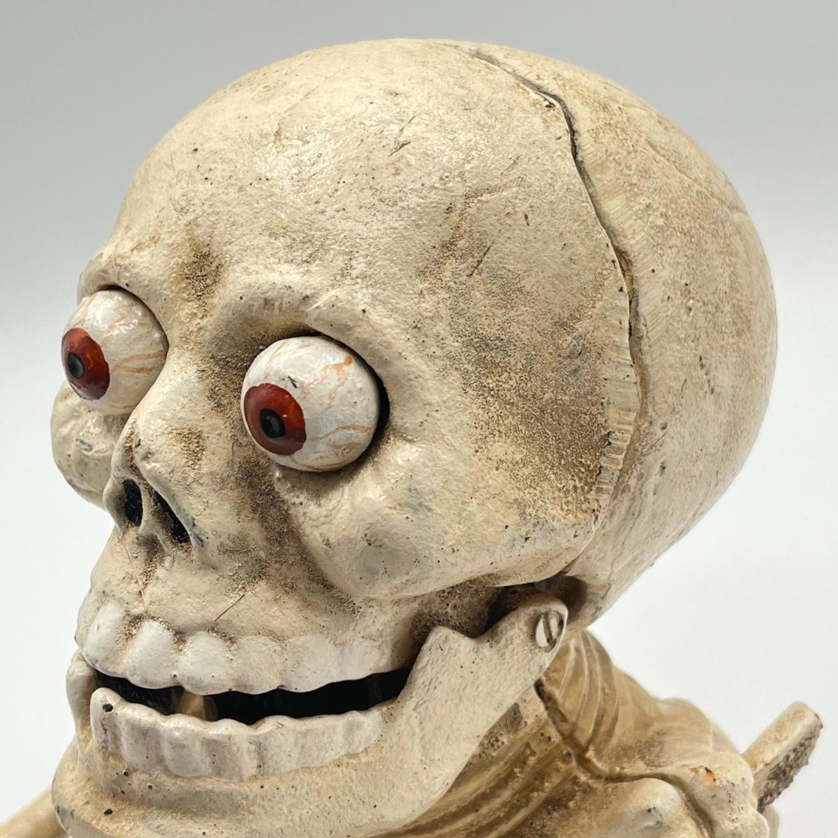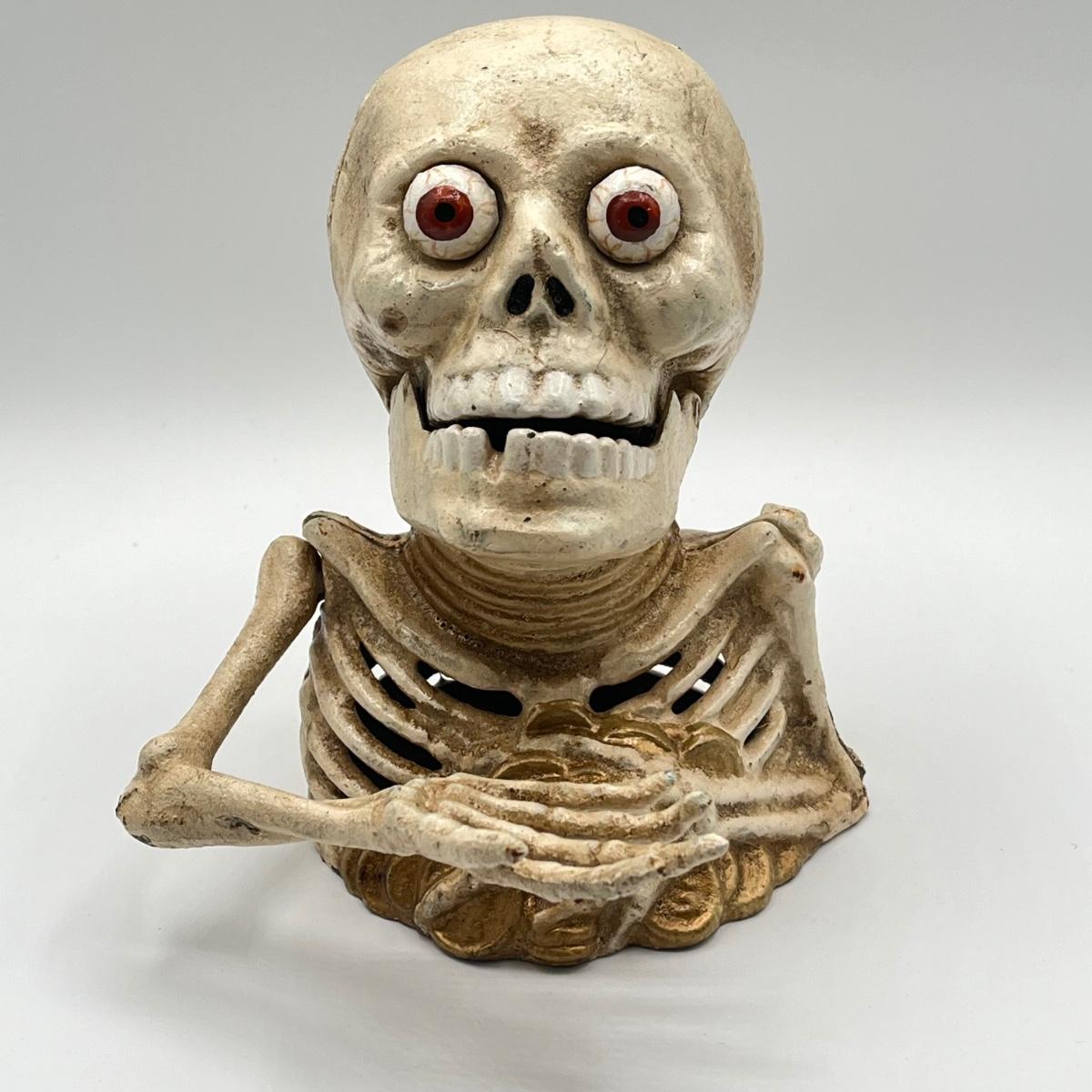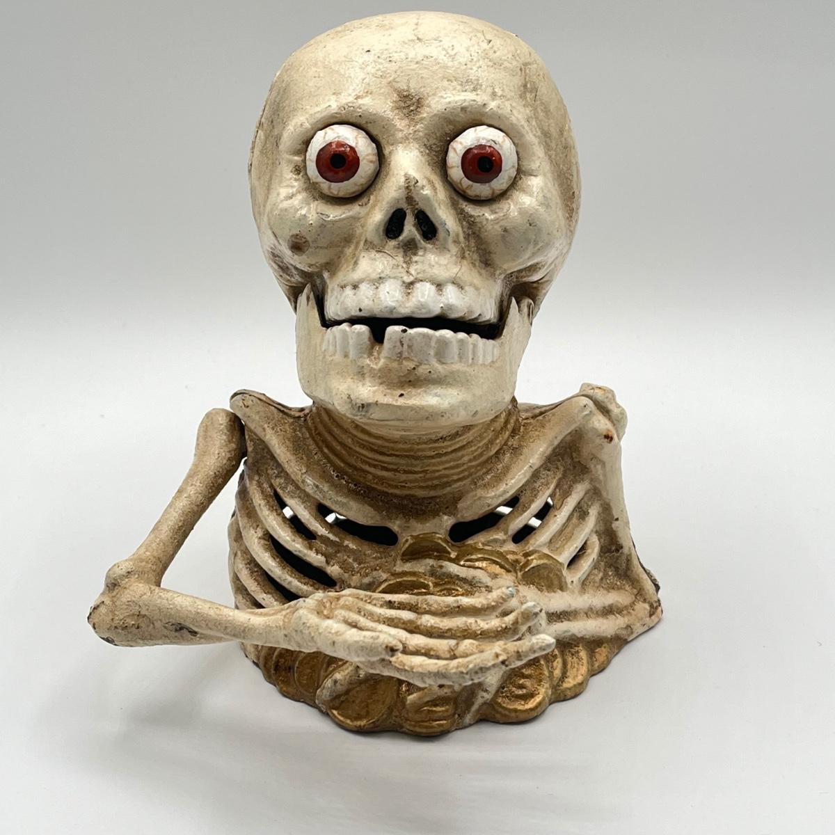 LOT 77F: Vintage 6.5" Cast Iron Mechanical Skeleton Bank - Popping Eyes Skull