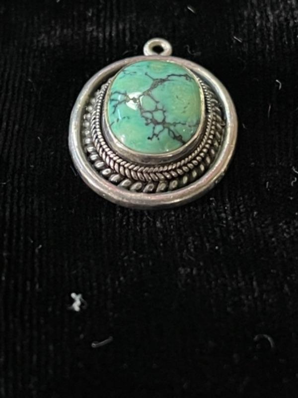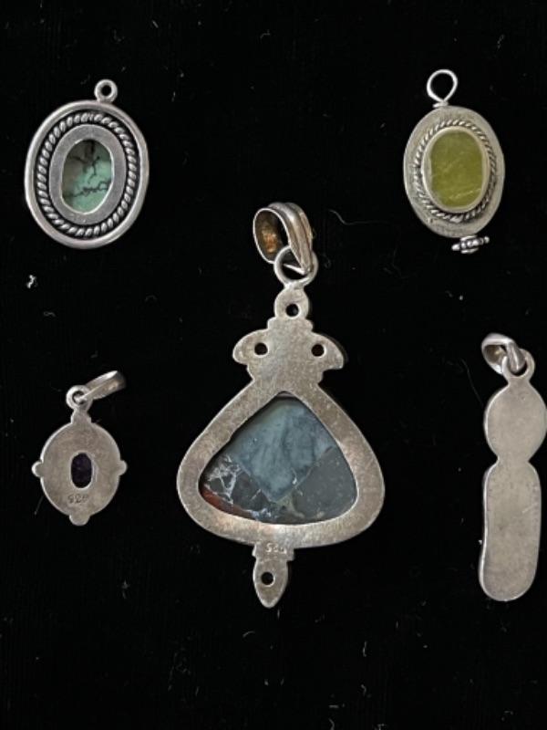 Lot 77LD. Assorted sterling silver and gemstone pendants“”one turquoise, one amethyst, one green stone on both sides, one opalescent stone with long black opalescent, and one multi-gemstone pendant--$75