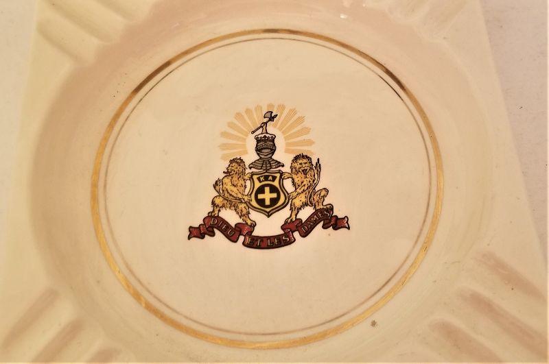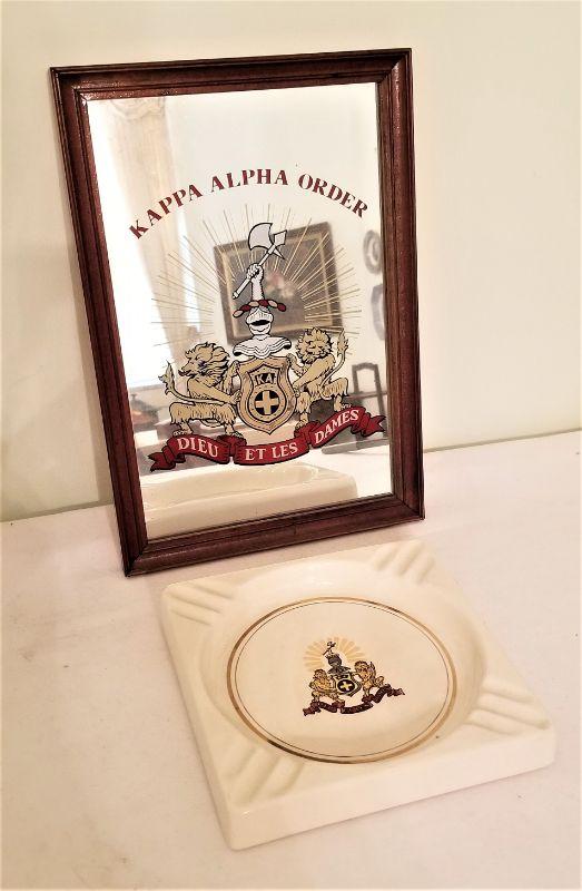 Ah - the venerable Kappa Alpha Fraternity! Here you have a reverse painted mirror with the crest/motto of the organization and an ashtray featuring the same. Mirror is 13" tall. Ashtray measures 7.5" x 7.5" Good condition.