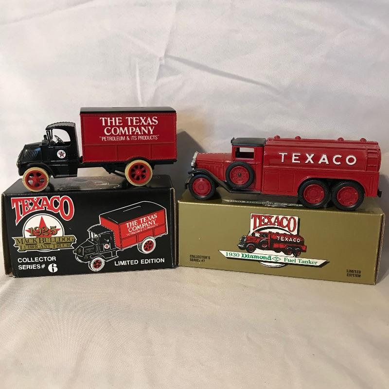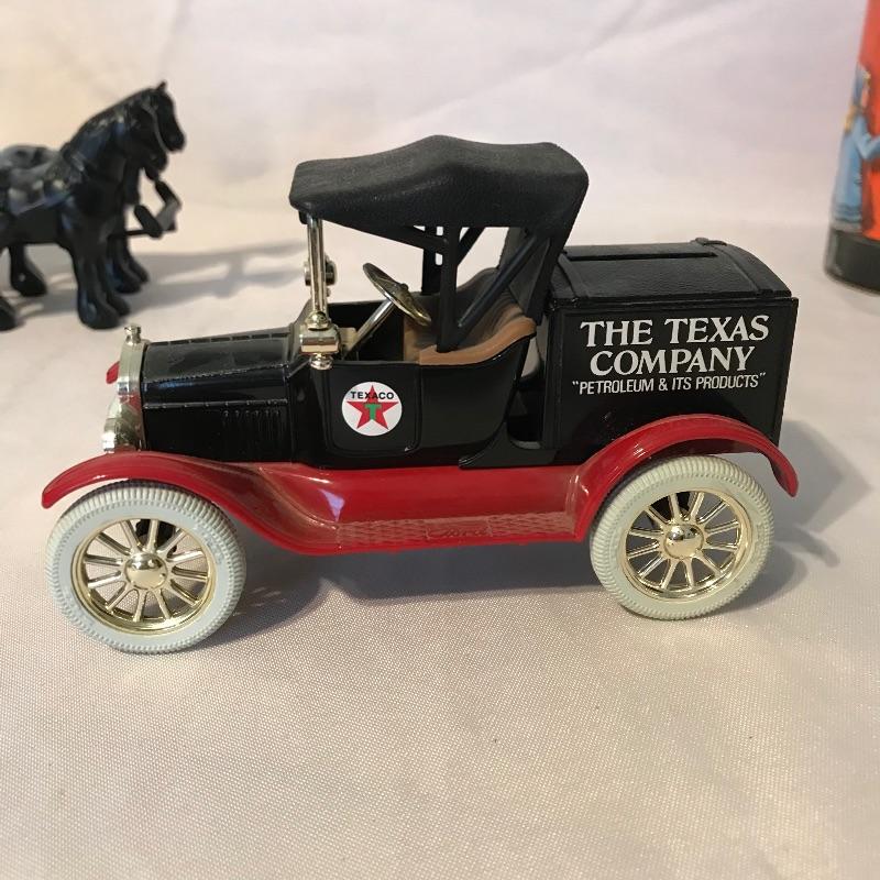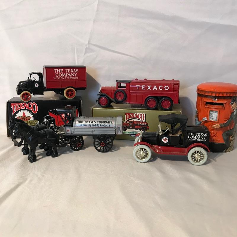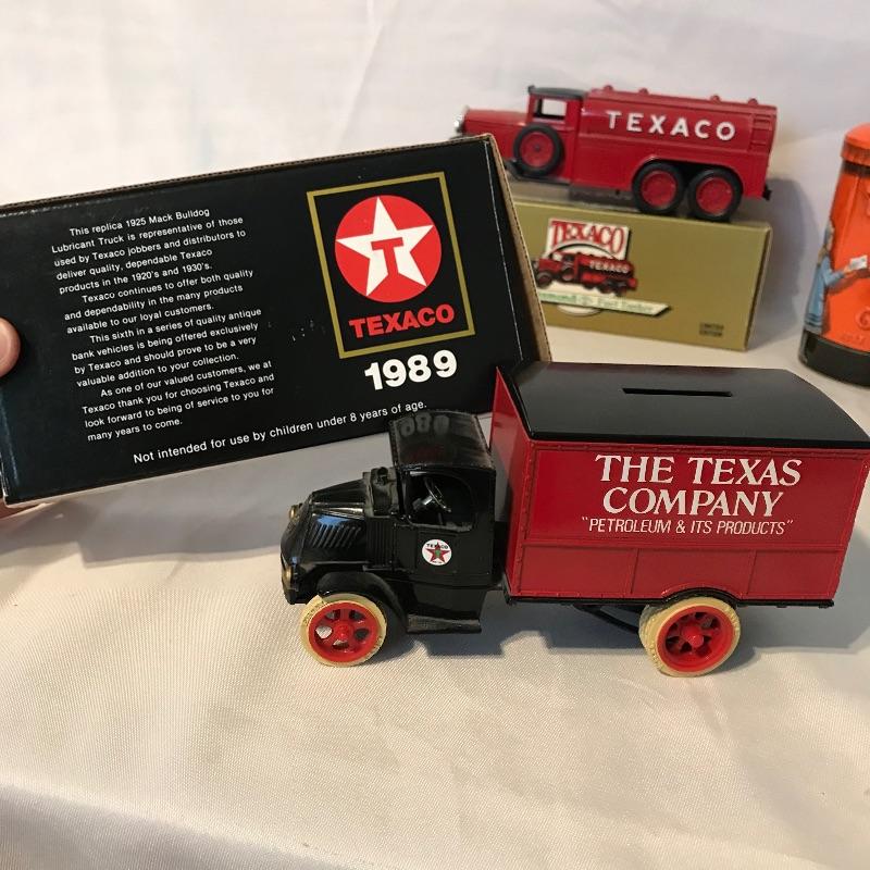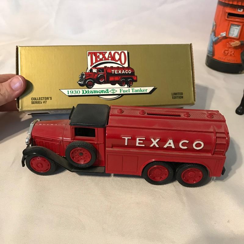 Four Texaco coin banks with keys and one coin bank tin. The Texaco coin banks are metal and plastic, the two with boxes state “Die Cast“. All appear in great condition. The tin is an old sweet treat tin with a familiar scene. At about 3.25”d x 5.25”, it’s perfect for saving all of your pennies. See photos. Shipping available.