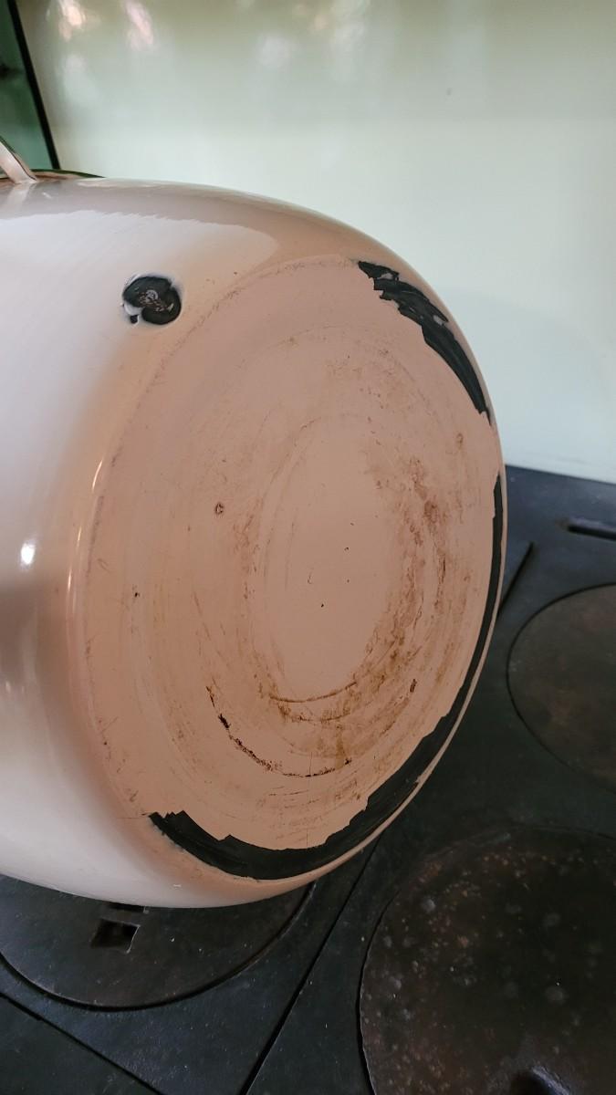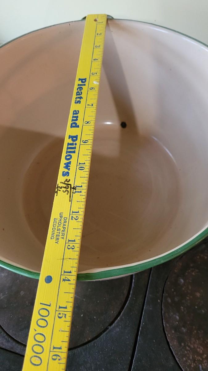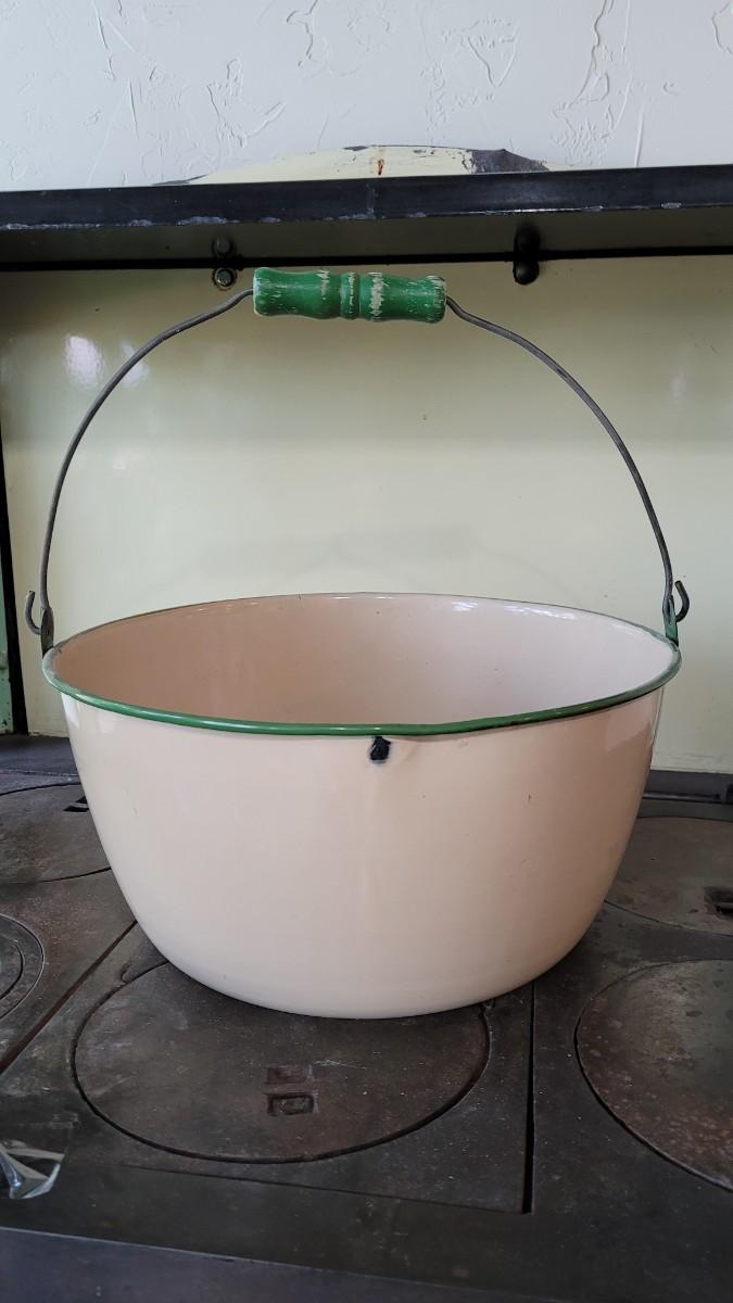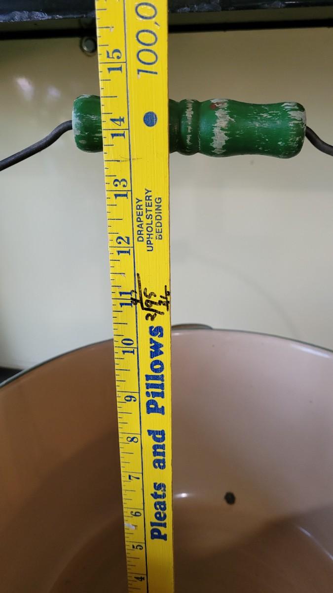 Lot 78: Vintage Ivory with Green Rim Enamelware and Green Wood Handle