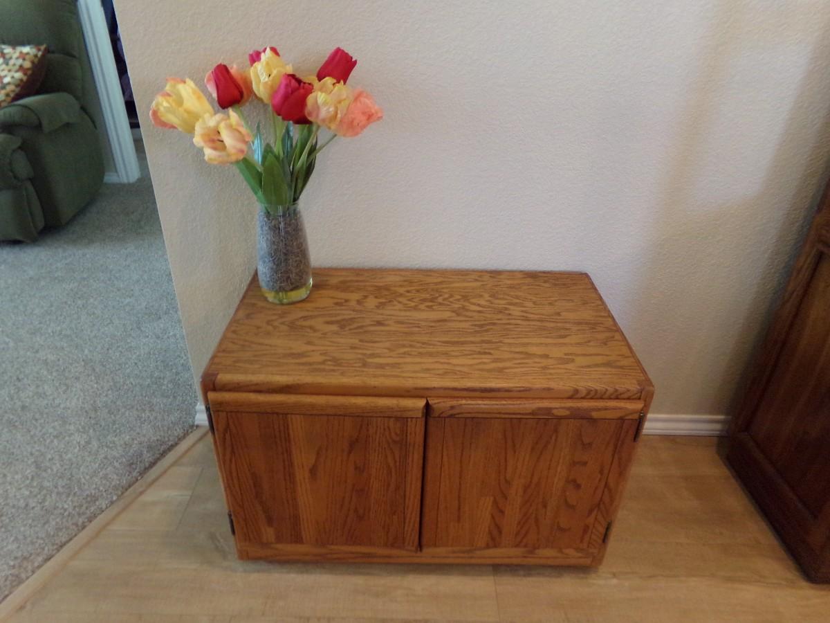 OAK TWO DOOR MULTI - USE CABINET, BOTTOM SHELF PULLS / GLIDES OUTWARD FOR EASY ACCESS, WITH VASE OF BEAUTIFUL FAUX FLOWERS. CABINET MEASURES 19-1/4"H x 30"W x 18"D