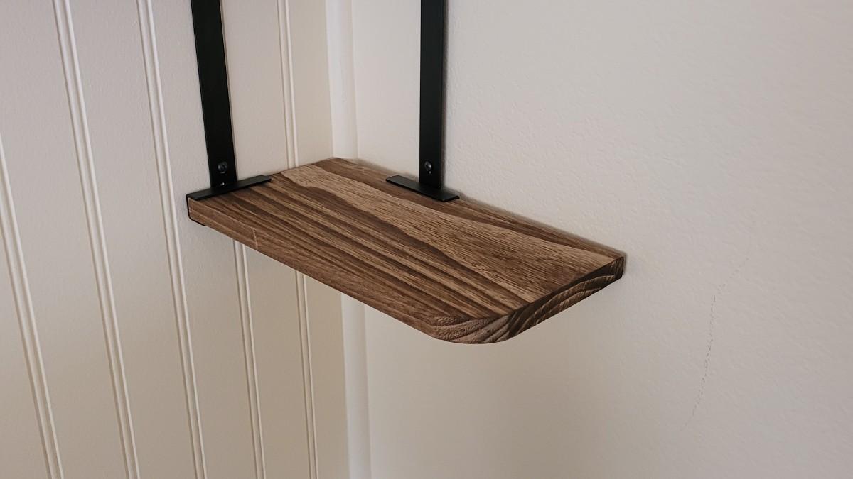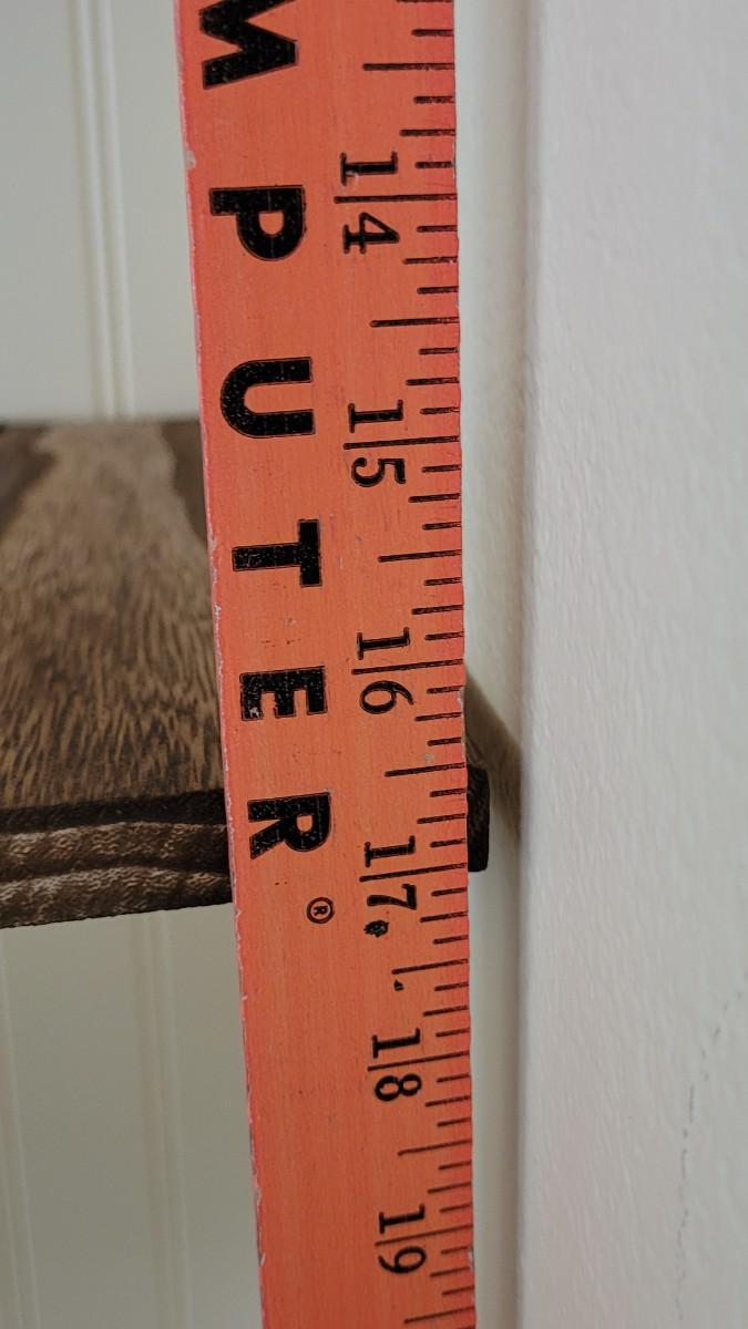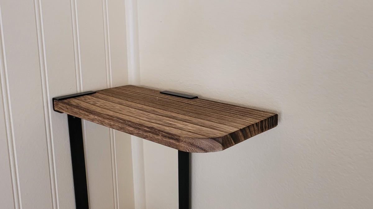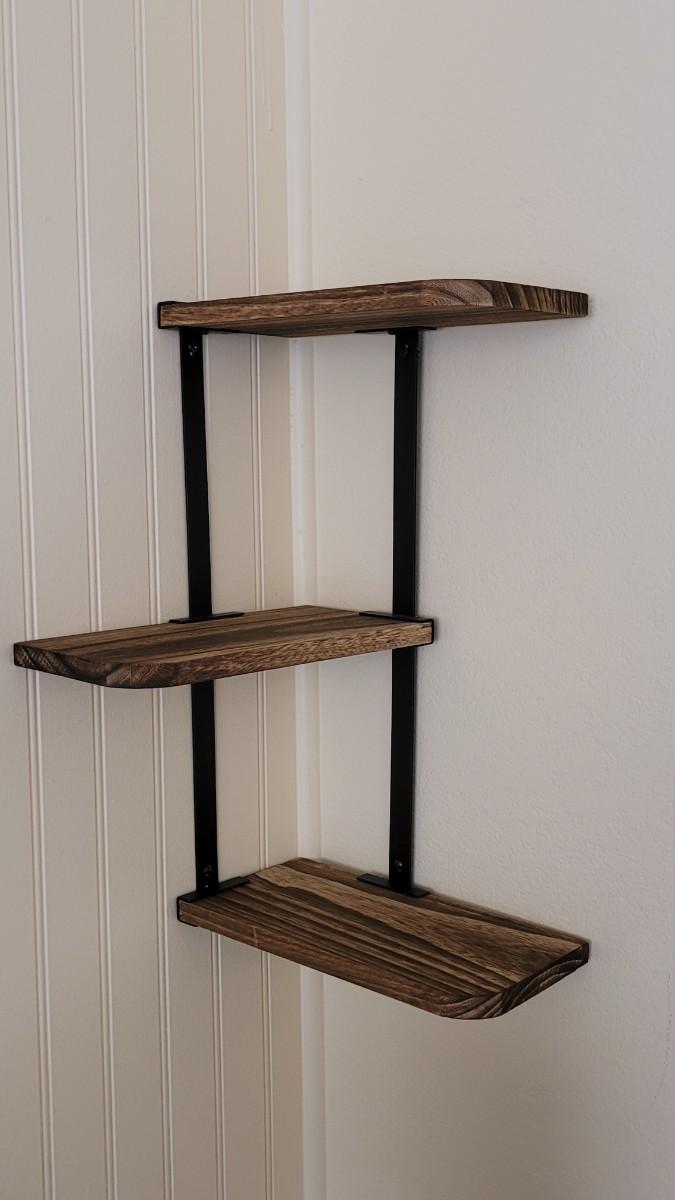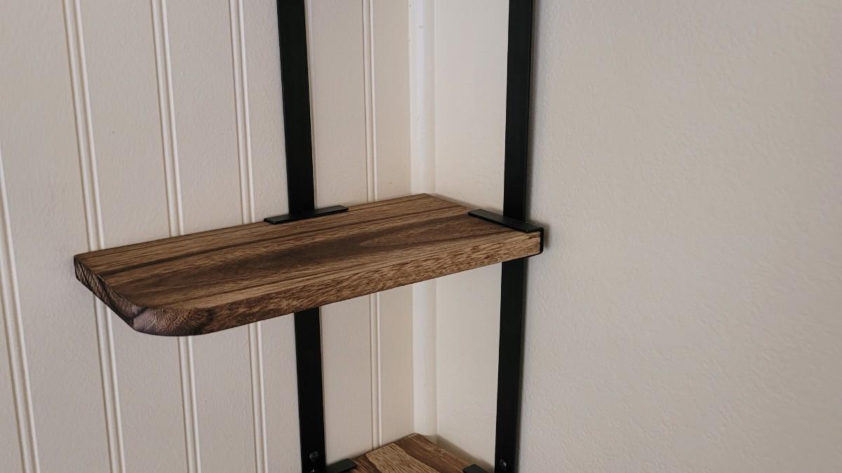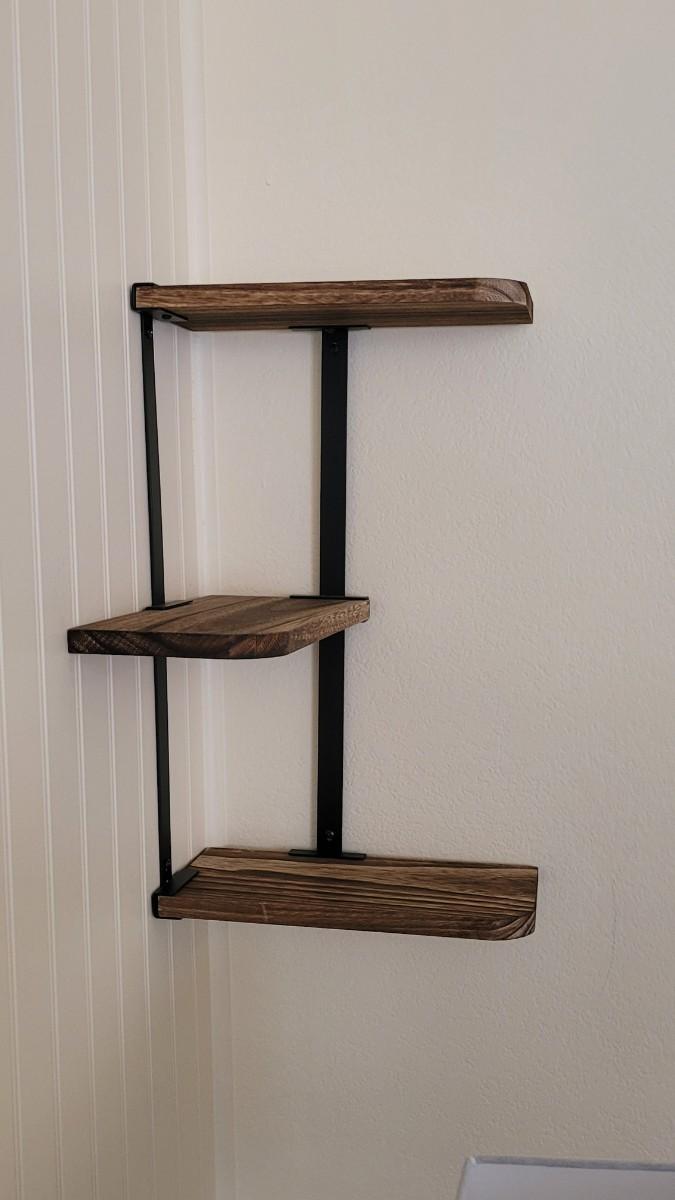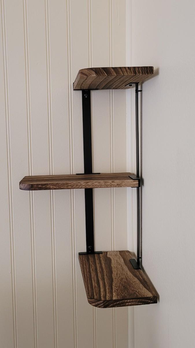 In nice condition. This is a hanging metal and wood shelf. The design really hugs both walls with shelves face different directions.
