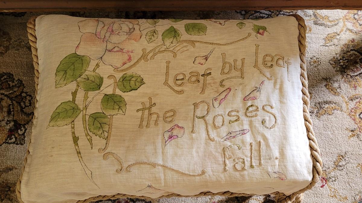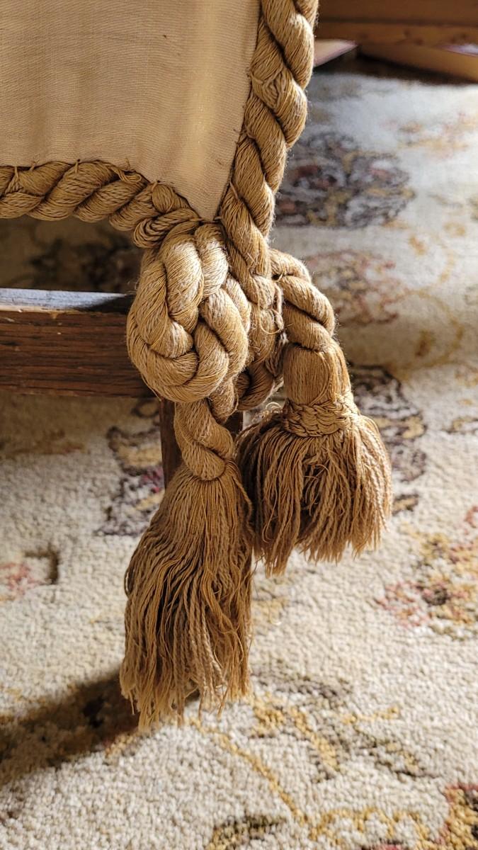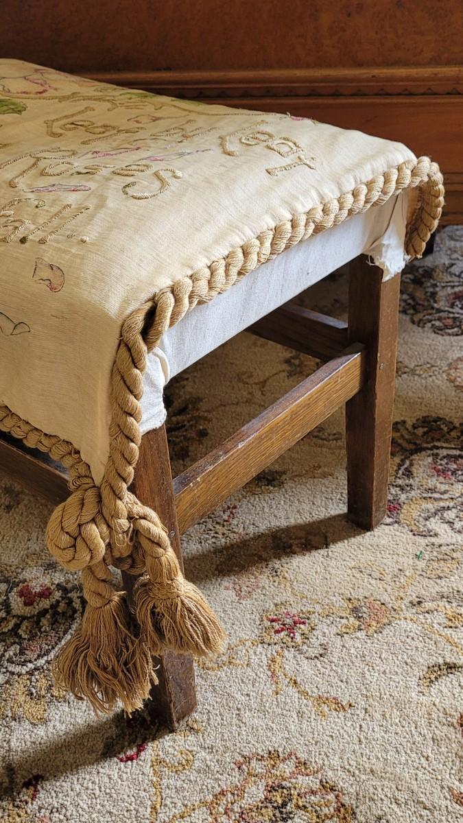 This is an old stool with an Antique/Vintage partially hand stitched Pillow Case with a rope tassel. The pillowcase is not connected to the stool.