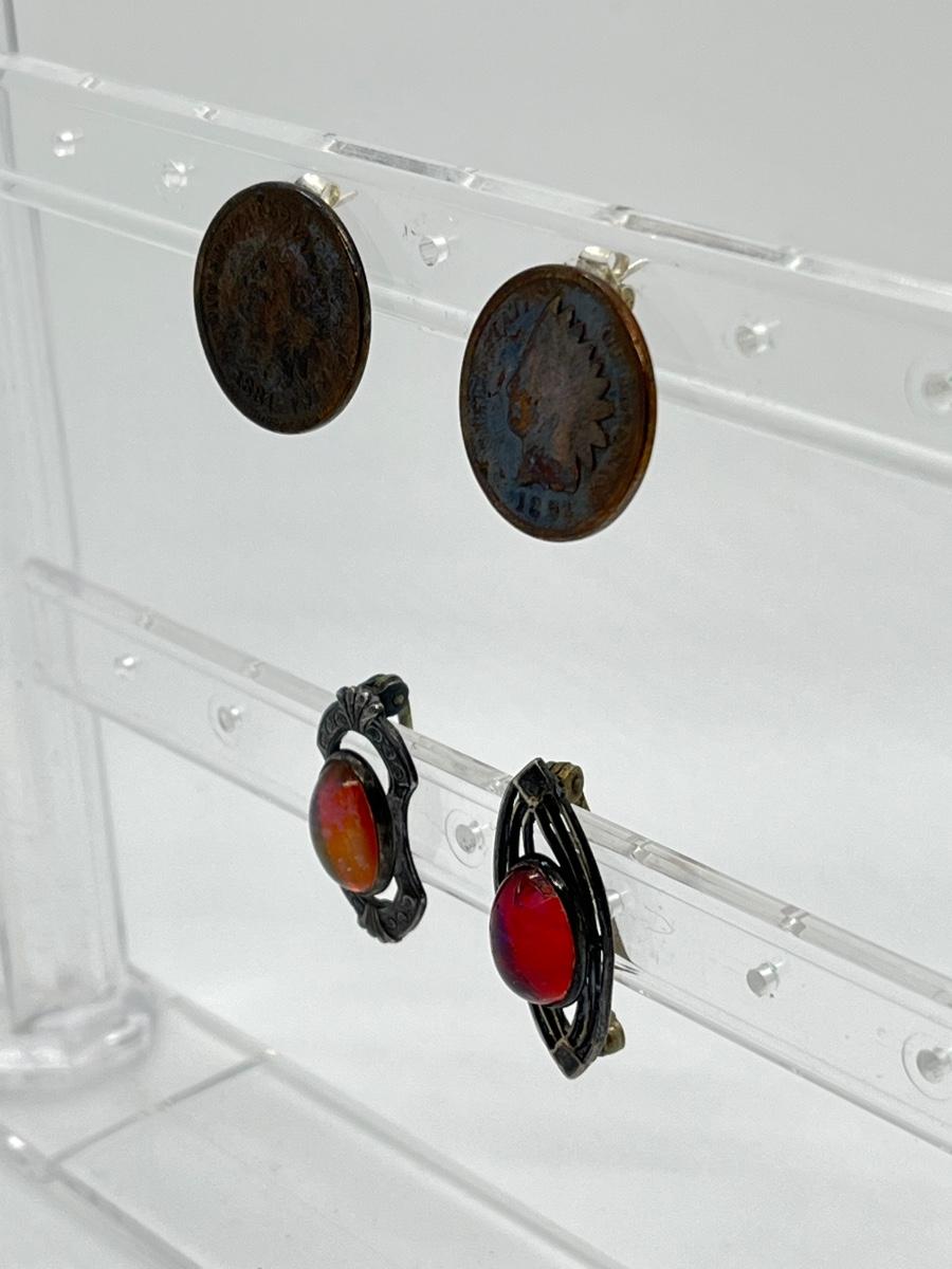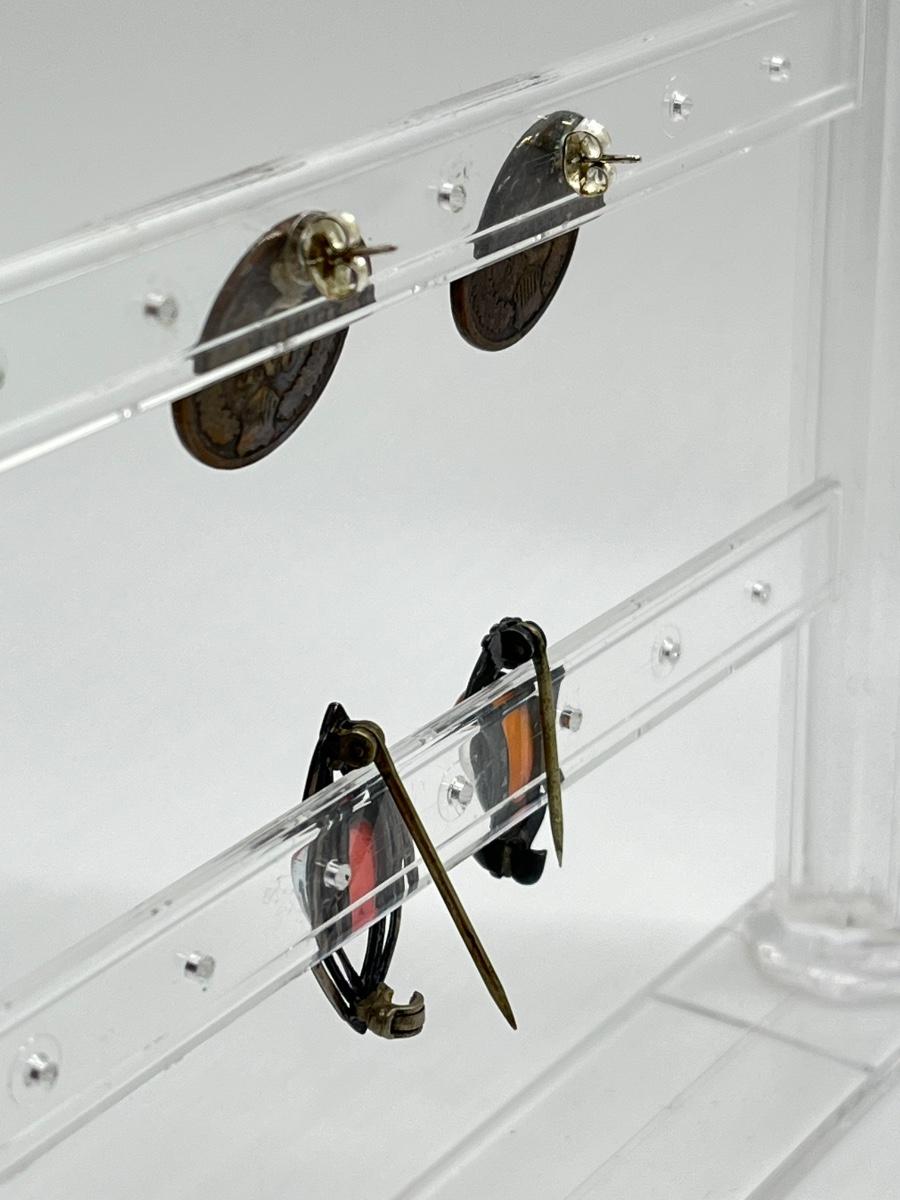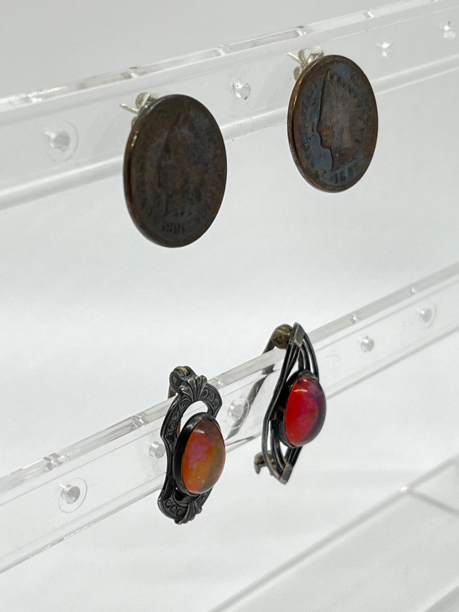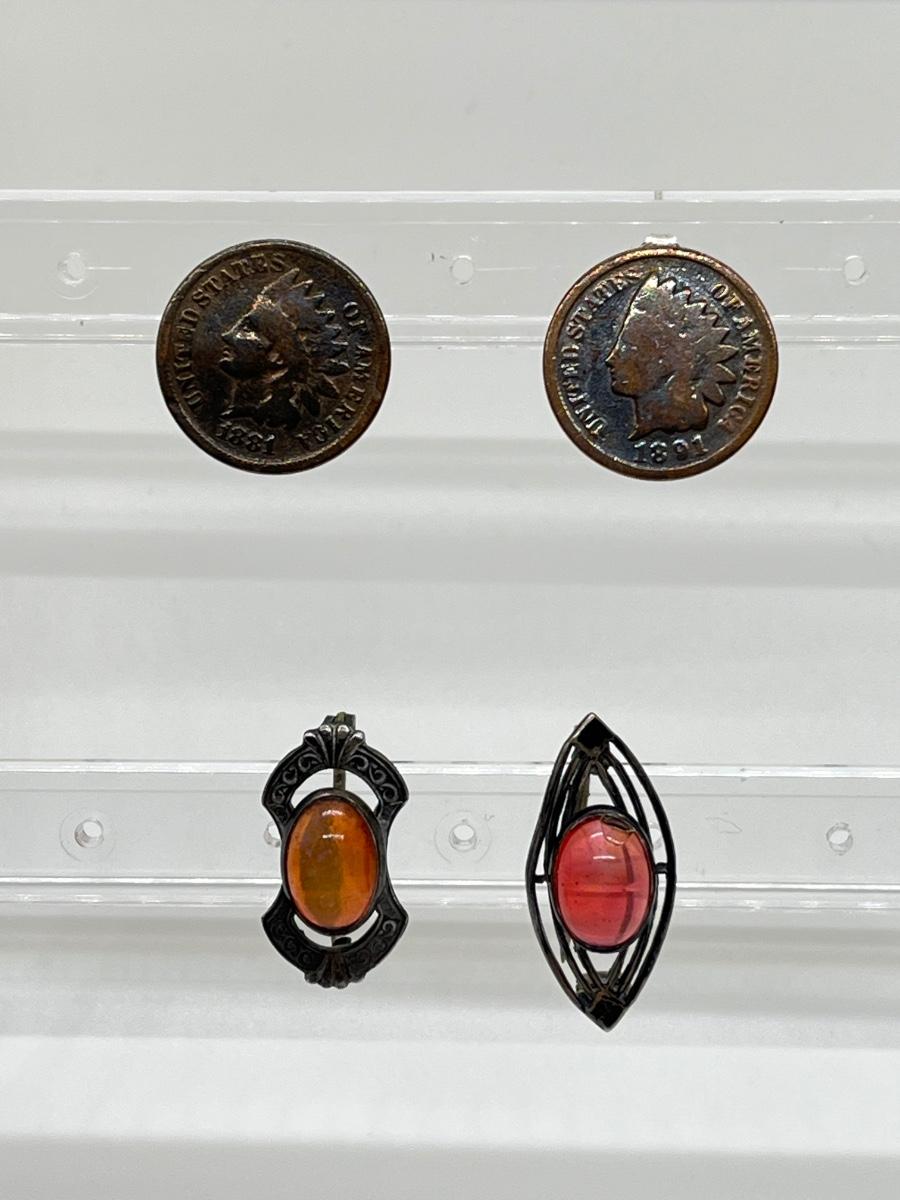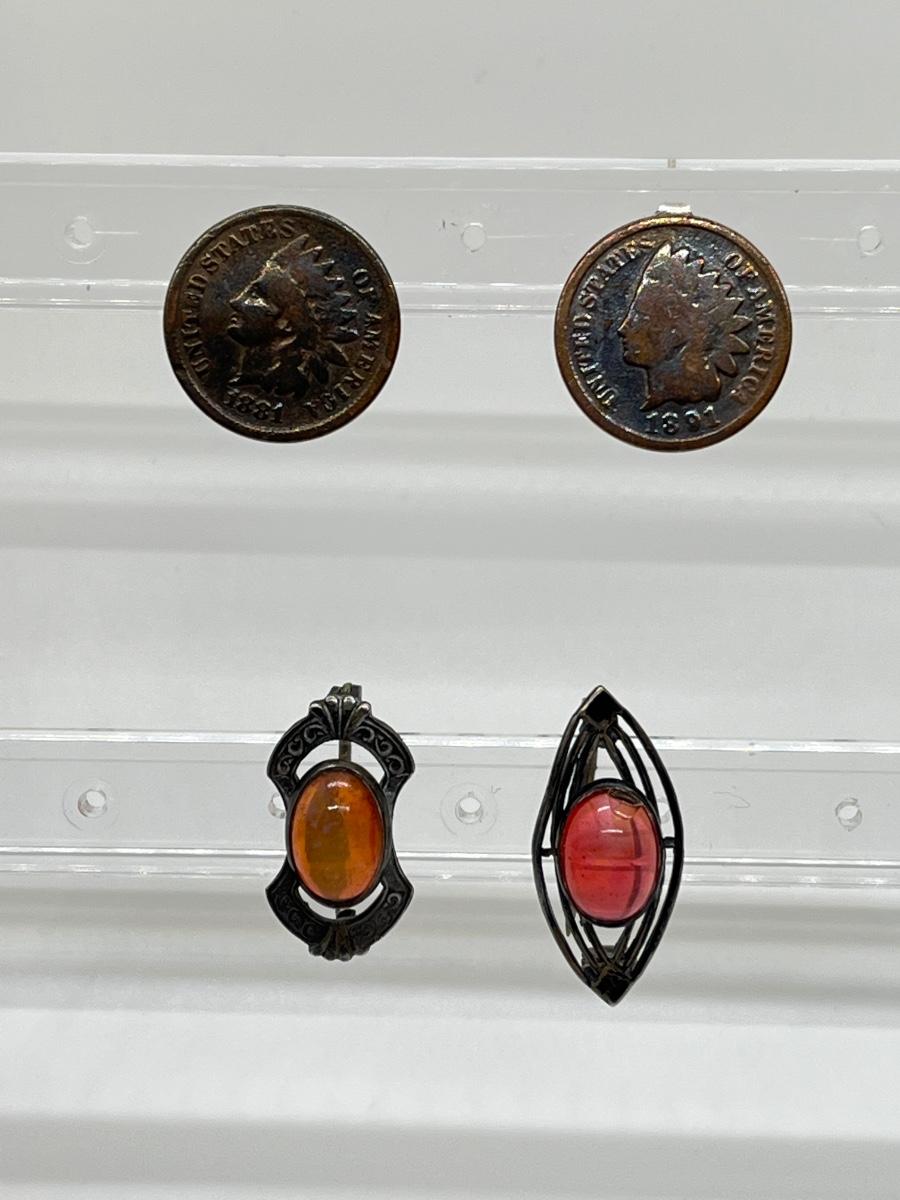 LOT 78: Vintage - Possibly Pink Amber Collar Pins and Handmade Indian Head Copper Penny Pierced Earrings