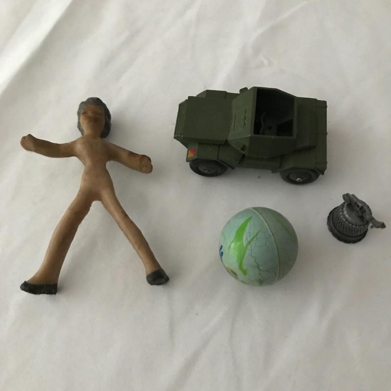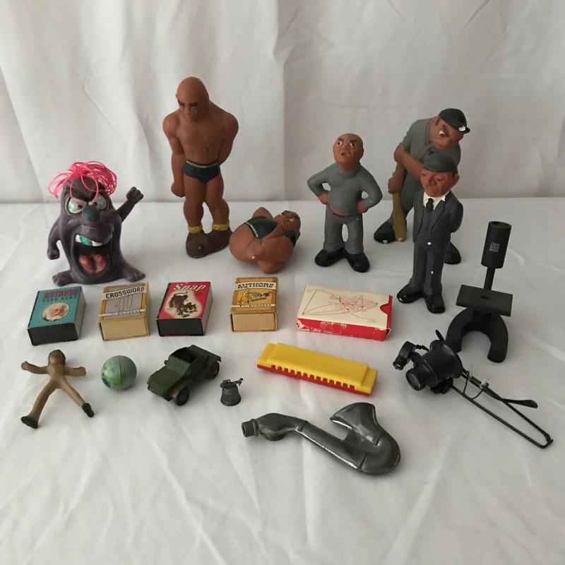 This unique lot includes 5 Lafayette L. Rittgers figurines, four mini card games, a Western Airlines deck of playing cards, and assorted used toys. See pics for details and wear. Shipping available or local pickup in Asheville, NC.