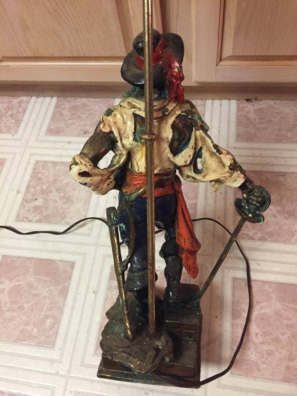 LOT #78. Antique very heavy bronze or brass pirate lamp, painted. Paint is peeling off, no shade. I believe it is bronze. It appears to be very old. Pirate is approx 18” tall, lamp to top of harp is 33-1/3” tall. Very cool item!