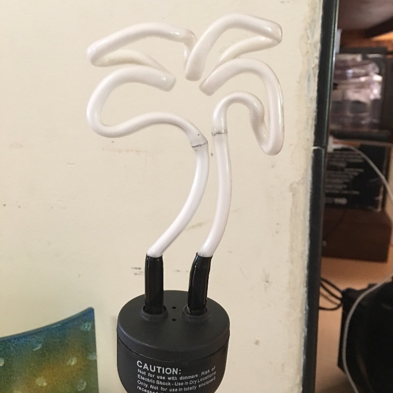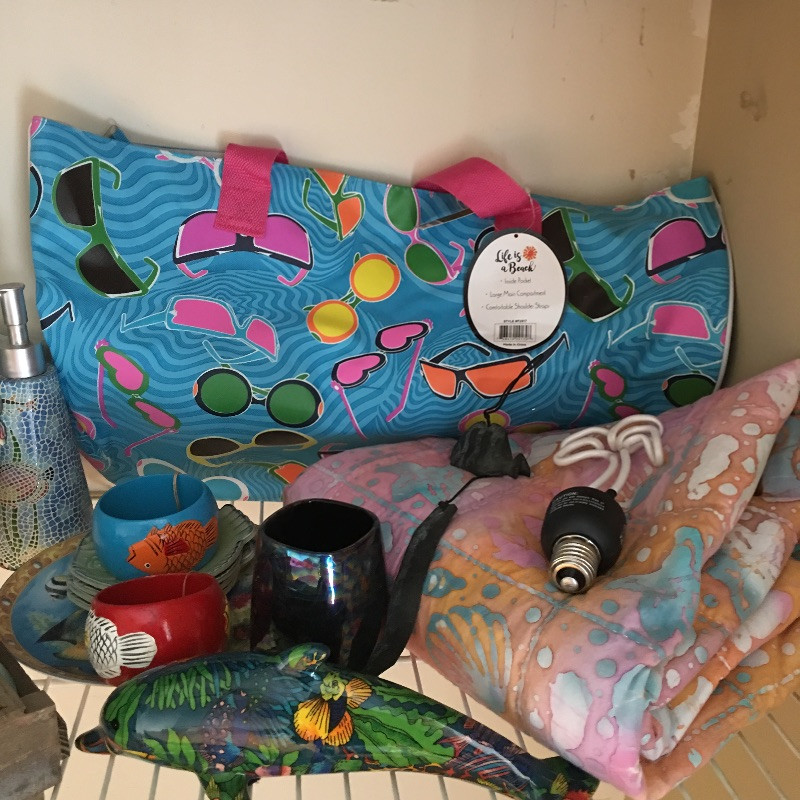 Bring the beach to your house with this nice array of beach inspired bric a brac that includes a palm tree light bulb, lamp not included, plates, towels, place mats, dolphin figurine, beach bag, soap dispenser, candle and more.