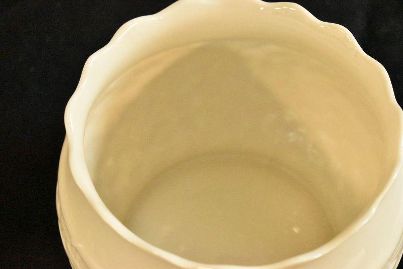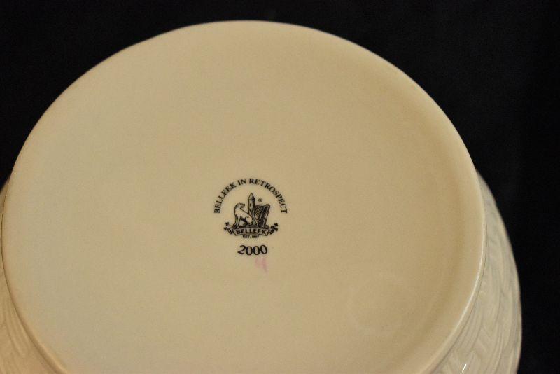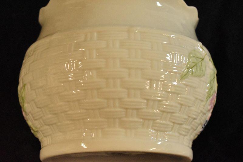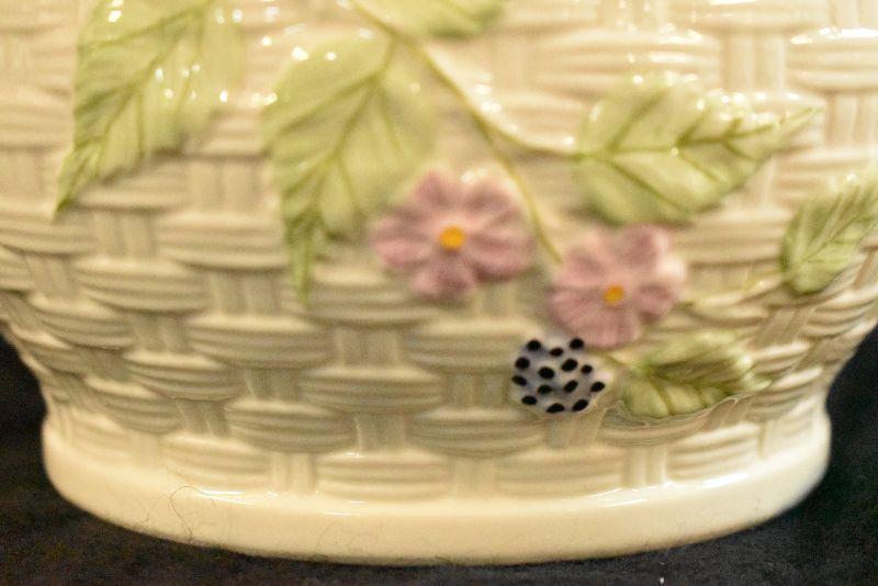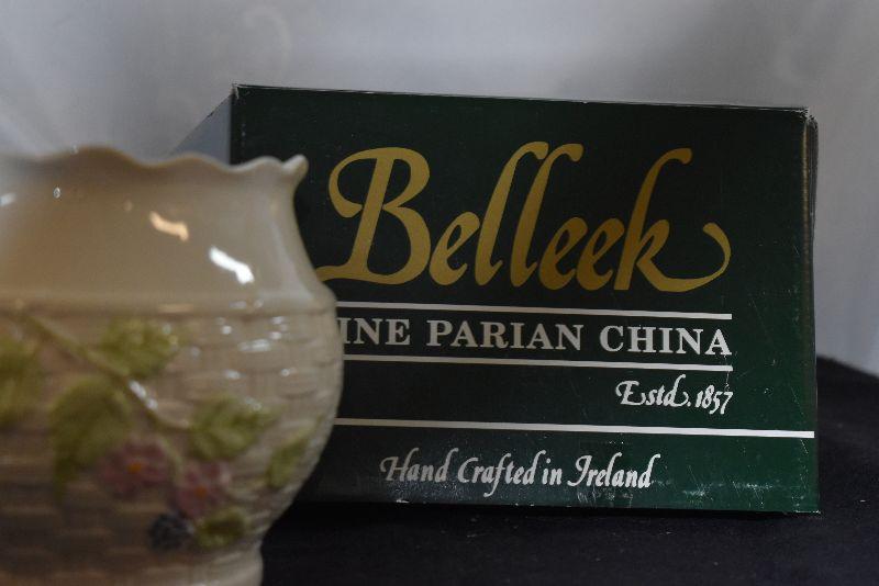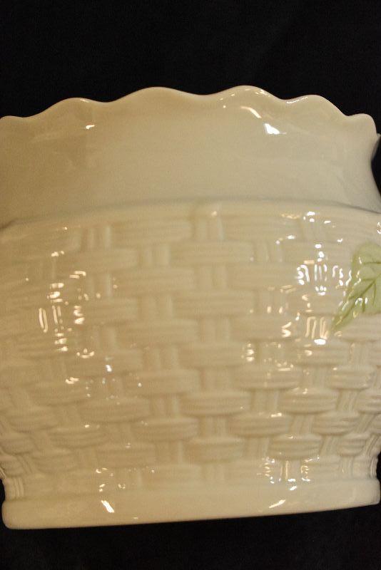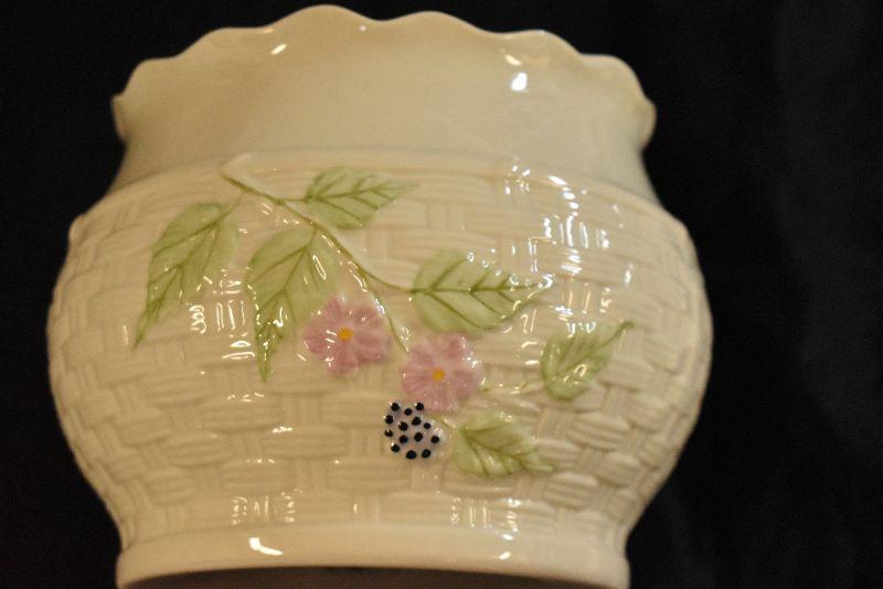 Basket weave design planter by Belleek of Ireland, from the Summer Briar collection. In original box. 5 inches tall.
